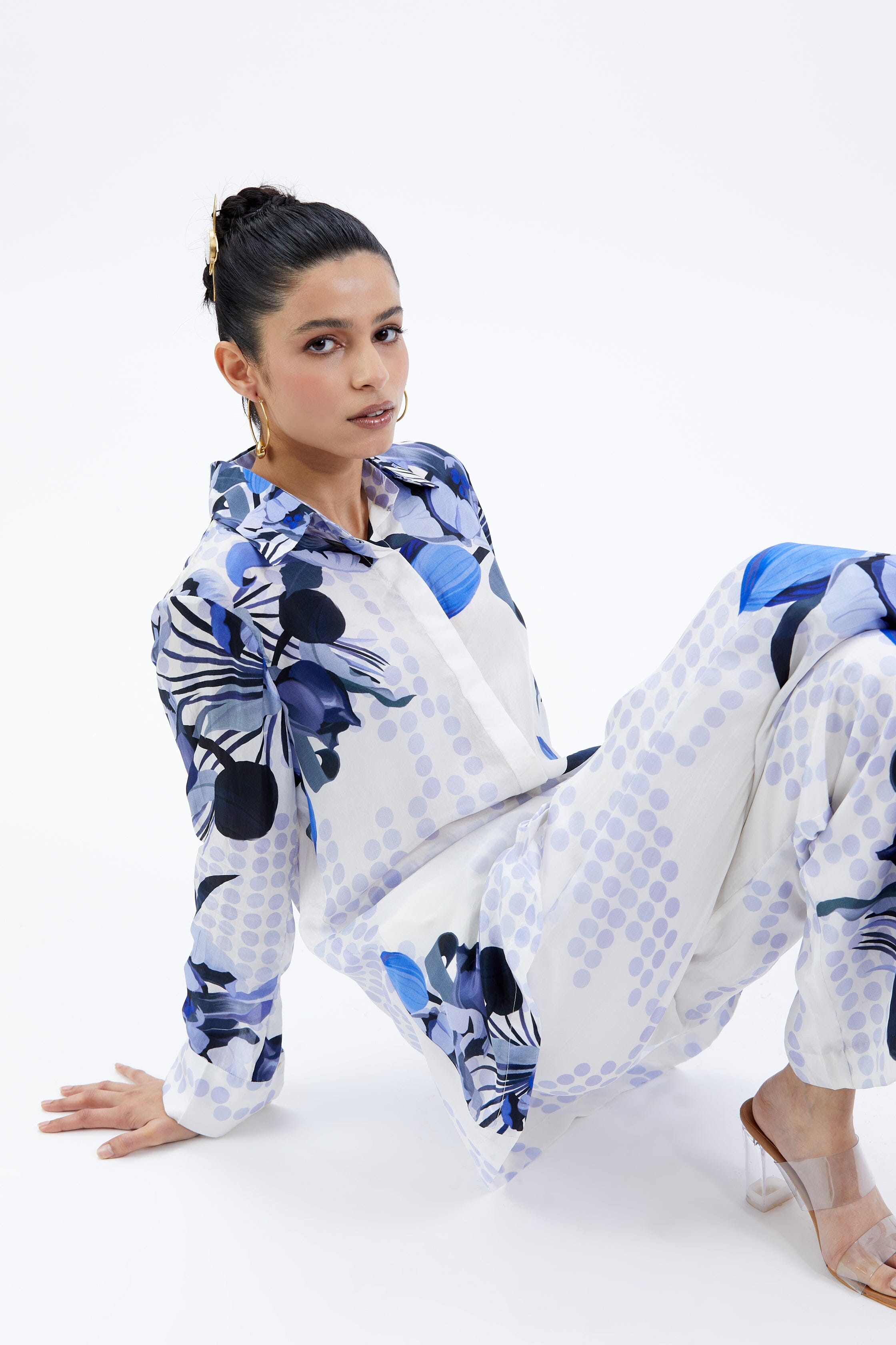 Botánicos en azul, colocados sobre una cómoda camisa sin complicaciones.