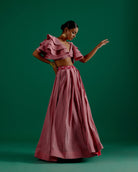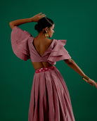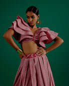 Mostrando un cautivador top corto rosa con detalles refinados.