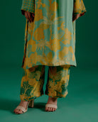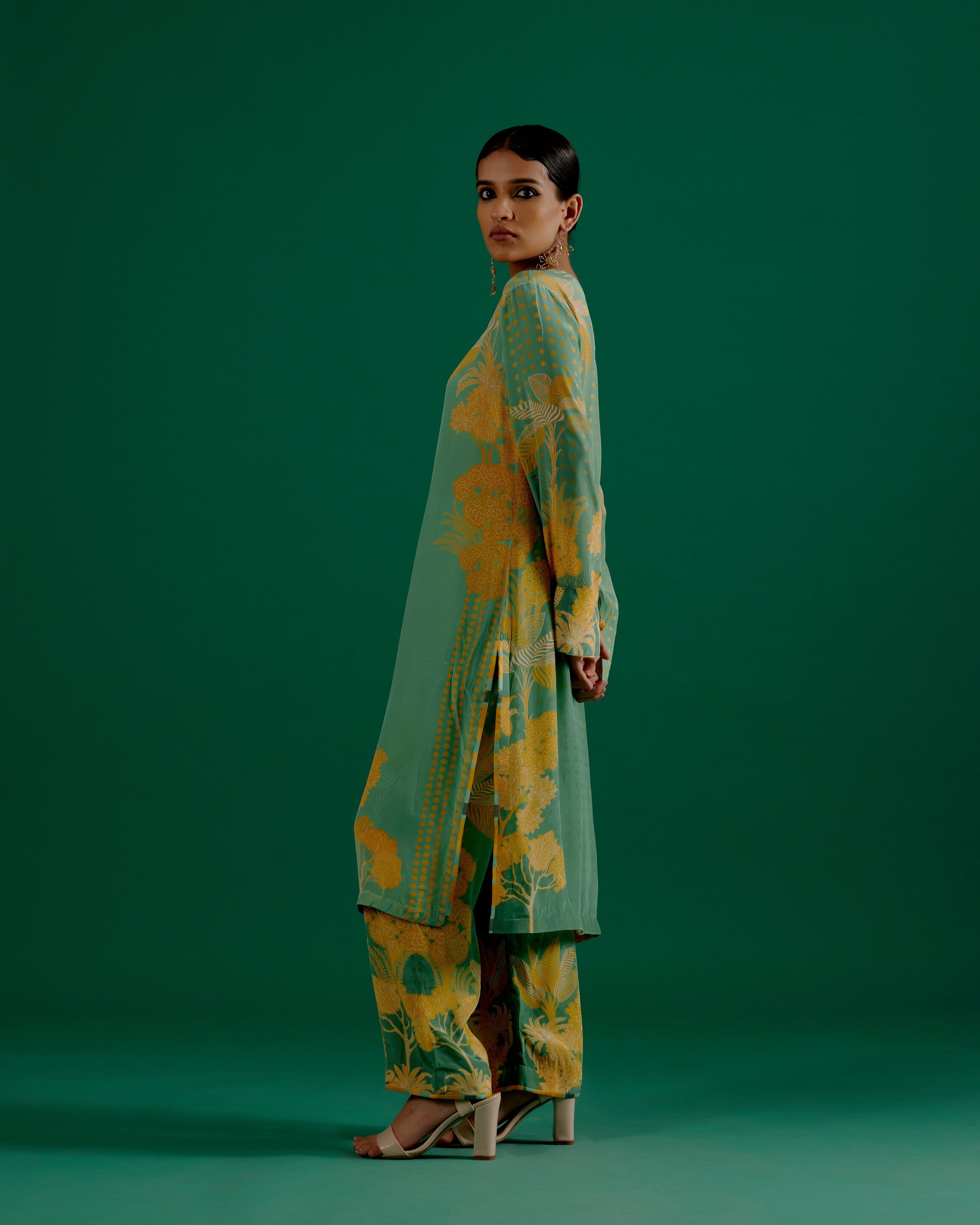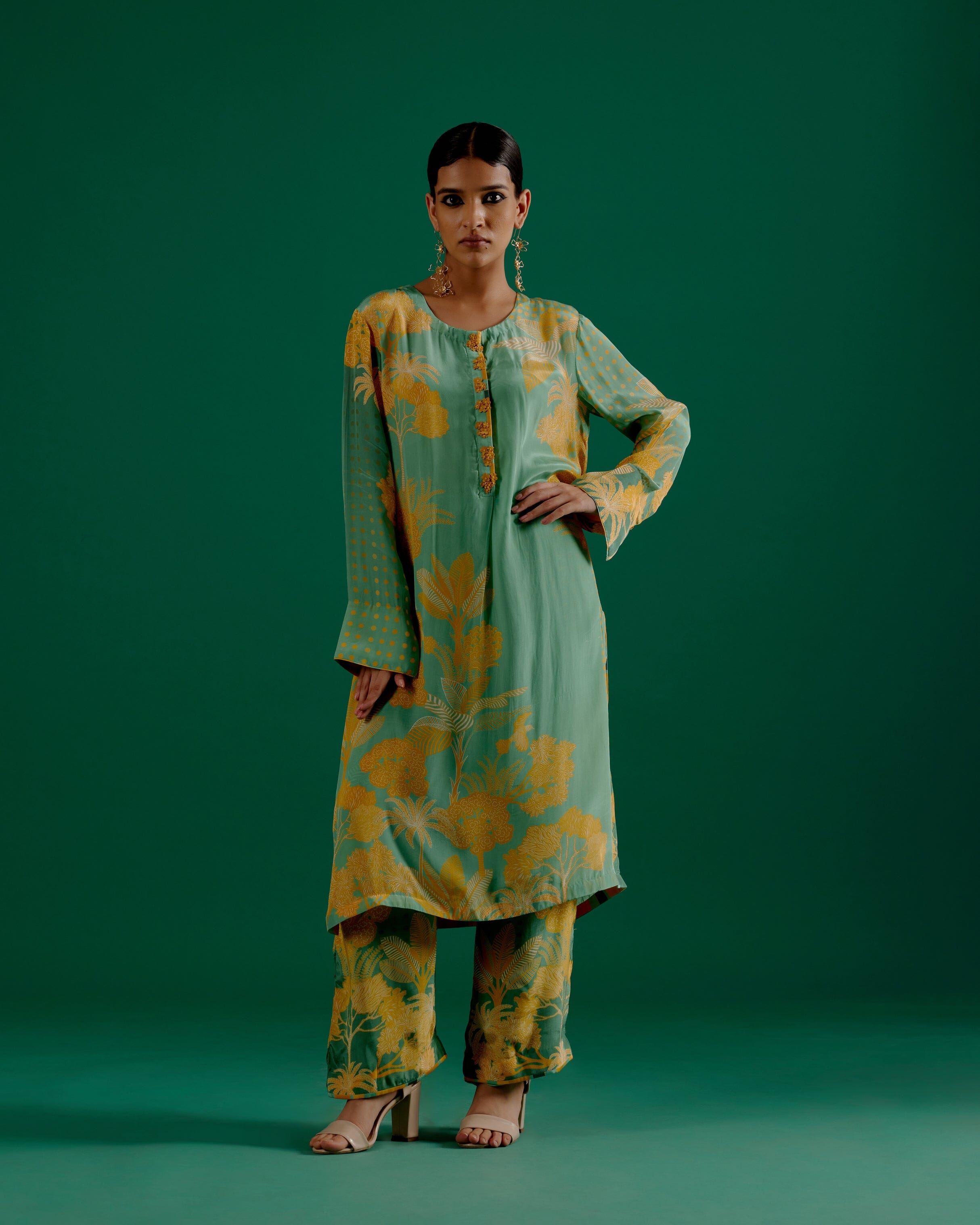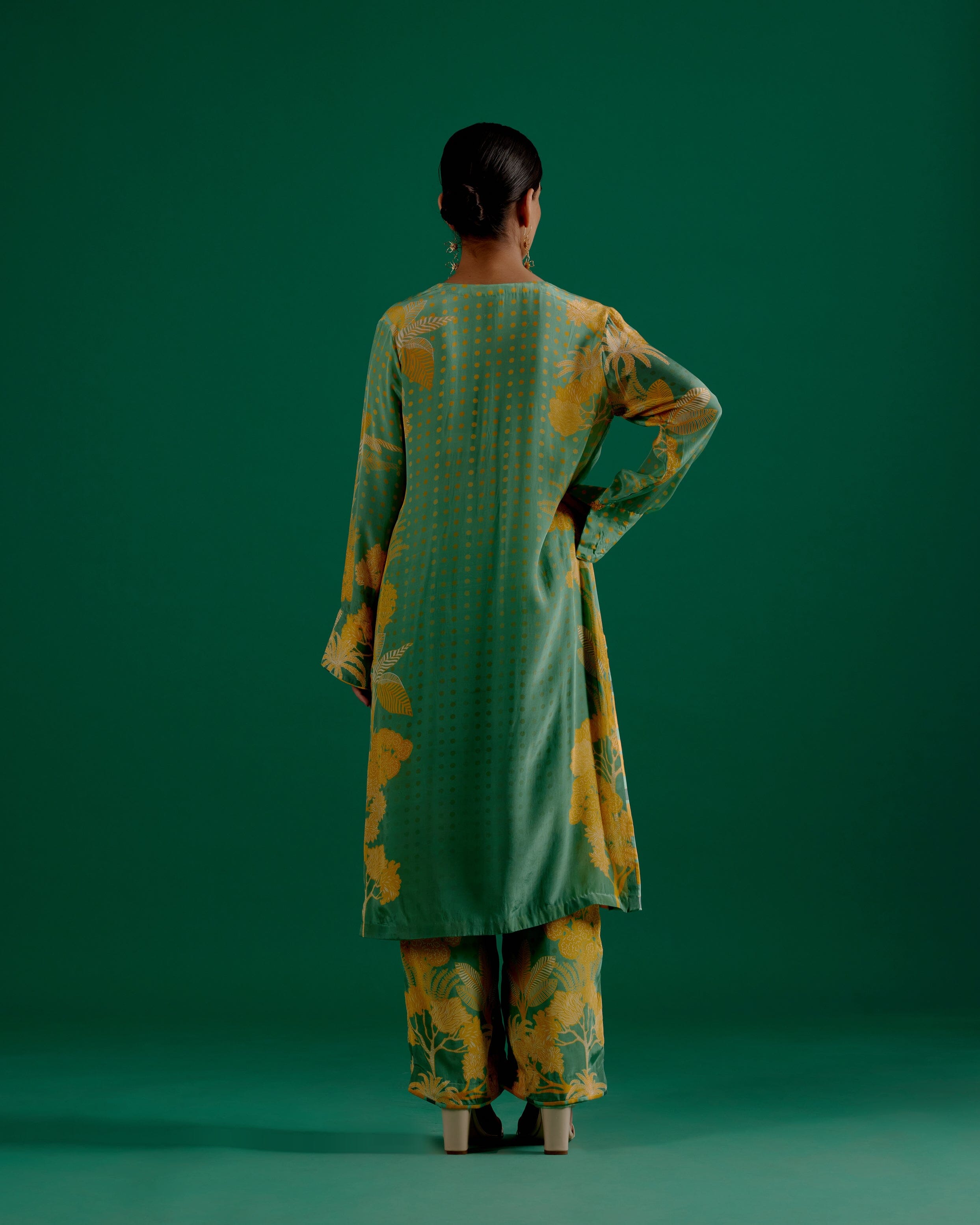 Sumérgete en un conjunto verde pastel que presenta sutiles