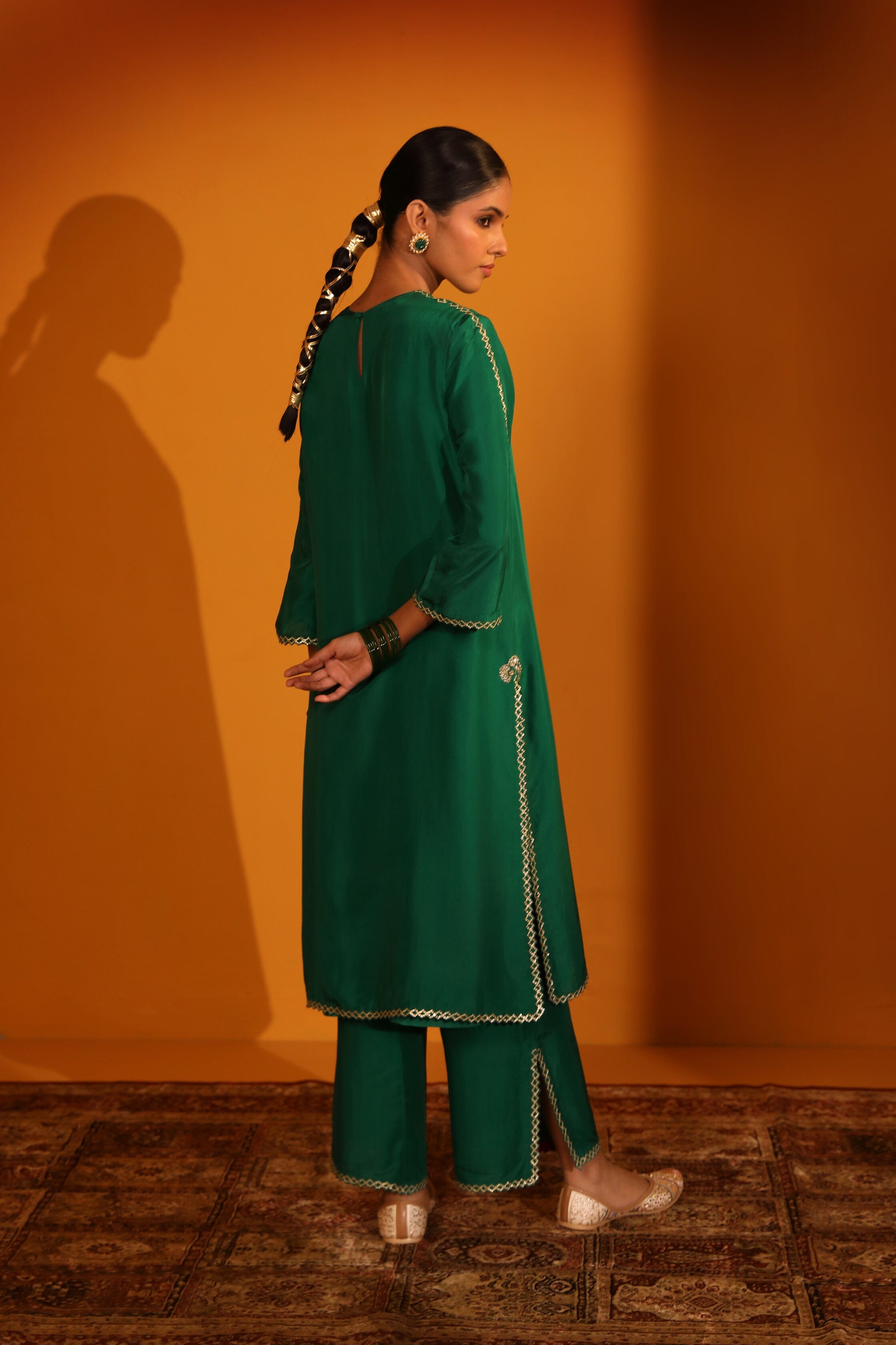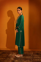 Este conjunto de pantalón kurta verde esmeralda, visualmente atractivo y reconfortante, está hecho de seda y presenta un impecable trabajo naqshi. El conjunto presenta intrincados detalles dorados y plateados sobre una tela verde esmeralda, creando una vista cautivadora. Completa tu look con una hermosa dupatta de organza verde esmeralda.