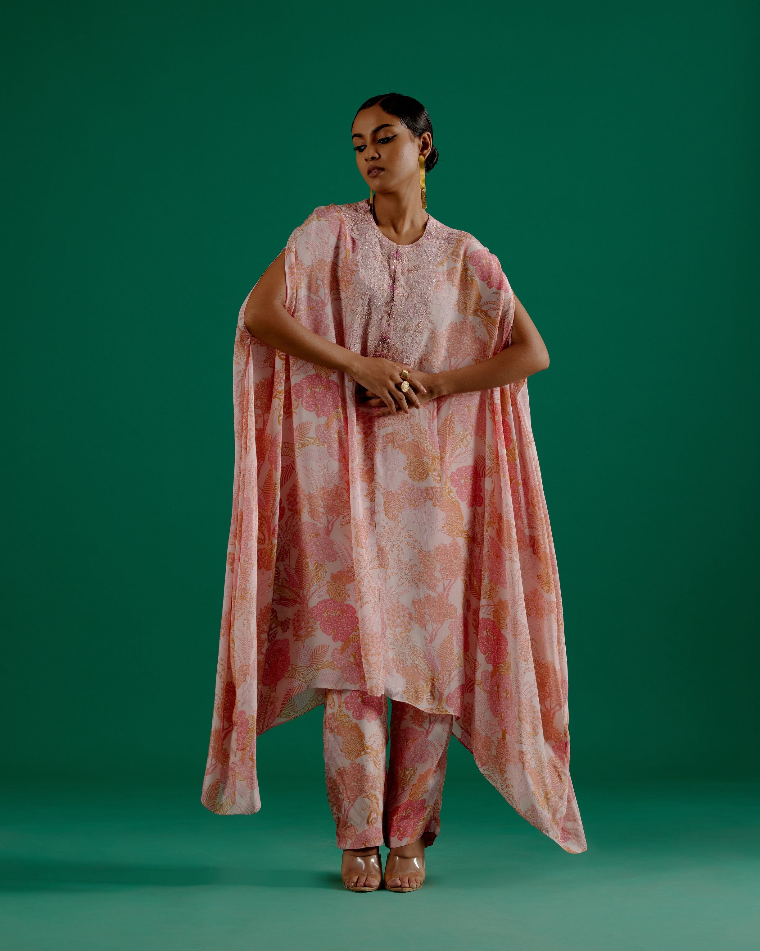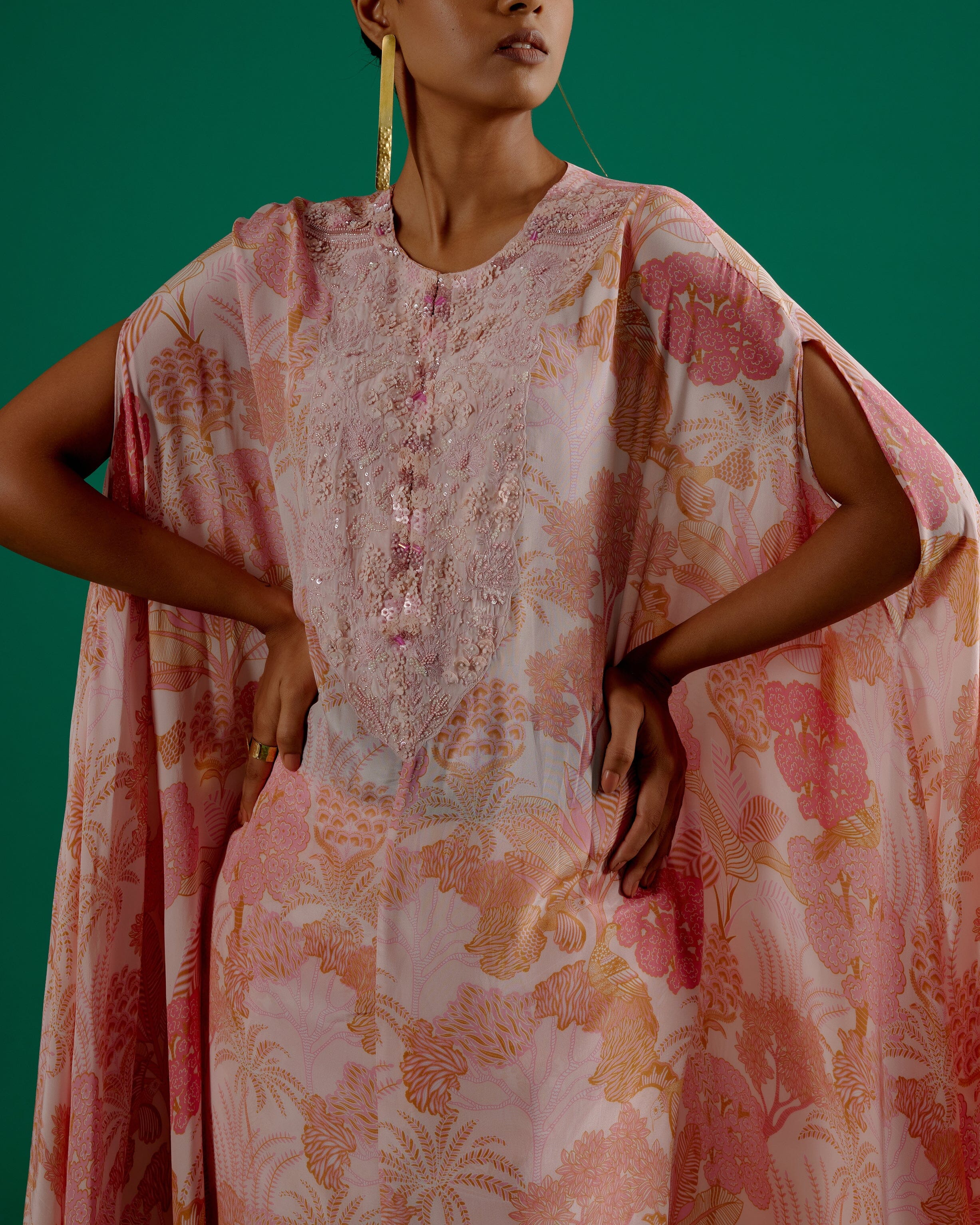 Un fascinante conjunto de caftaan adornado con intrincados detalles hechos a mano.