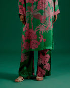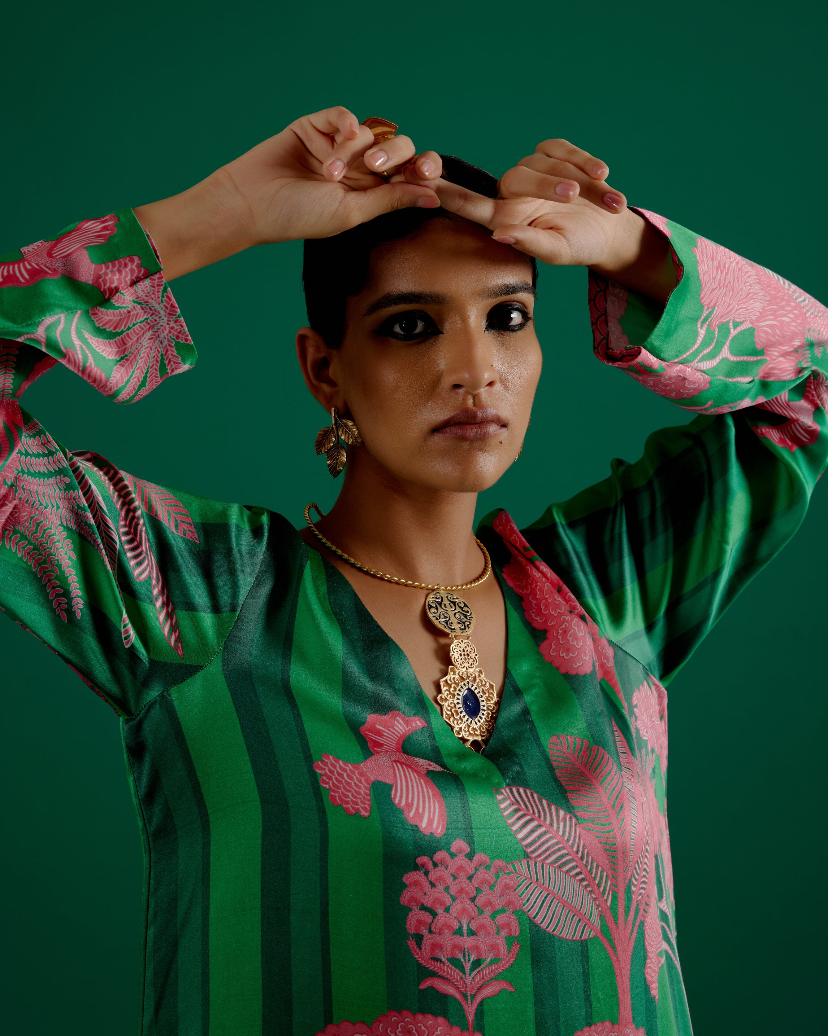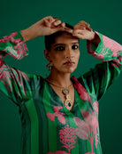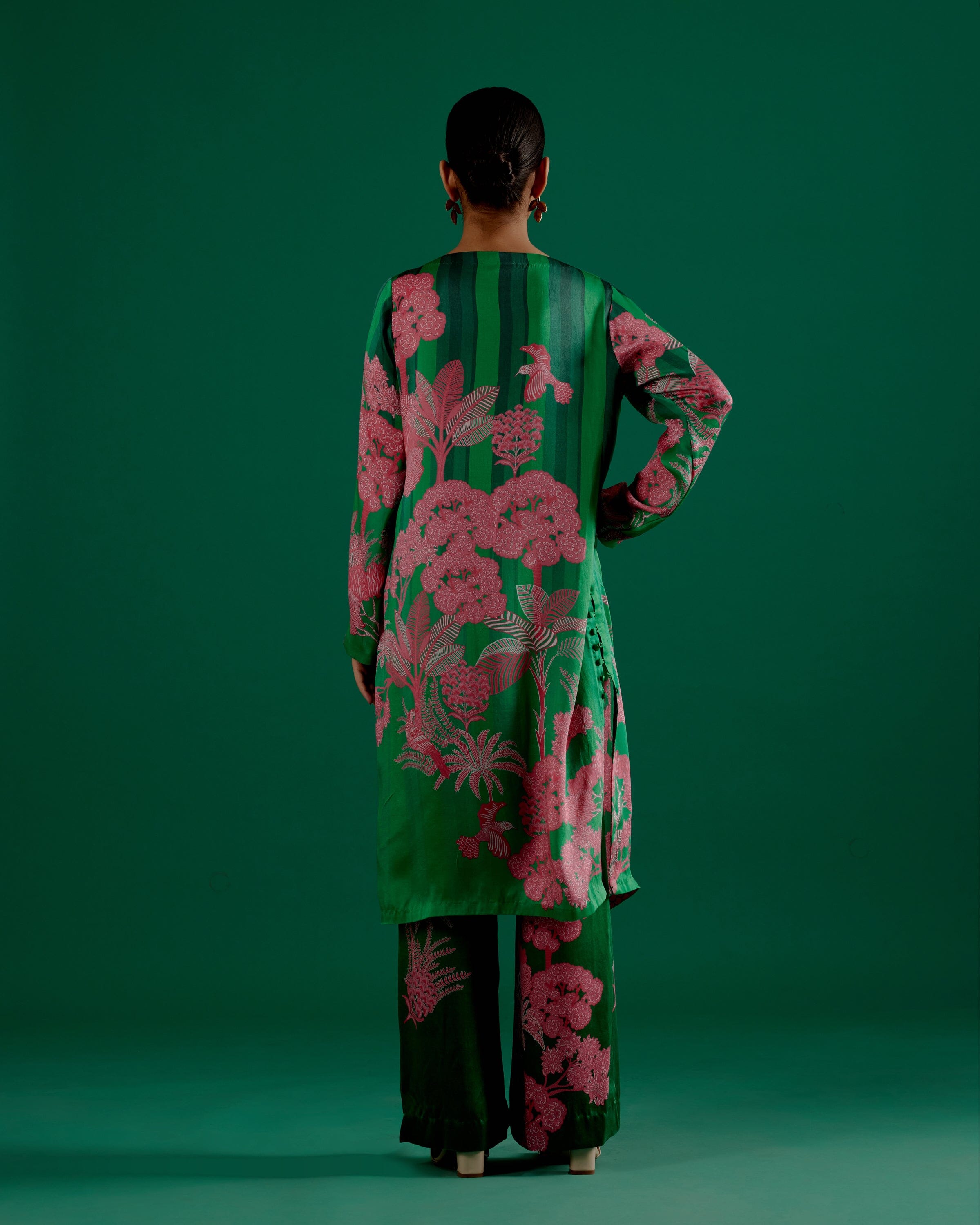 compuesto por un conjunto de conjunto estampado en verde a juego. Es
