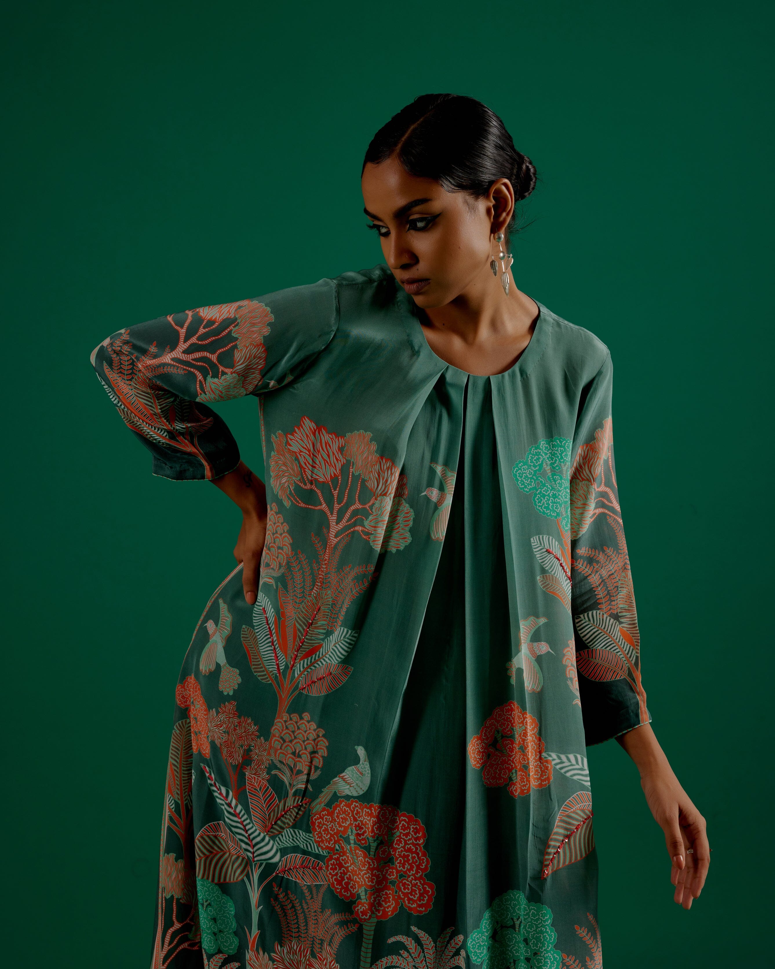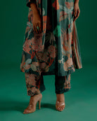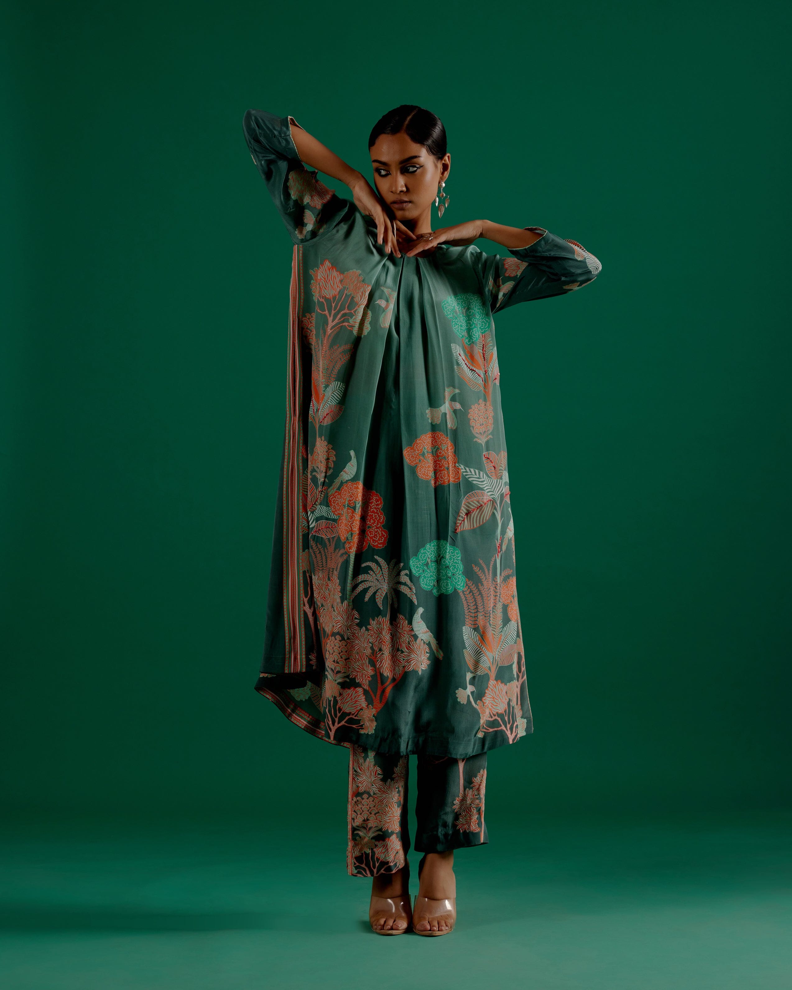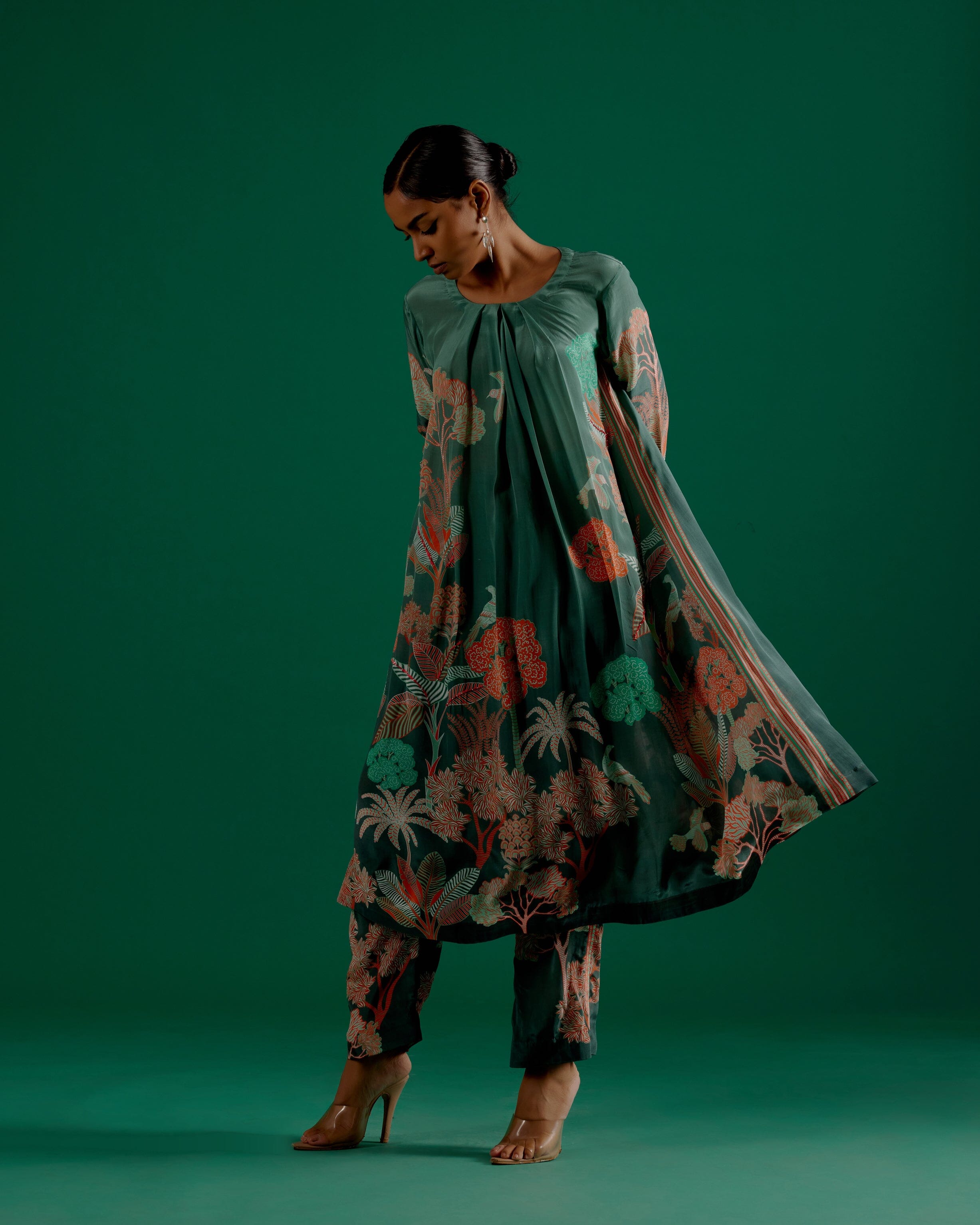 Kurta de corte A de color verde vibrante y pantalones adornados con un