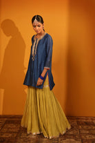 Este impresionante conjunto sharara está confeccionado con lujosa seda chanderi y viene con una elegante dupatta de organza. El atuendo está adornado con intrincados bordados a mano, con lentejuelas doradas y plateadas, y trabajo naqshi que agrega un toque de brillo a la kurta azul, la sharara amarilla y la dupatta rosa. Este conjunto es perfecto para cualquier celebración festiva, lo que lo convierte en una selección ideal para aquellos que quieren lucir lo mejor posible.