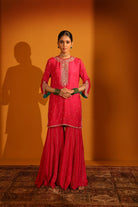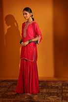 Un cautivador conjunto sharara de seda con una dupatta de organza en un majestuoso tono rosa intenso, adornado con lentejuelas bordadas a mano con un toque de naqshi dorado y plateado. La cintura elástica proporciona una comodidad suprema y un ajuste perfecto.