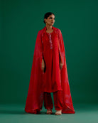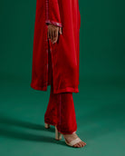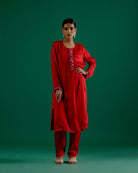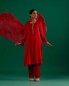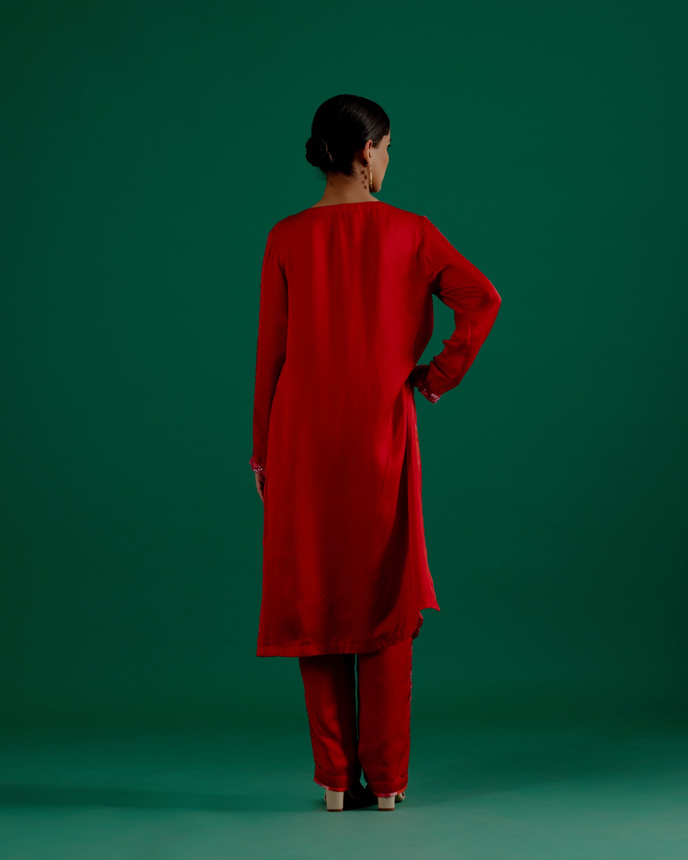 Impresionante conjunto de kurta roja con intrincado trabajo hecho a mano.