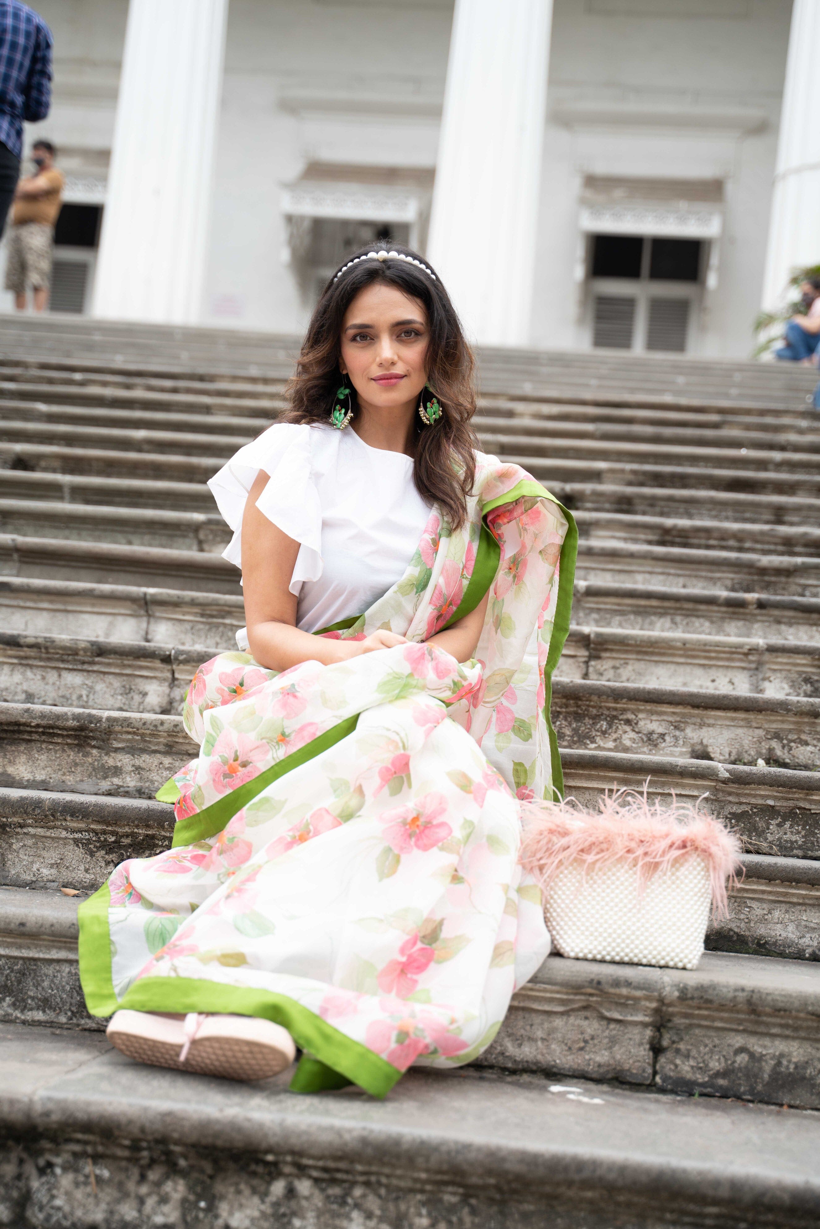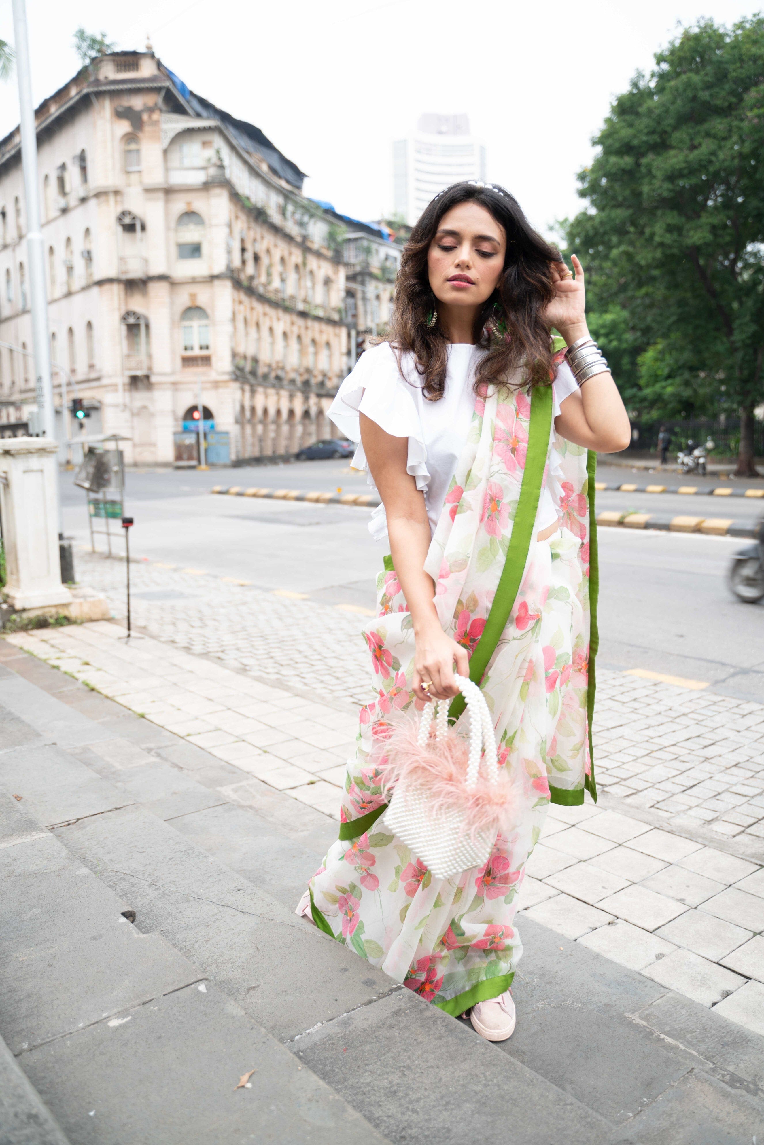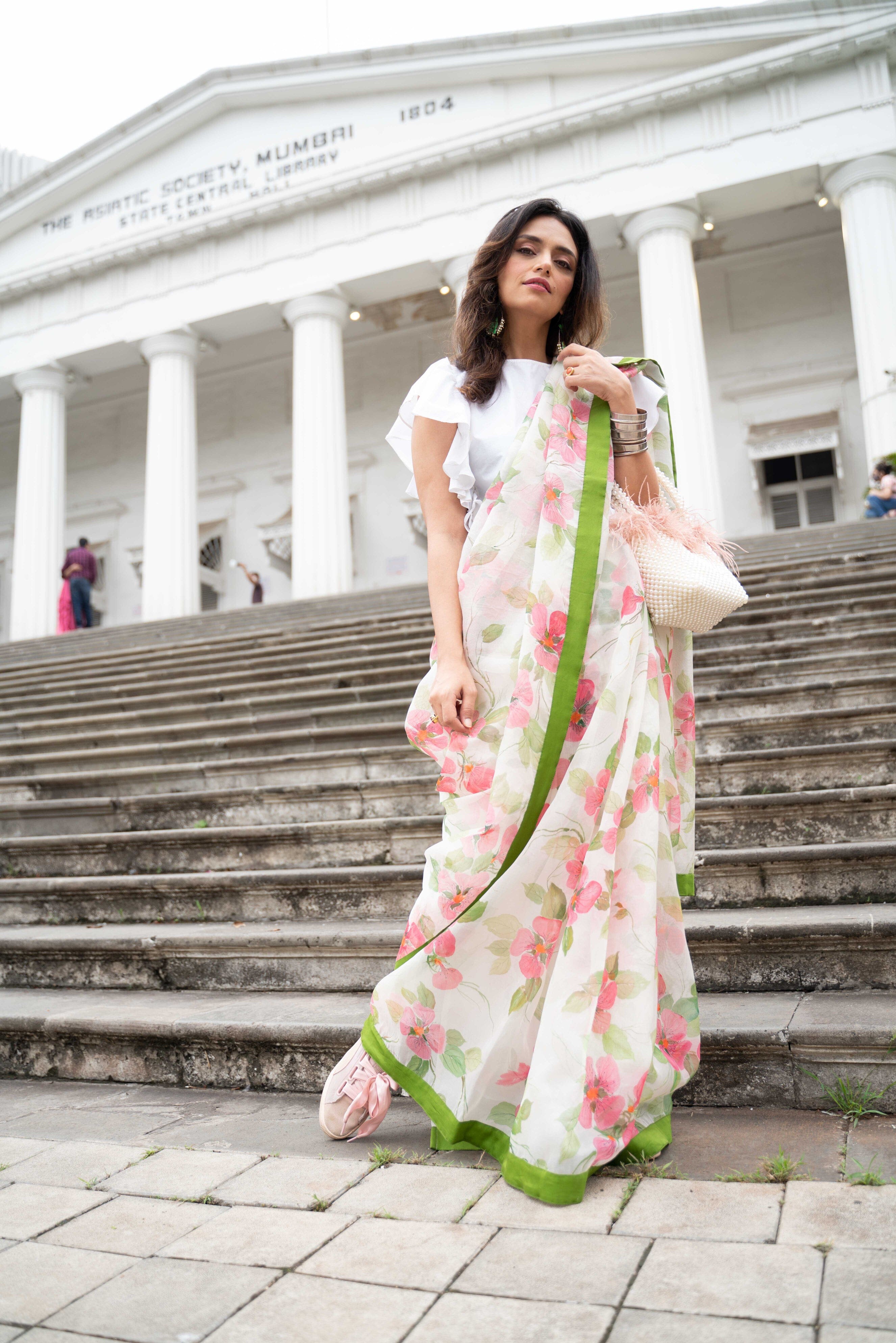 Un sari pintado a mano de organza de seda hecho a medida con un hermoso trabajo Mukaish.