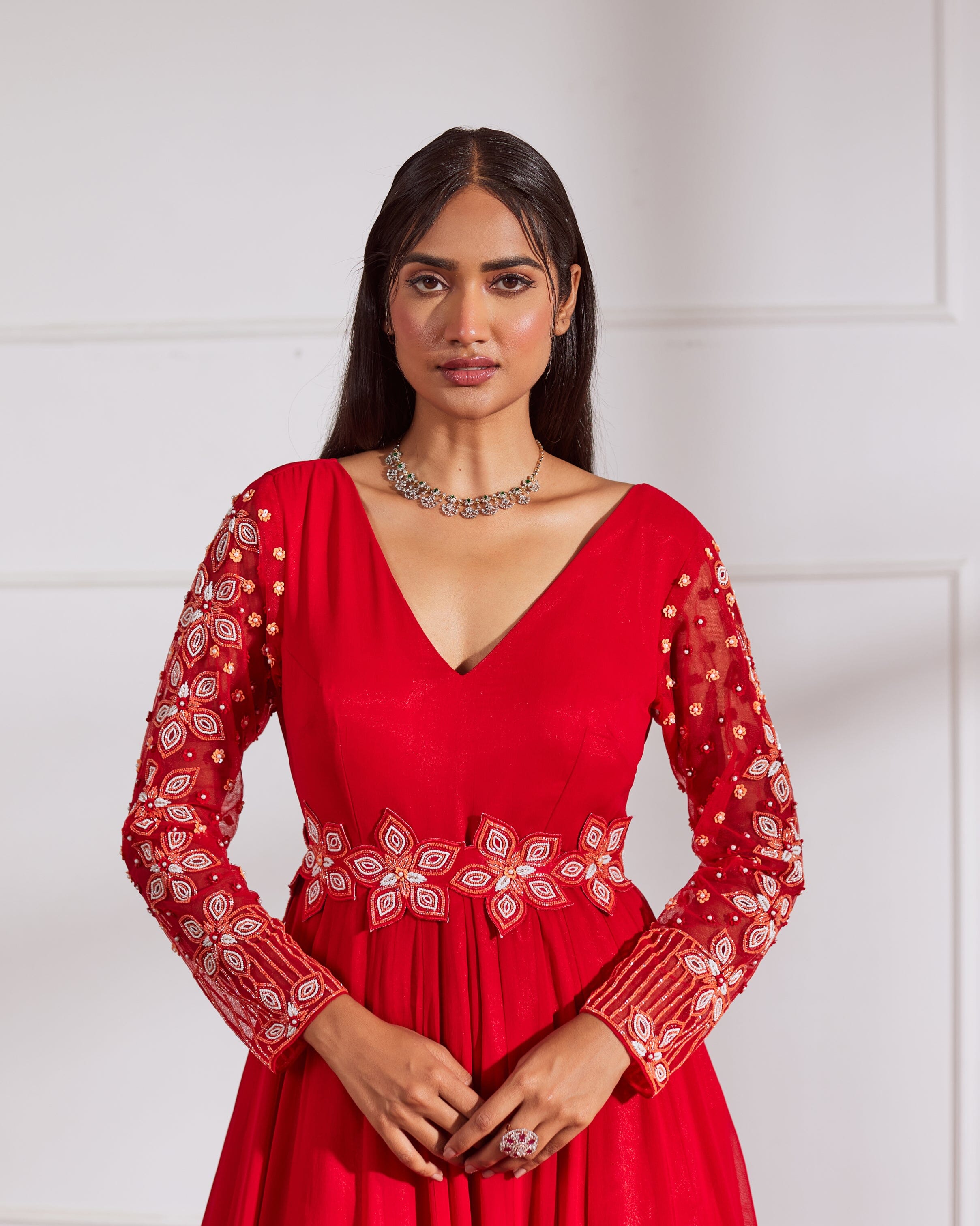 Blusa verde botella de un hombro con sari drapeado y cinturón