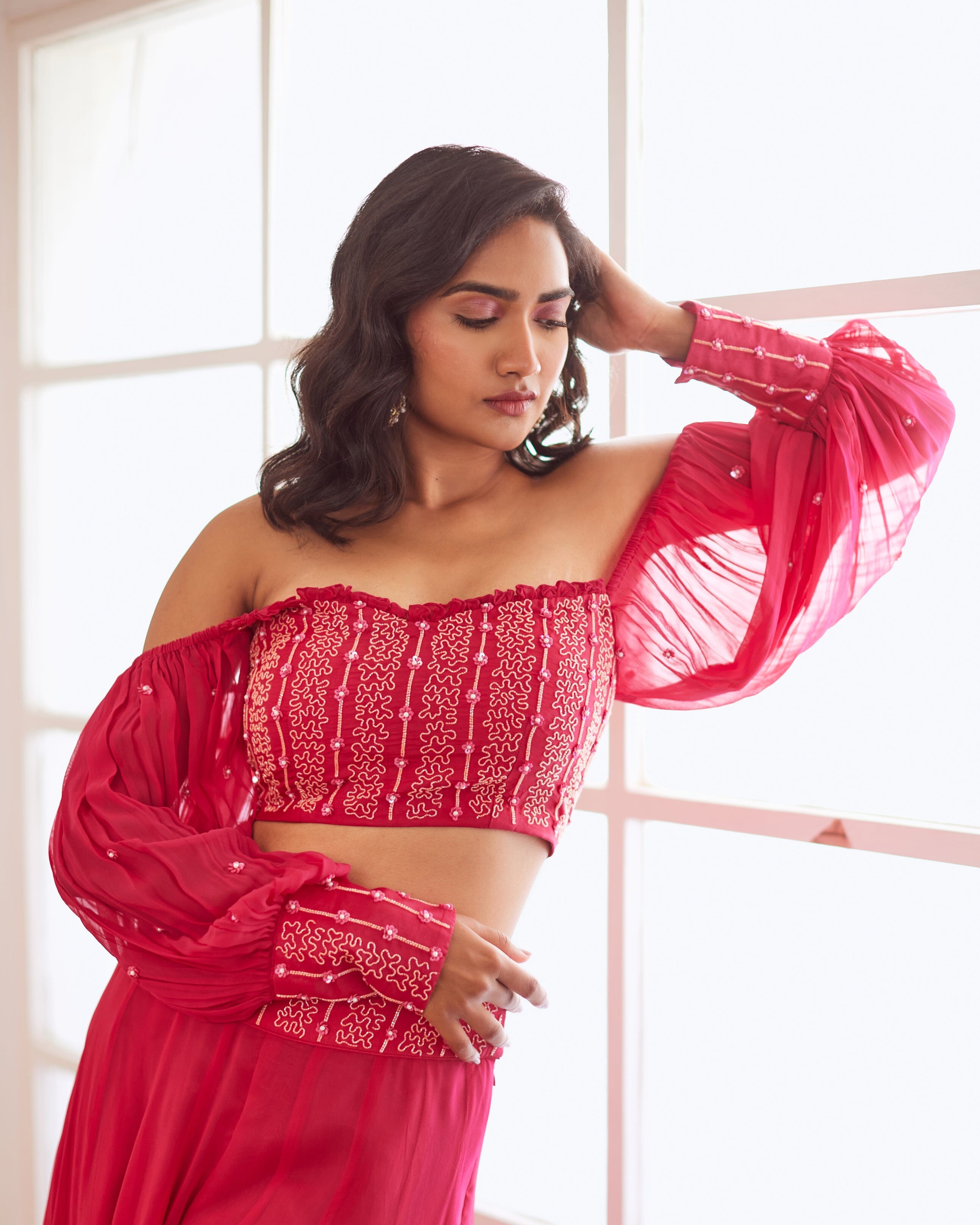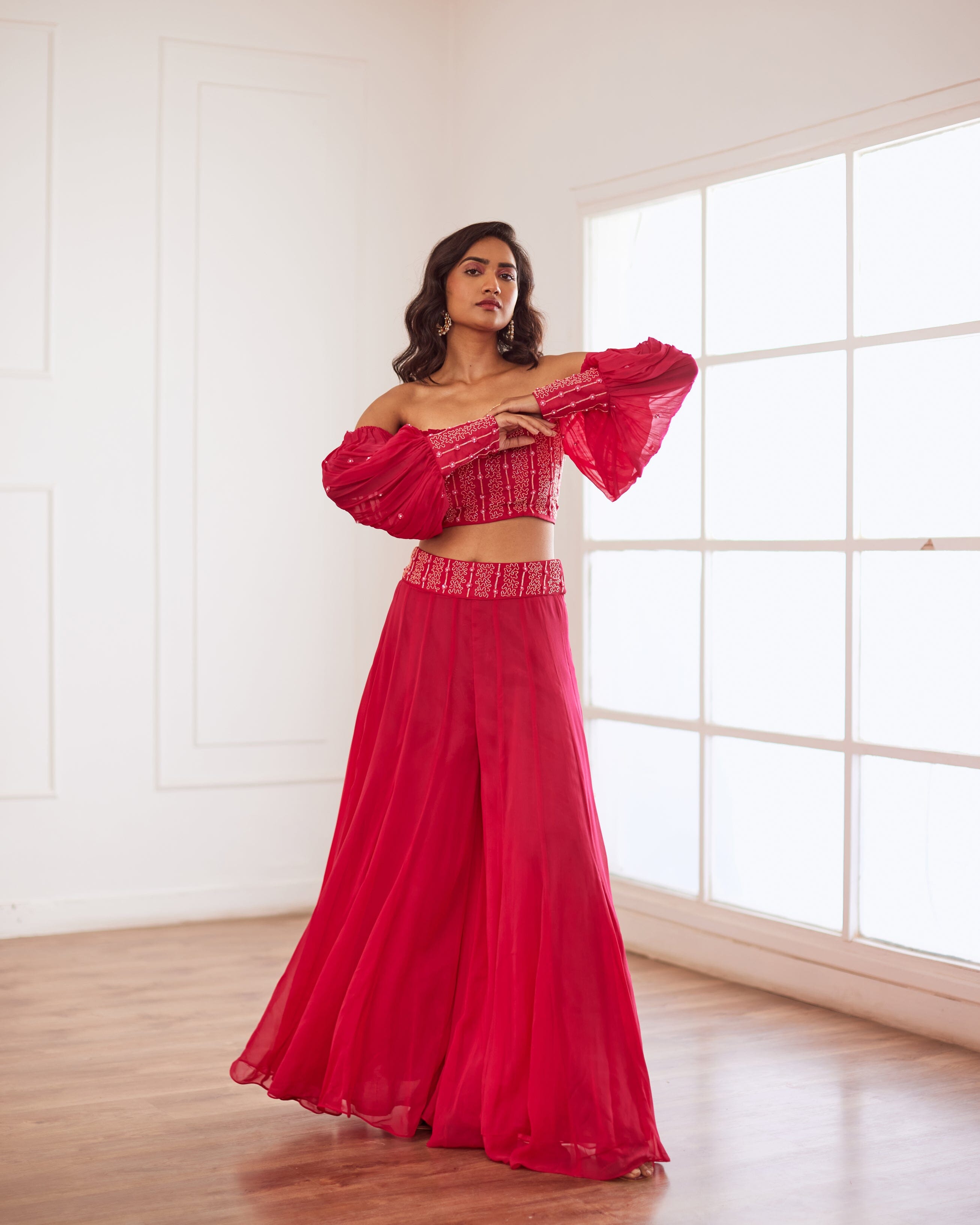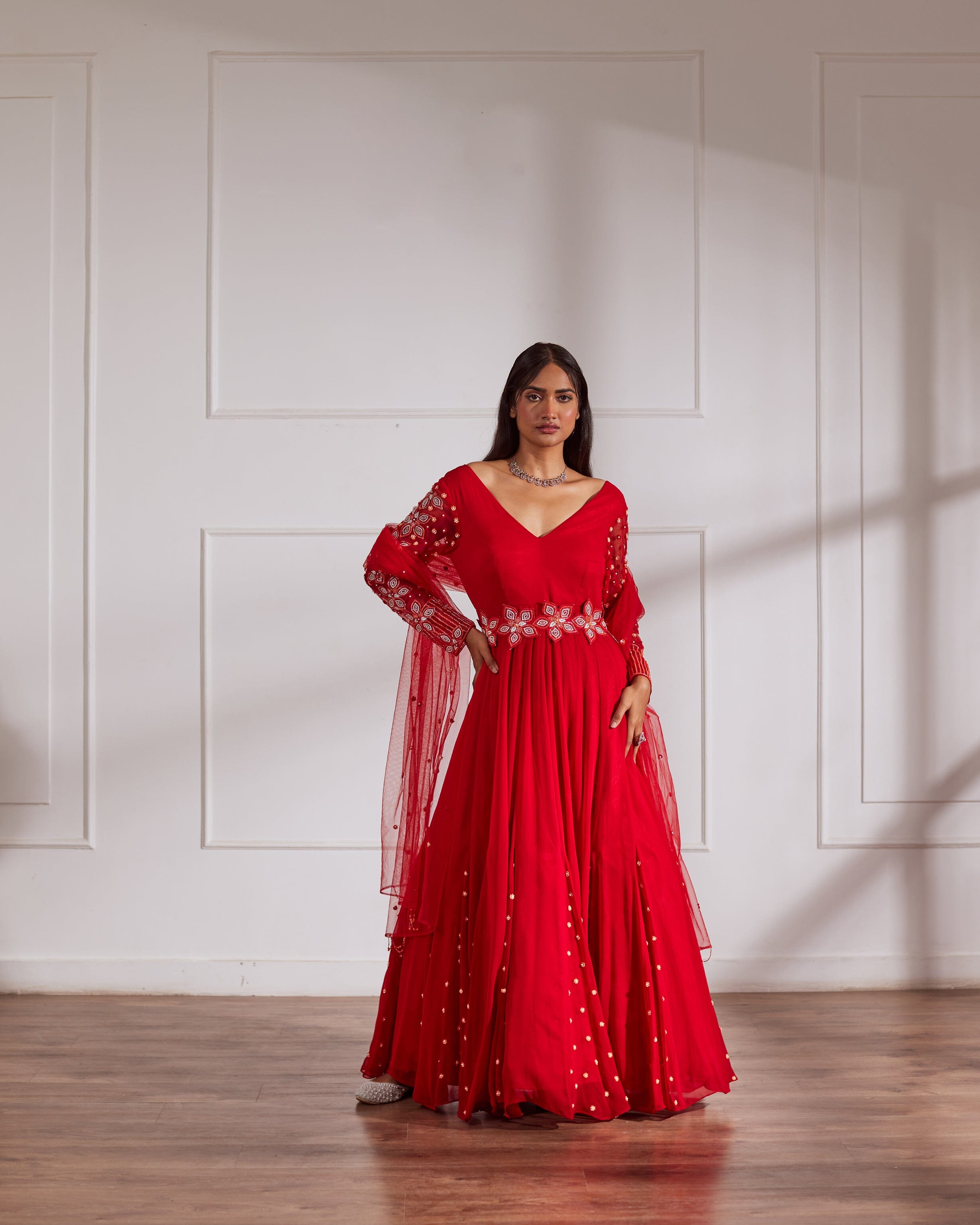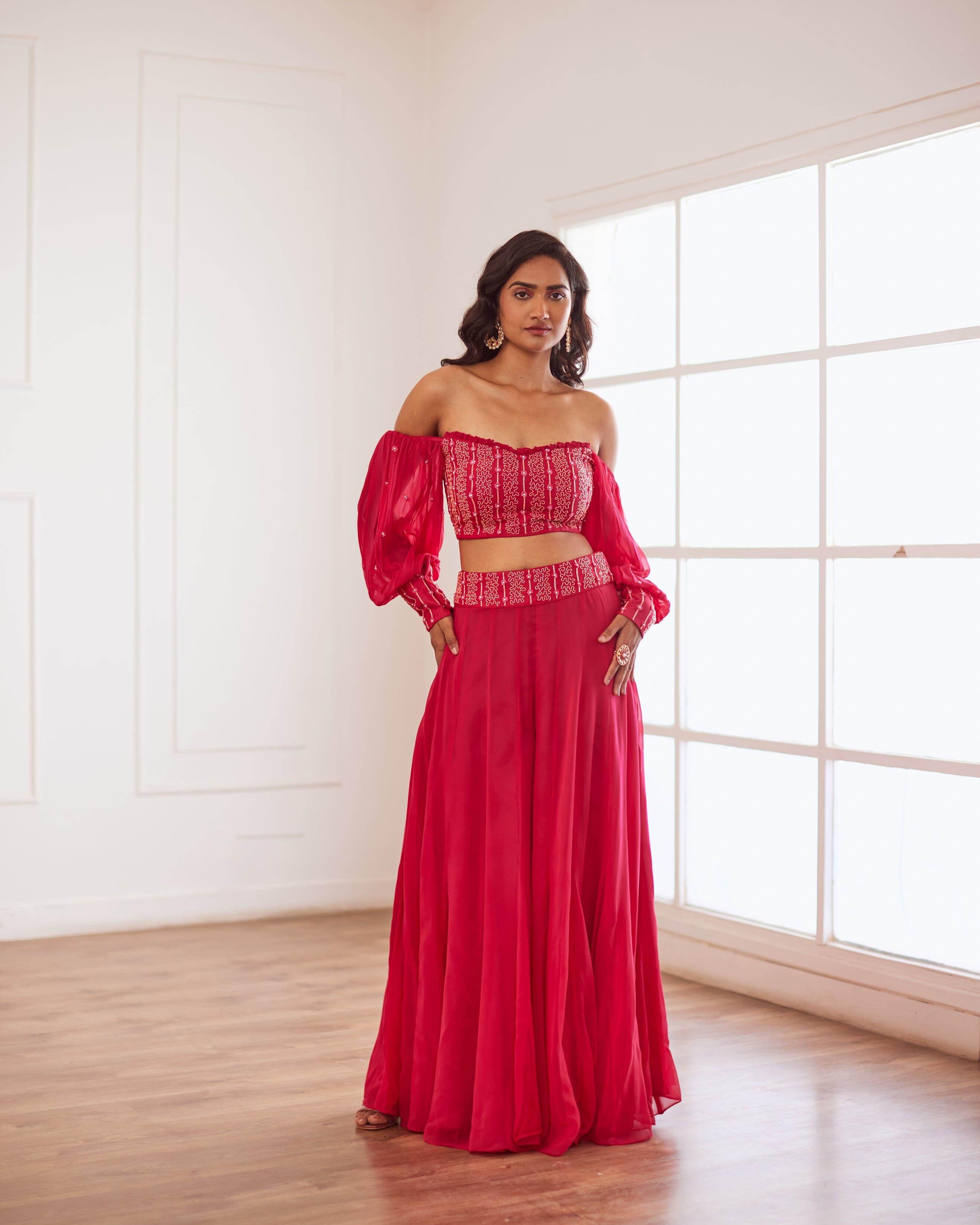 Juego de sari Plum Lehenga con Dupatta de volantes de red