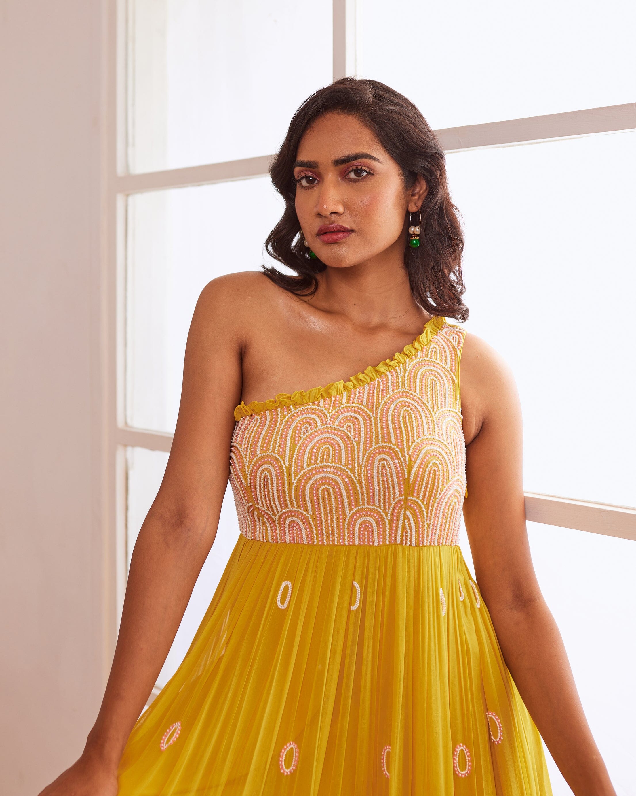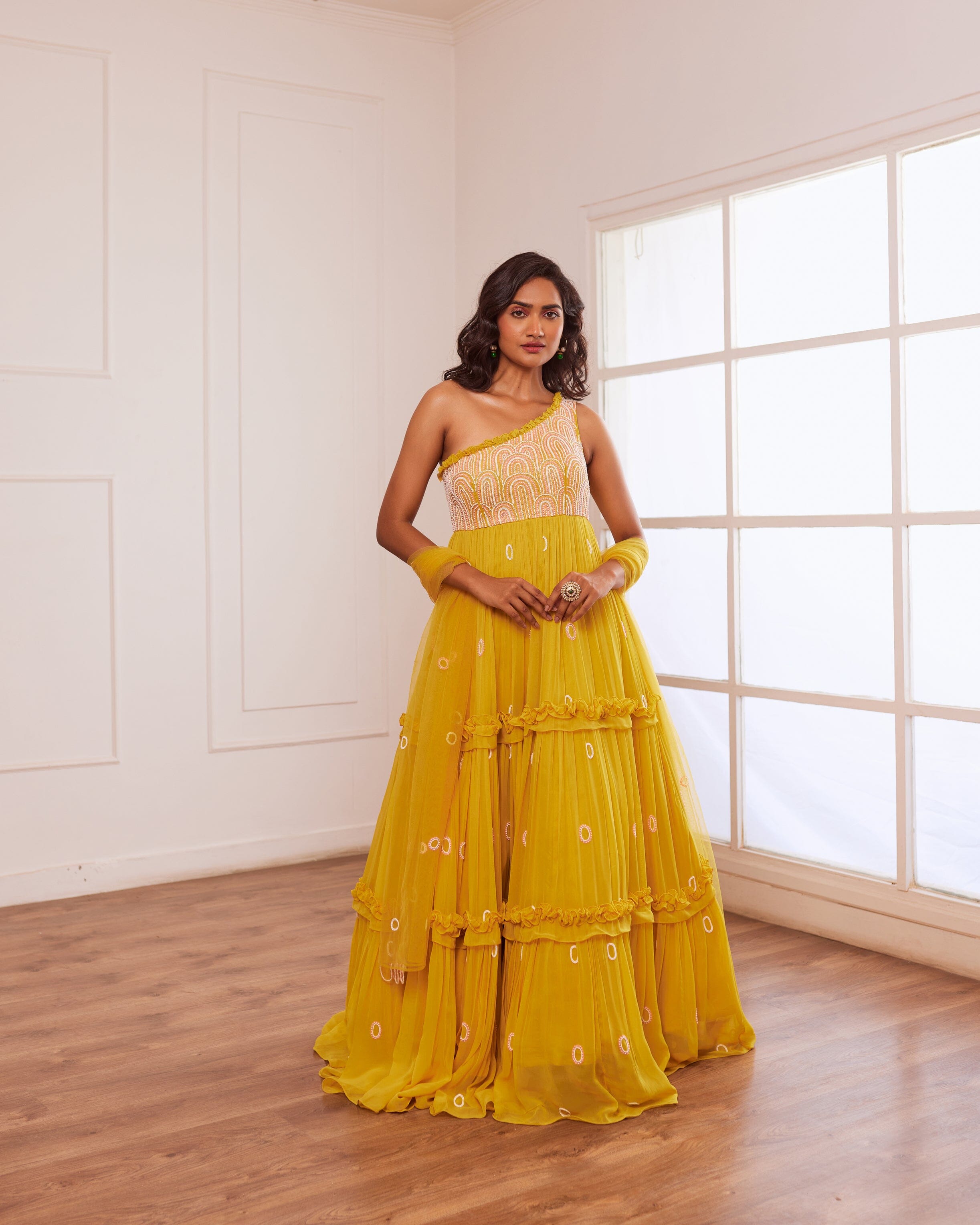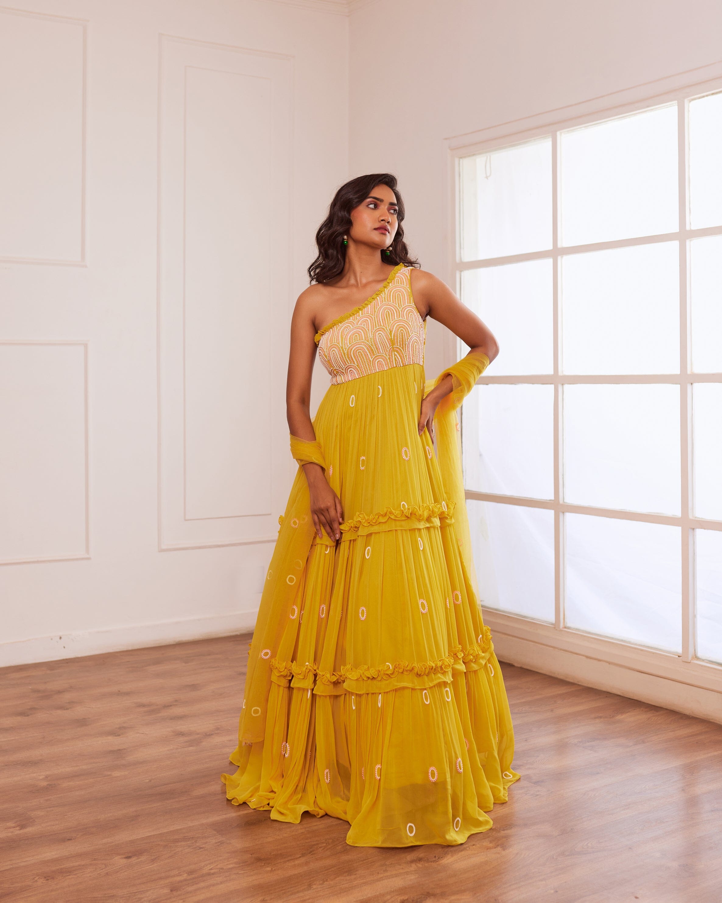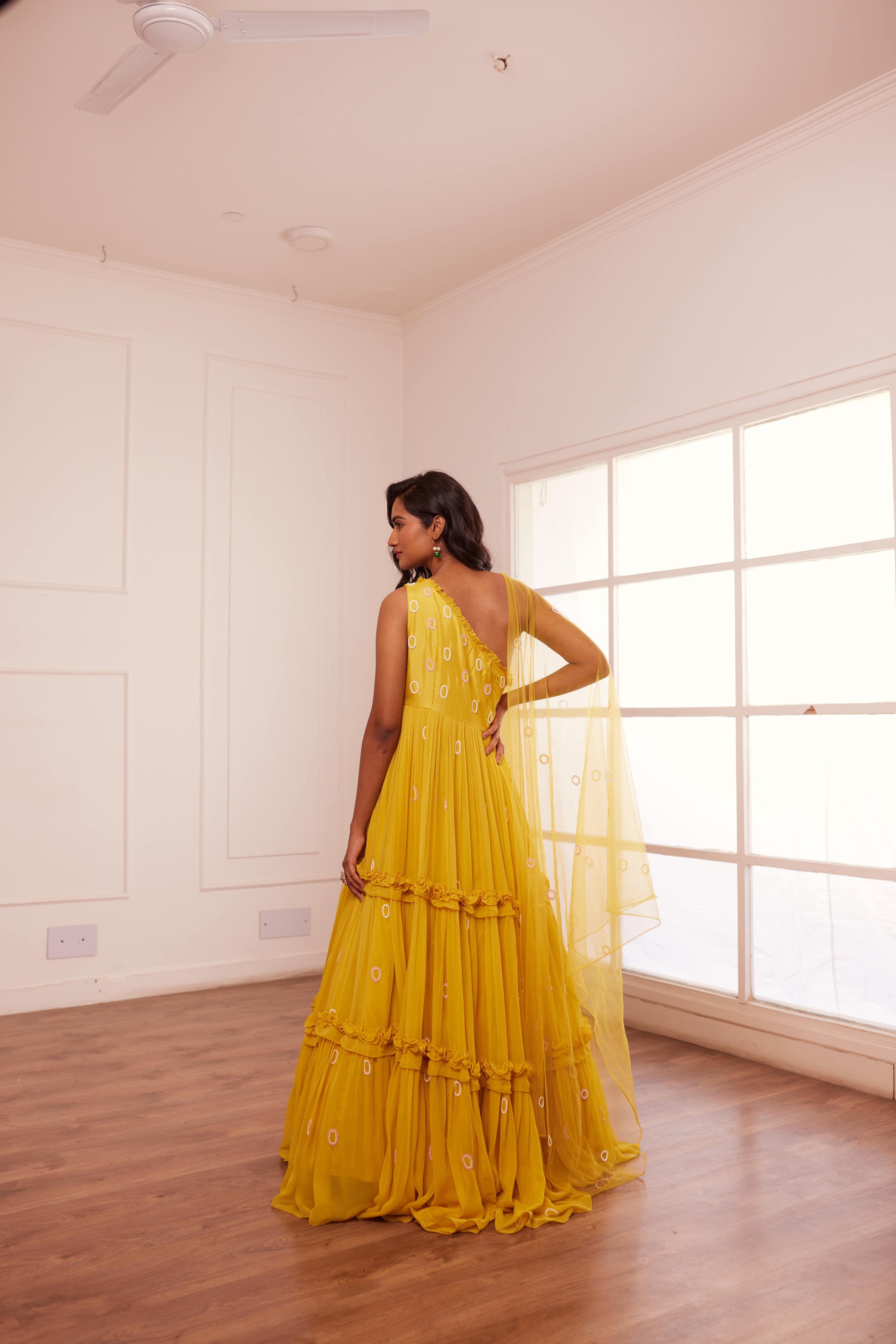 Yugo amarillo bordado en un hombro con georgette ghera en capas combinado con dupatta de red amarilla.