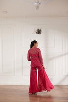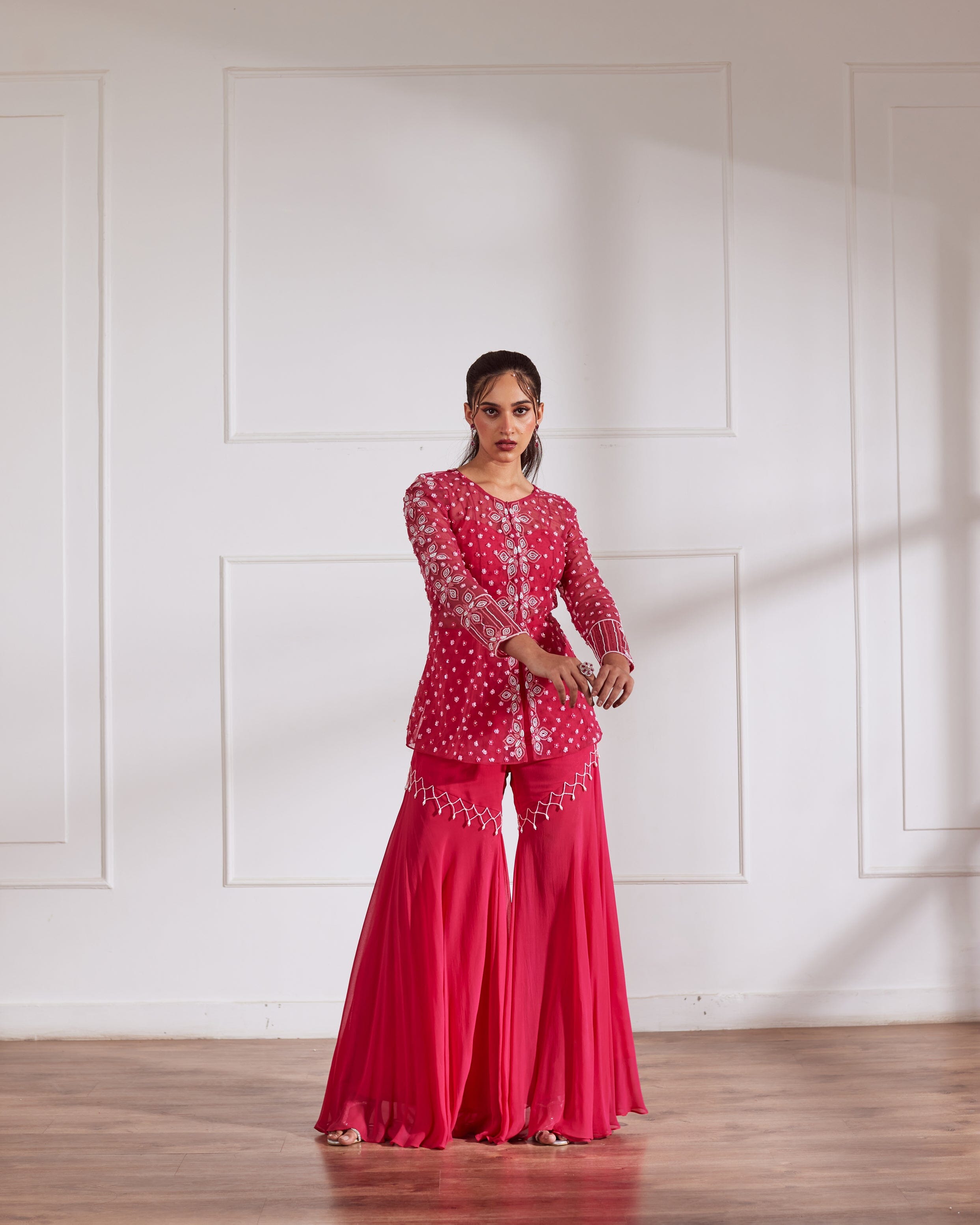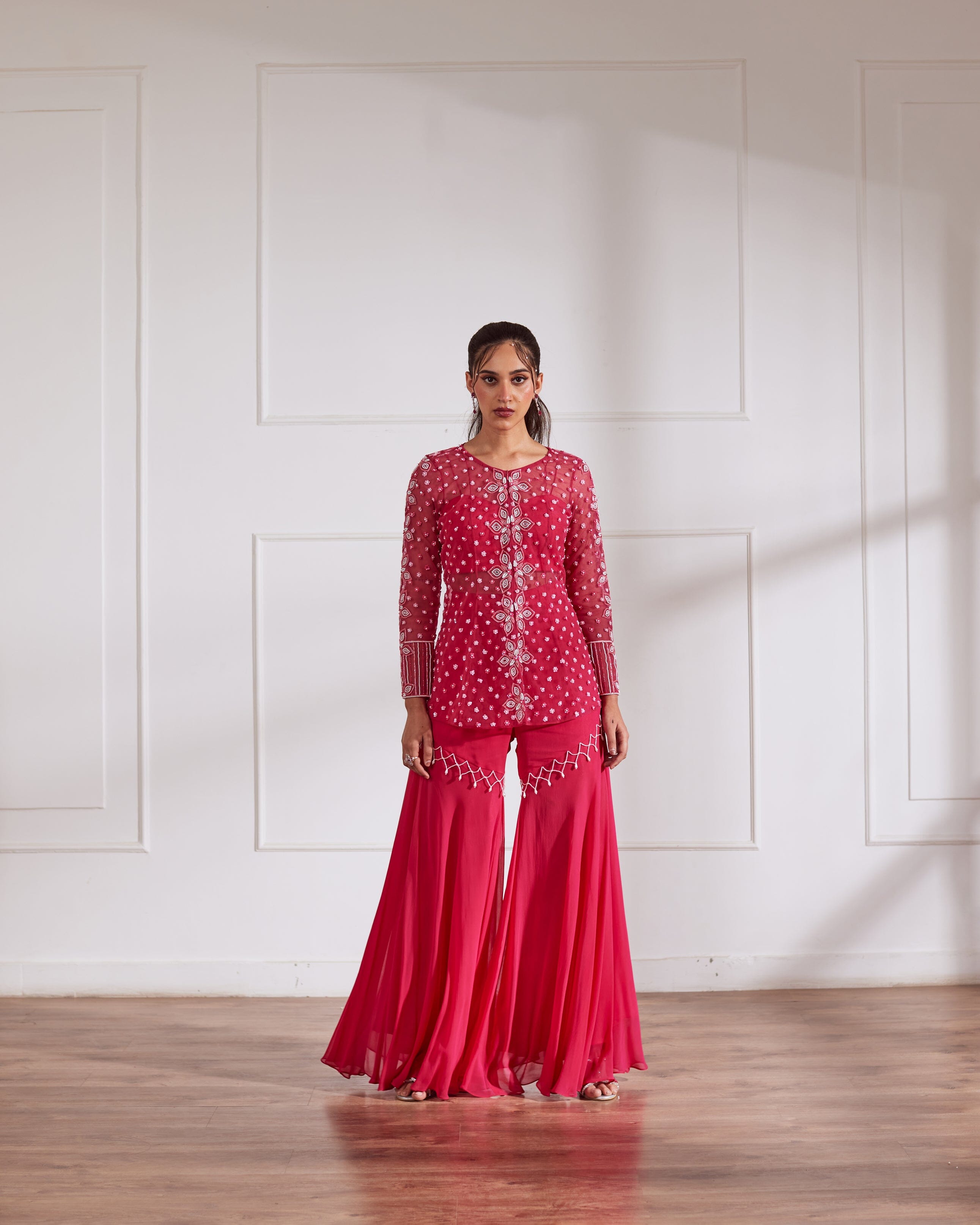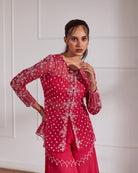 Peplum de red totalmente bordado en fuscia con corpiño de seda combinado con fuscia garara, con borlas en la articulación.