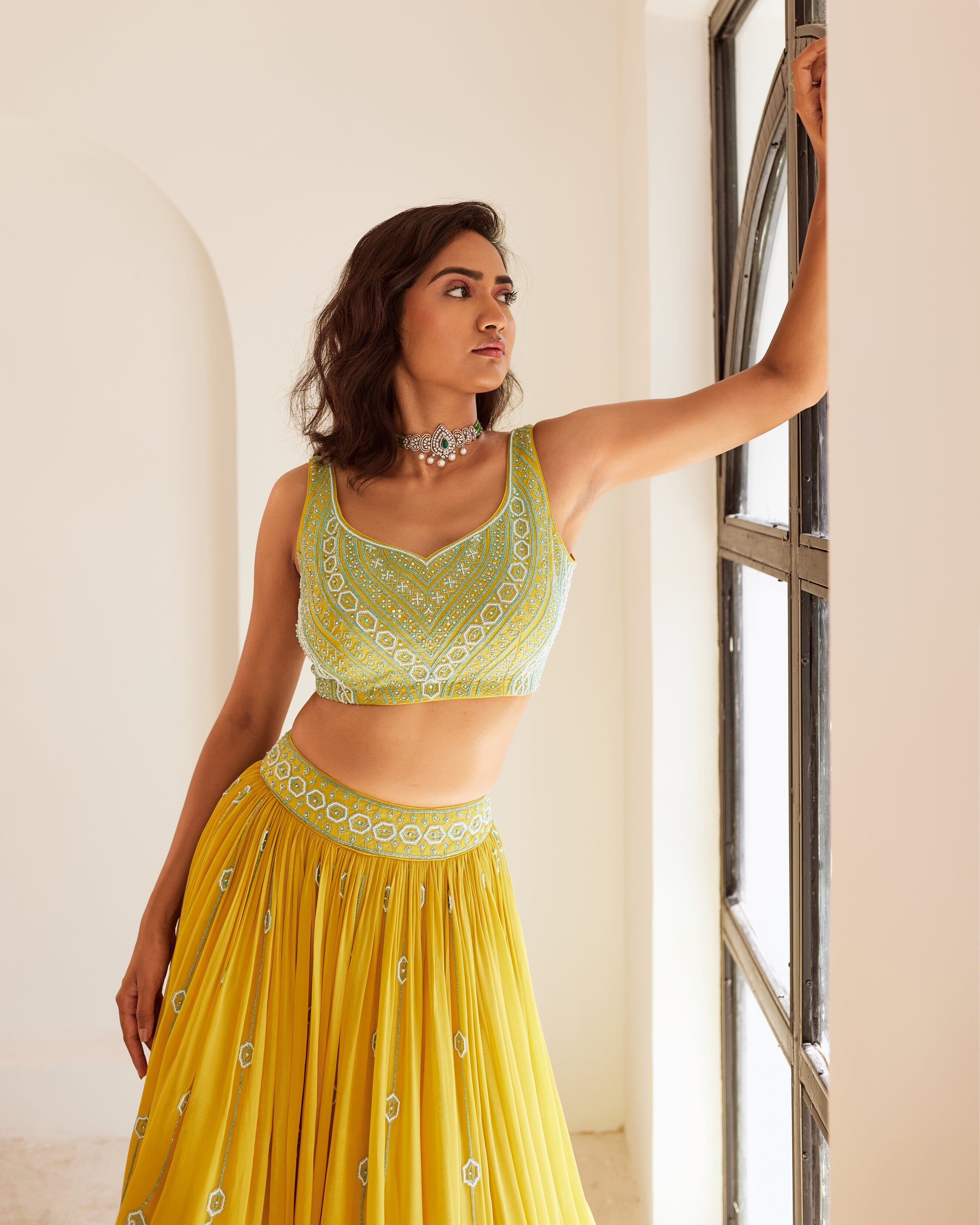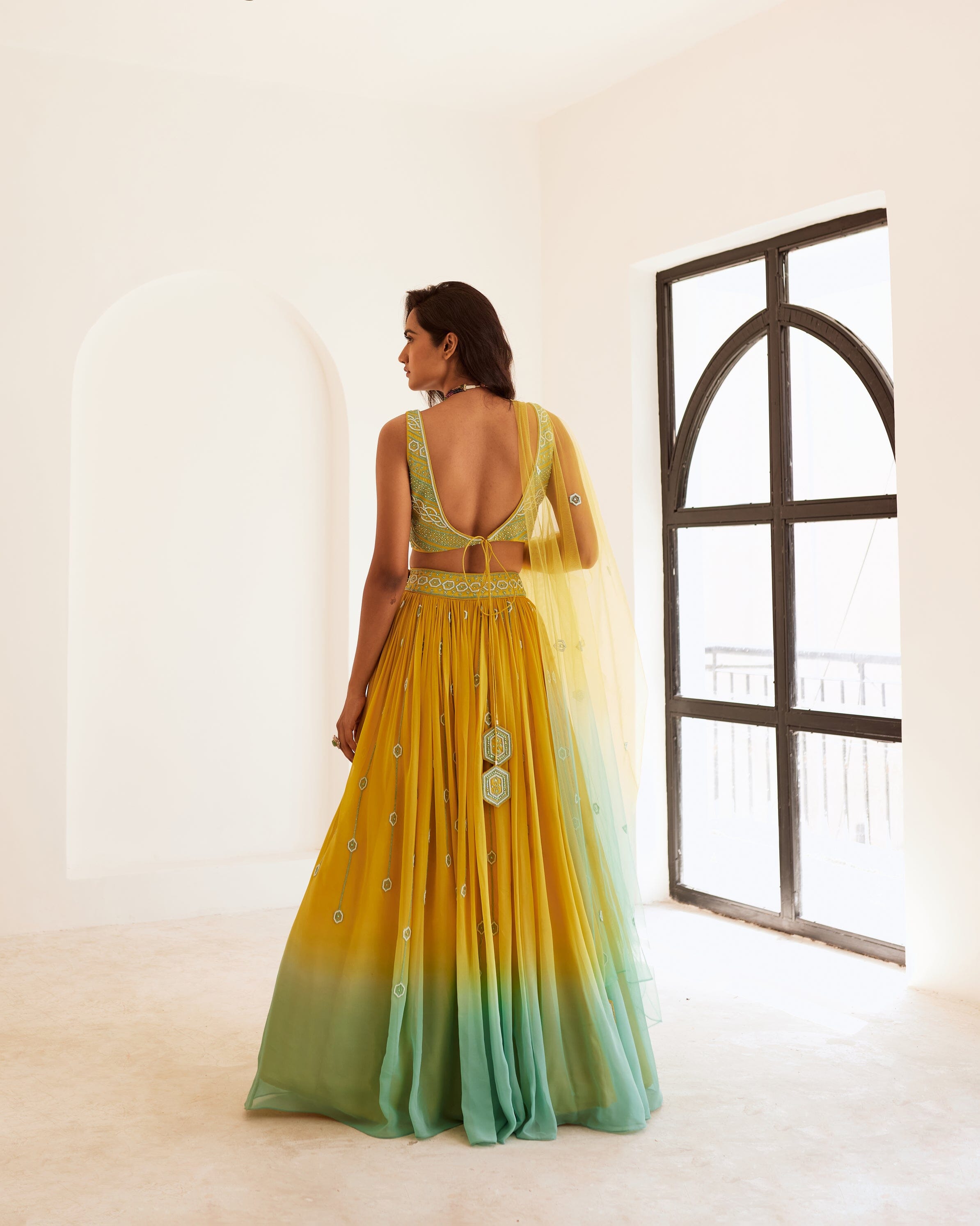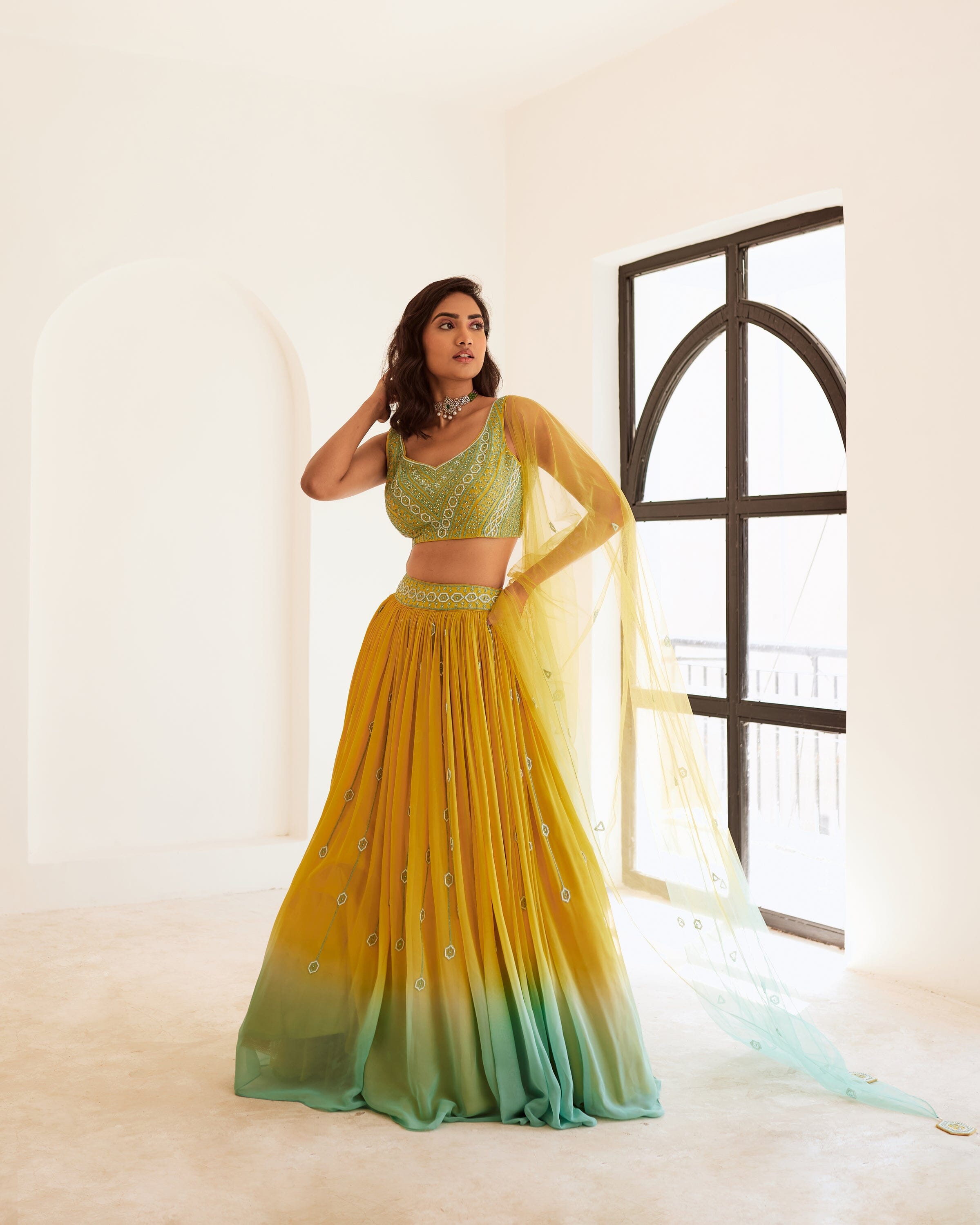 Blusa amarilla completamente bordada combinada con lehenga fruncida y dupatta de red con borlas bordadas a mano . Conjunto lehenga ombre amarillo y azul