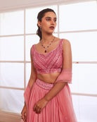 Blusa rosa melocotón completamente bordada combinada con lehenga fruncida y dupatta de red con borlas bordadas a mano. Conjunto de lehenga ombre rosa melocotón y rosa oscuro