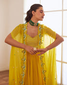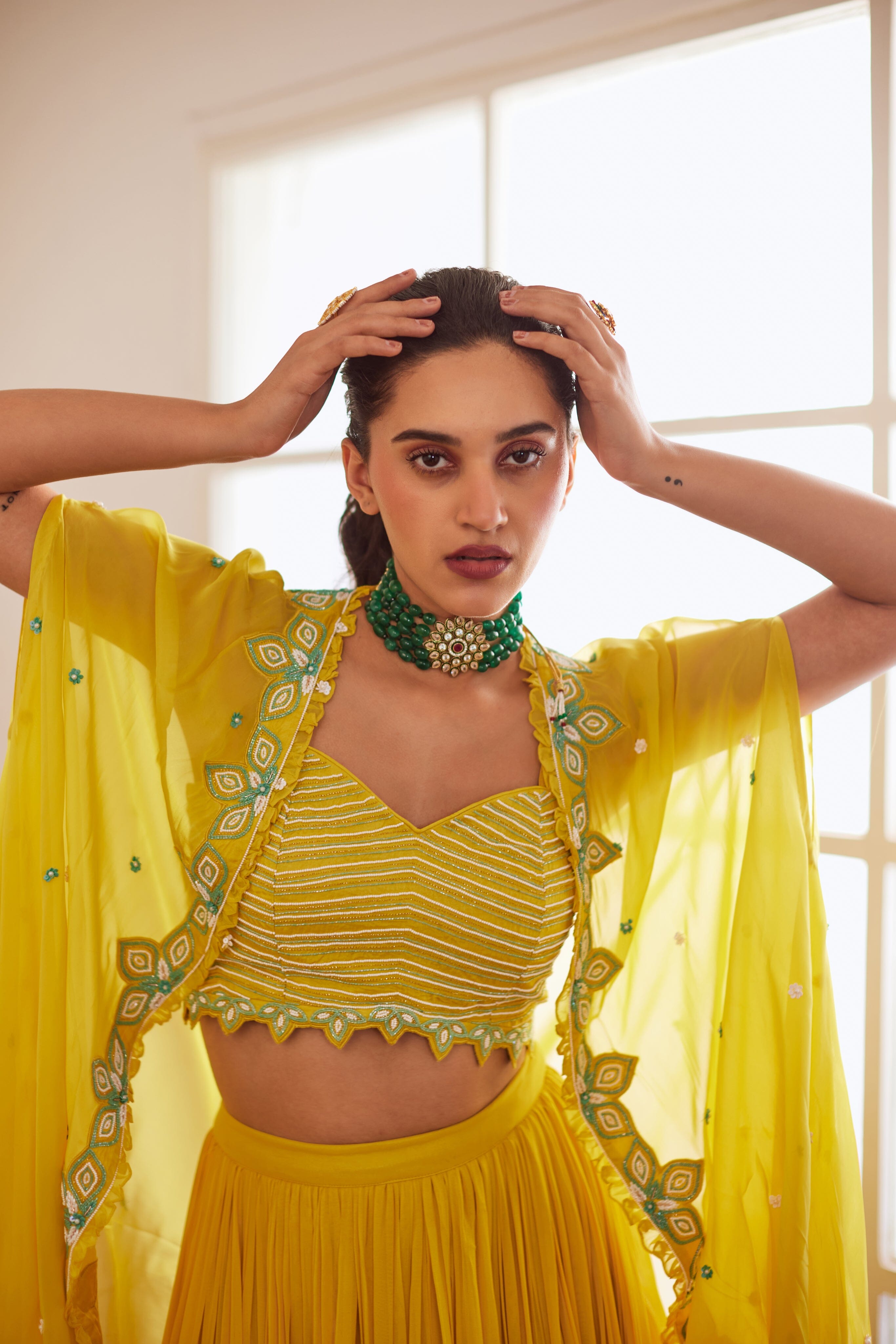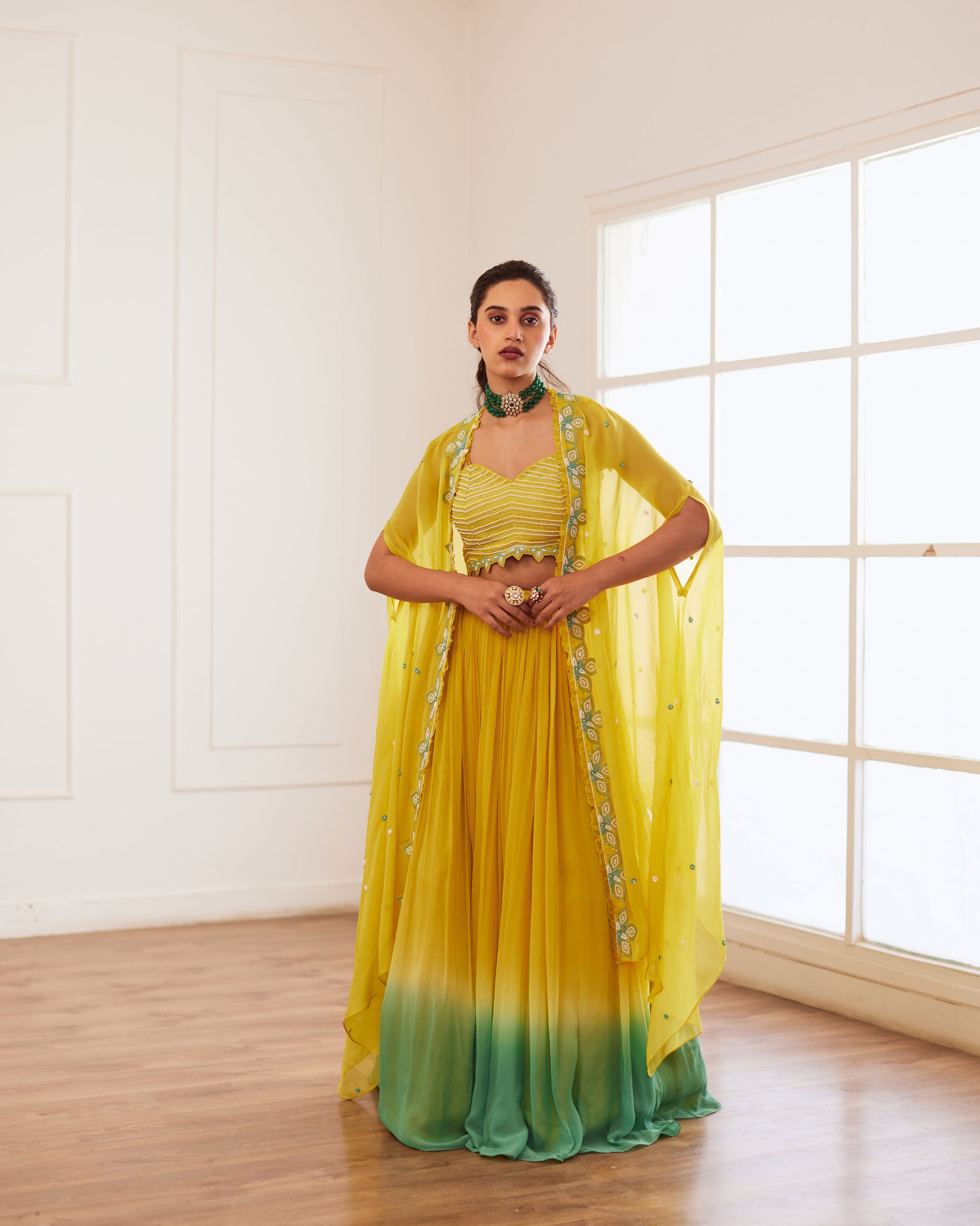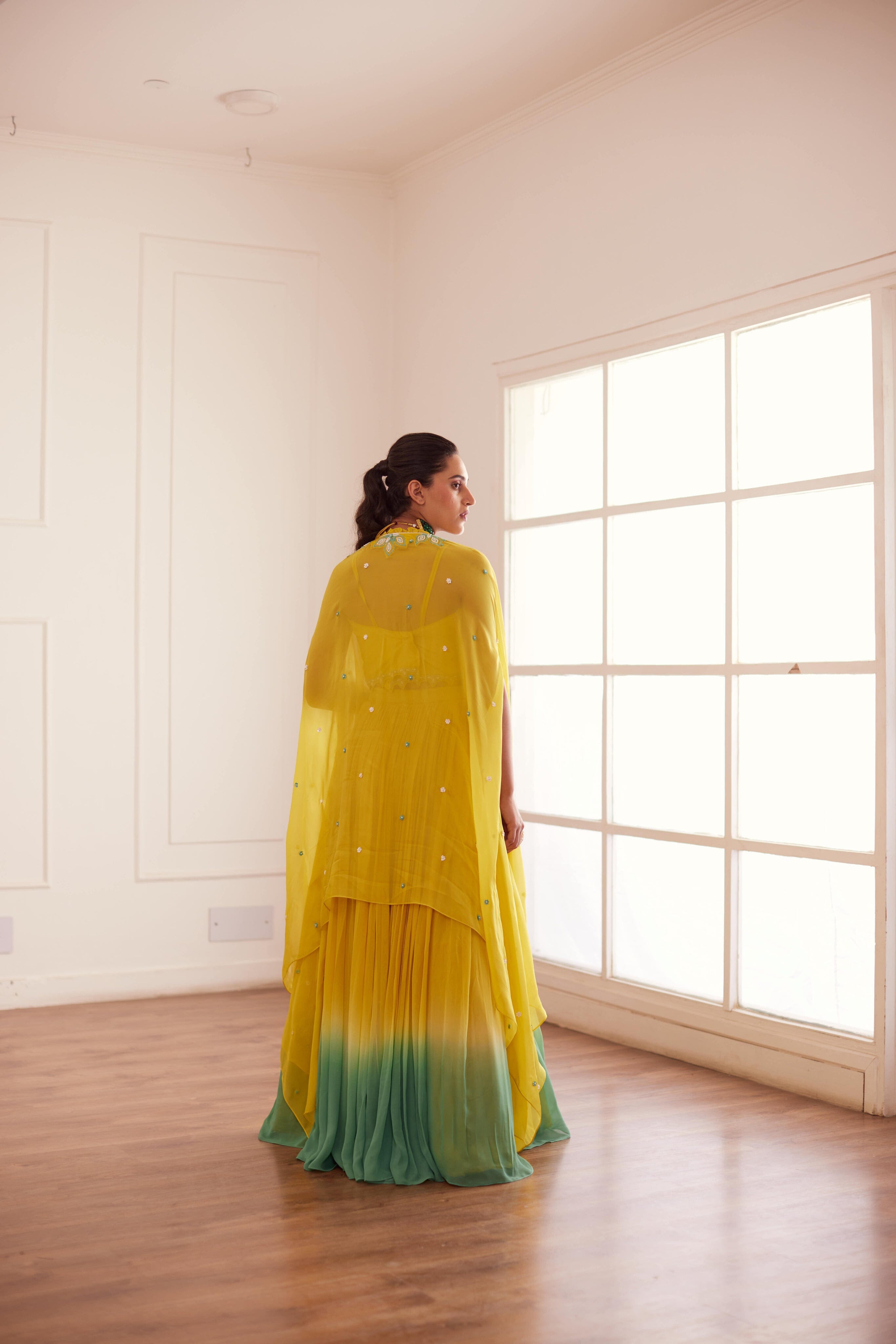 Choli con tiras amarillas y lehenga ombre fruncida combinada con una capa de organza.