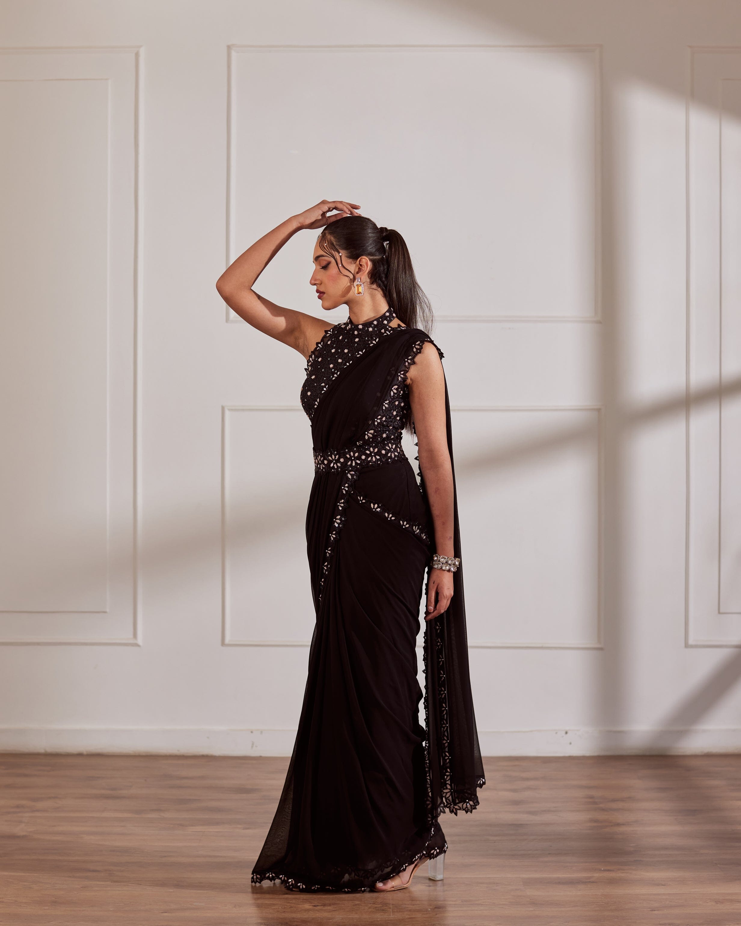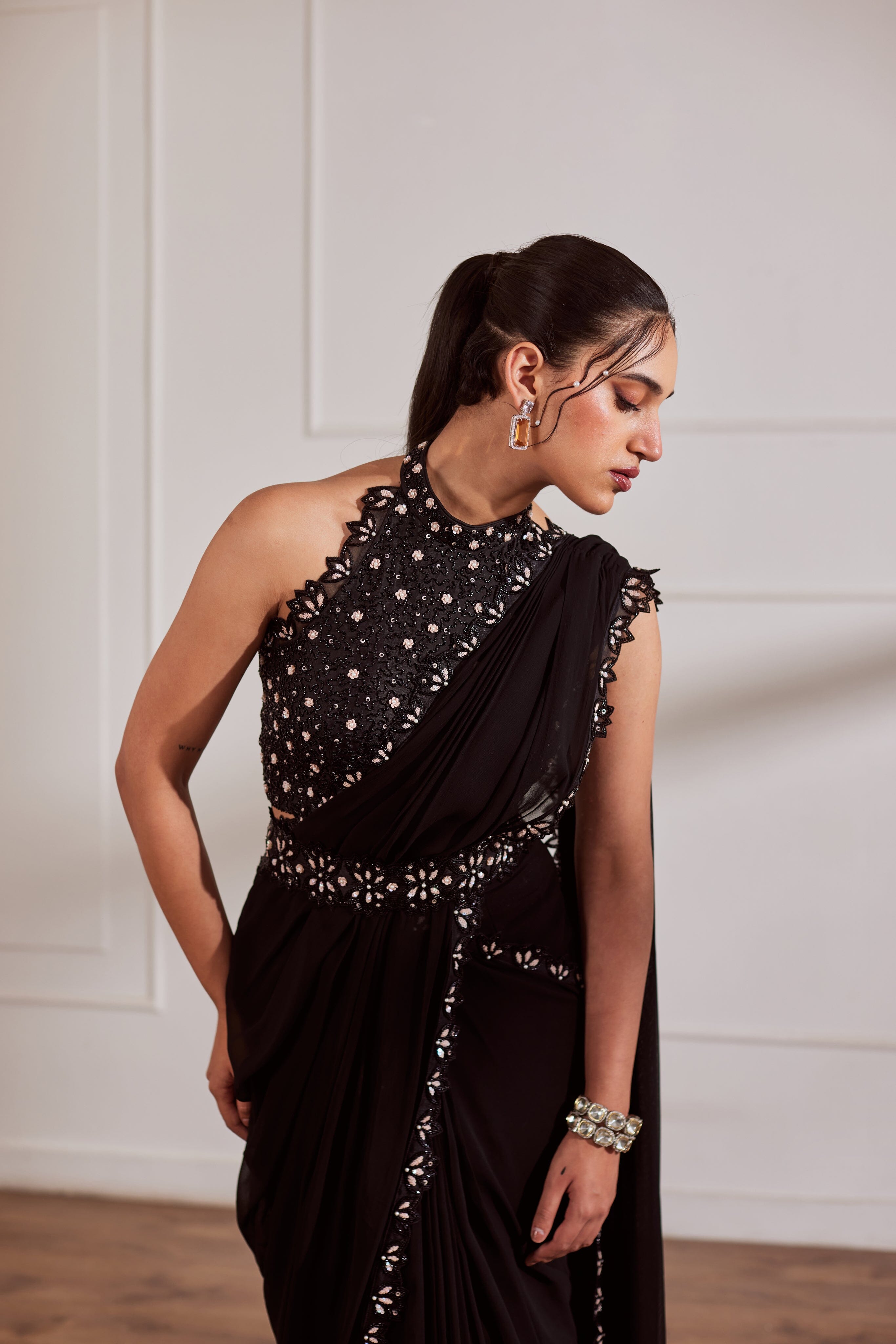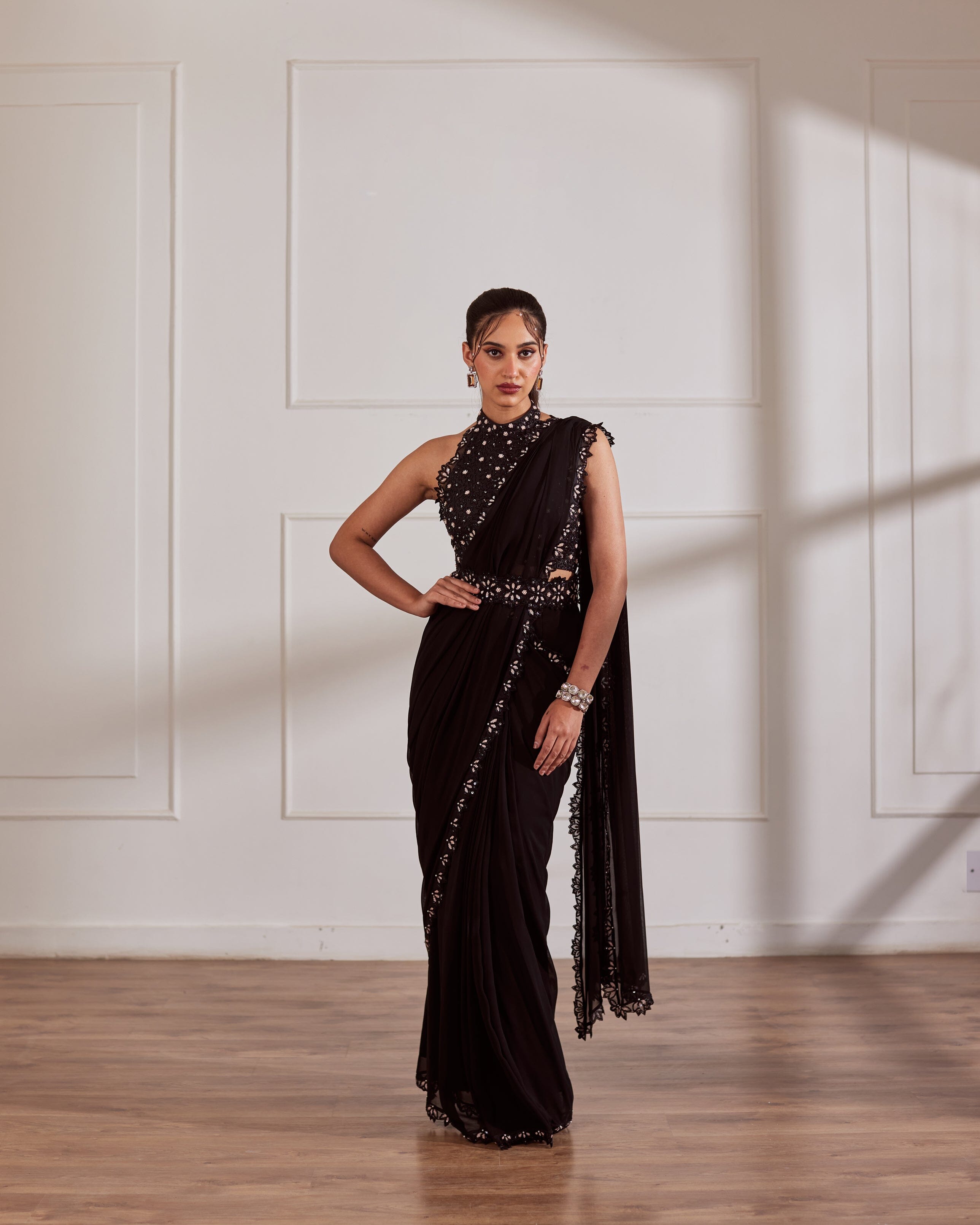 Blusa halter negra con sari drapeado con borde bordado a mano y cinturón desmontable.