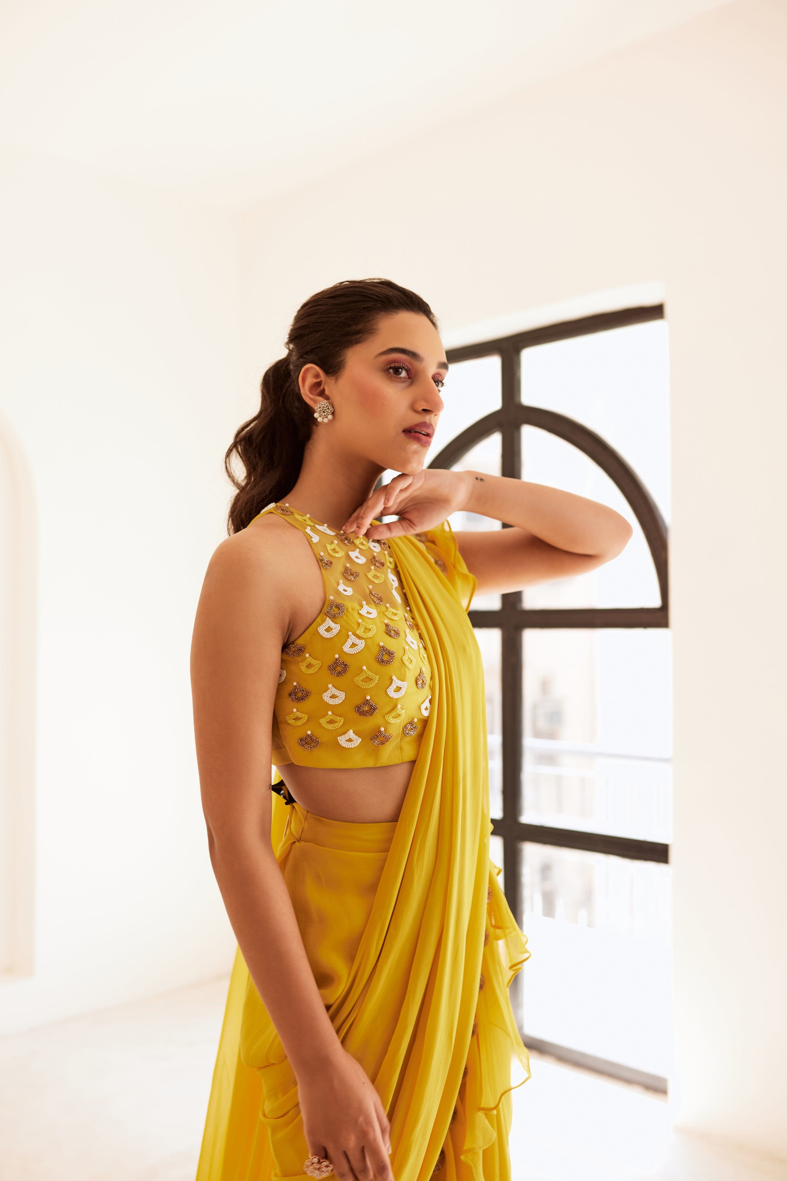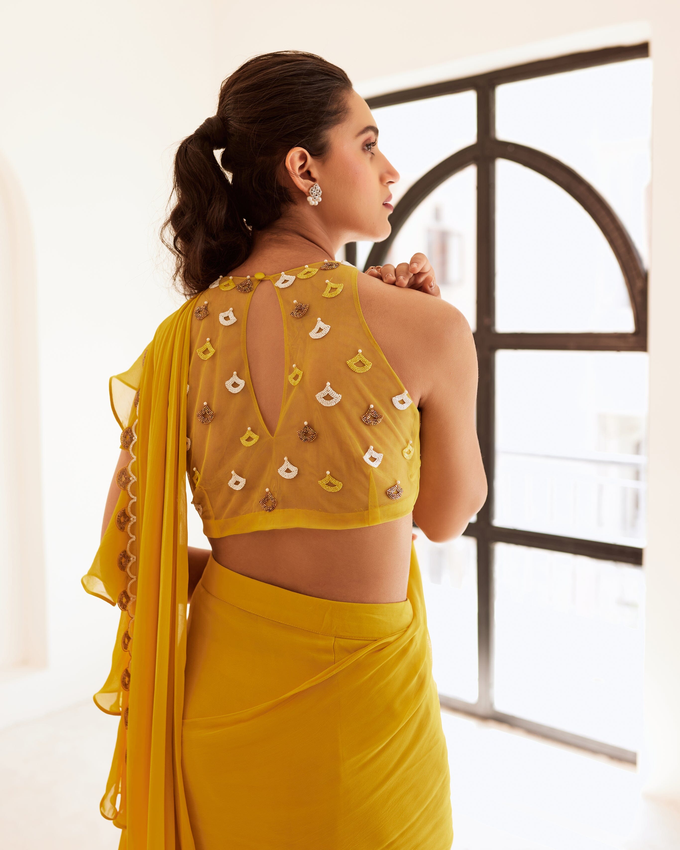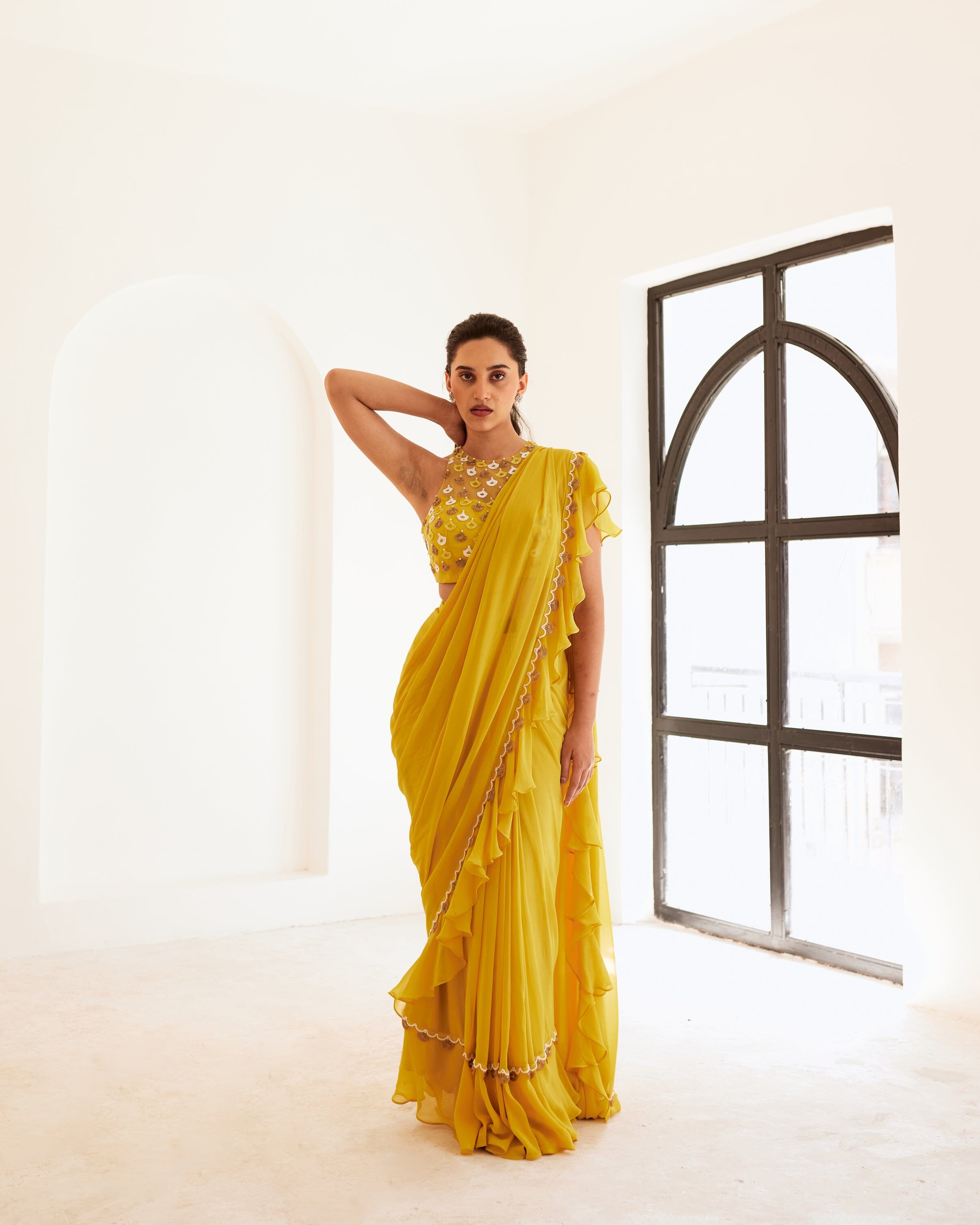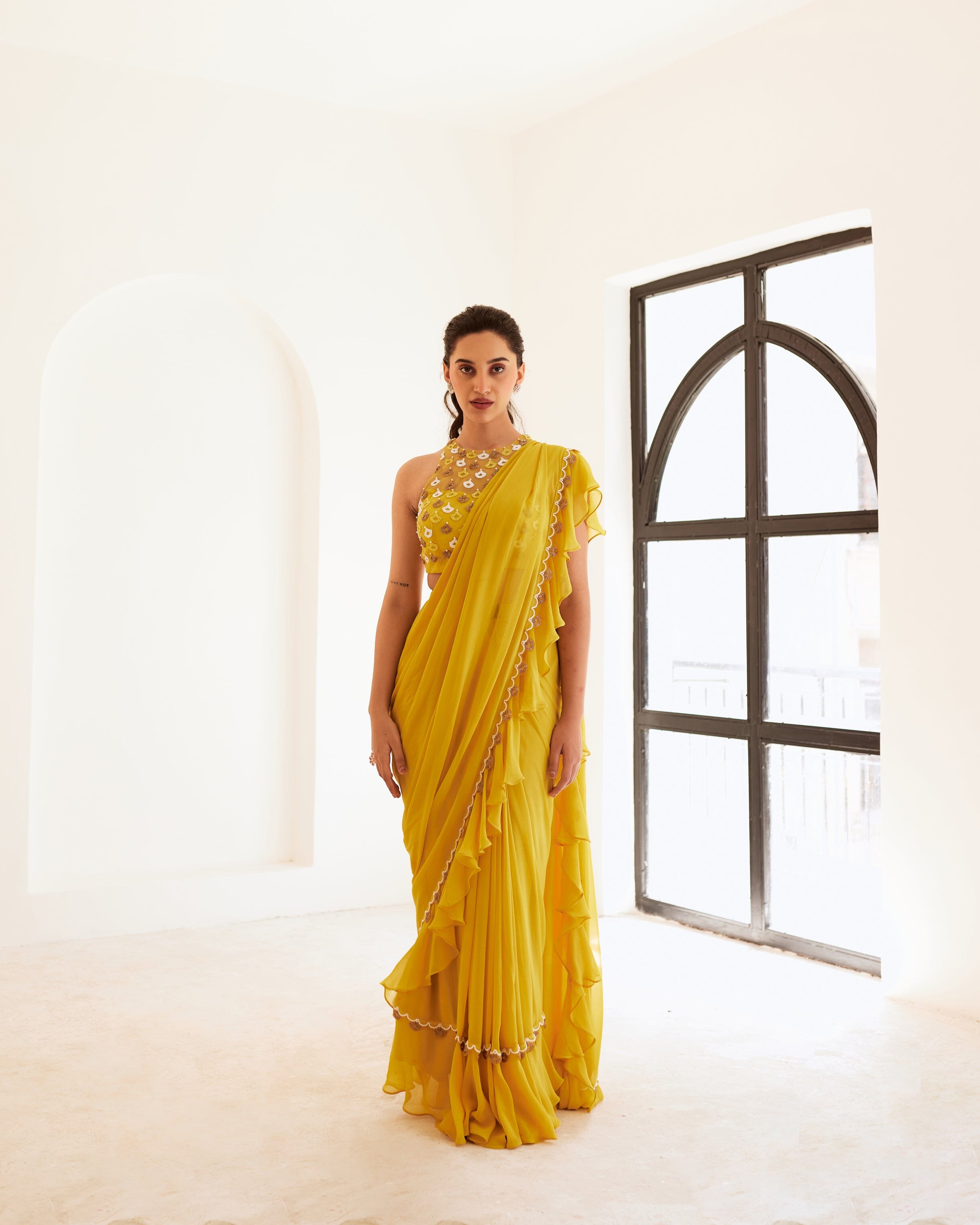 Blusa de red amarilla combinada con un sari amarillo con volantes drapeados y un borde bordado a mano en el medio.