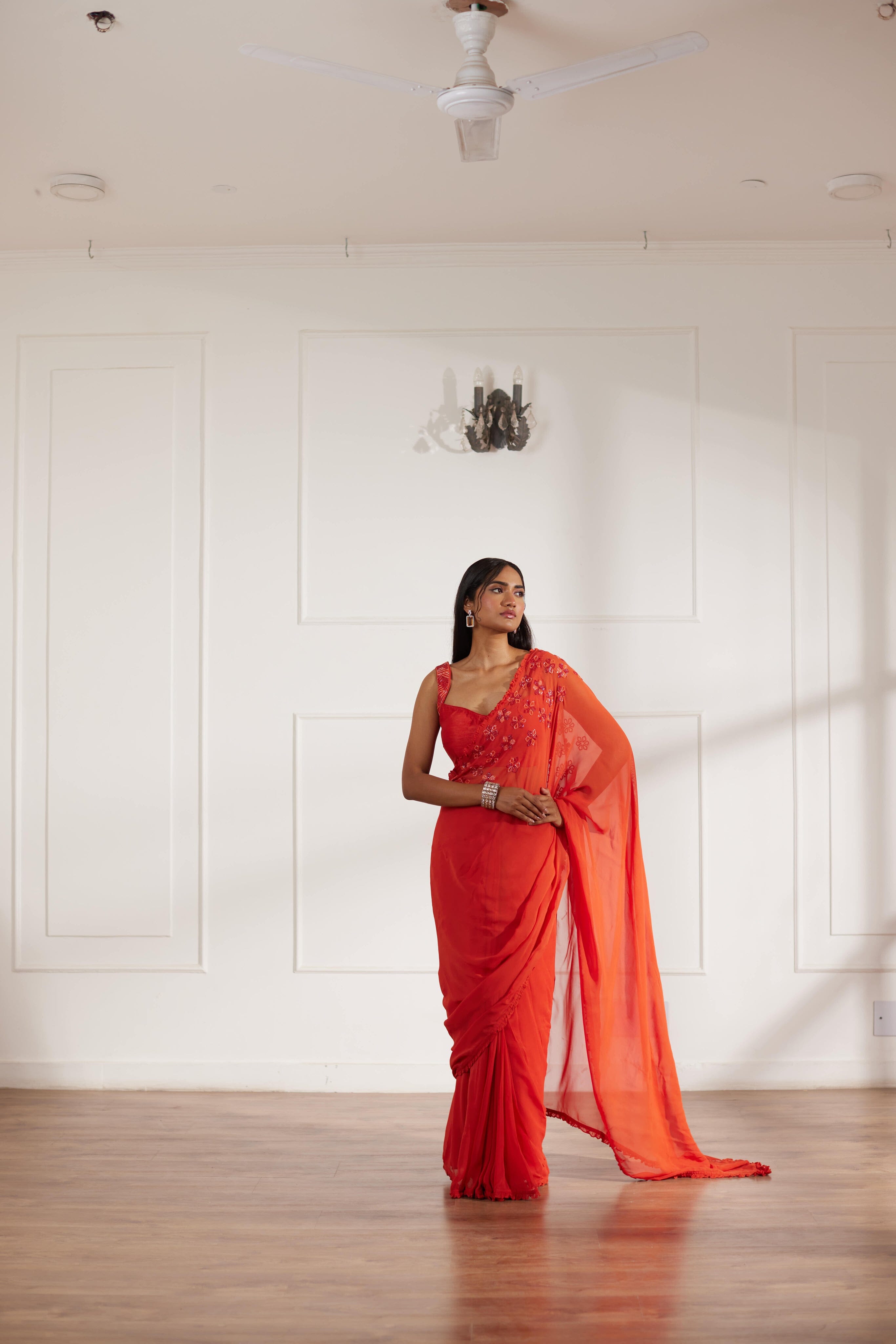 Sari drapeado color óxido con blusa color óxido