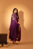 A purple outfit with hand embroidery all over, including on the pants and scallop dupatta. A Purple hand embroidered anarkali set with pants and duptta.