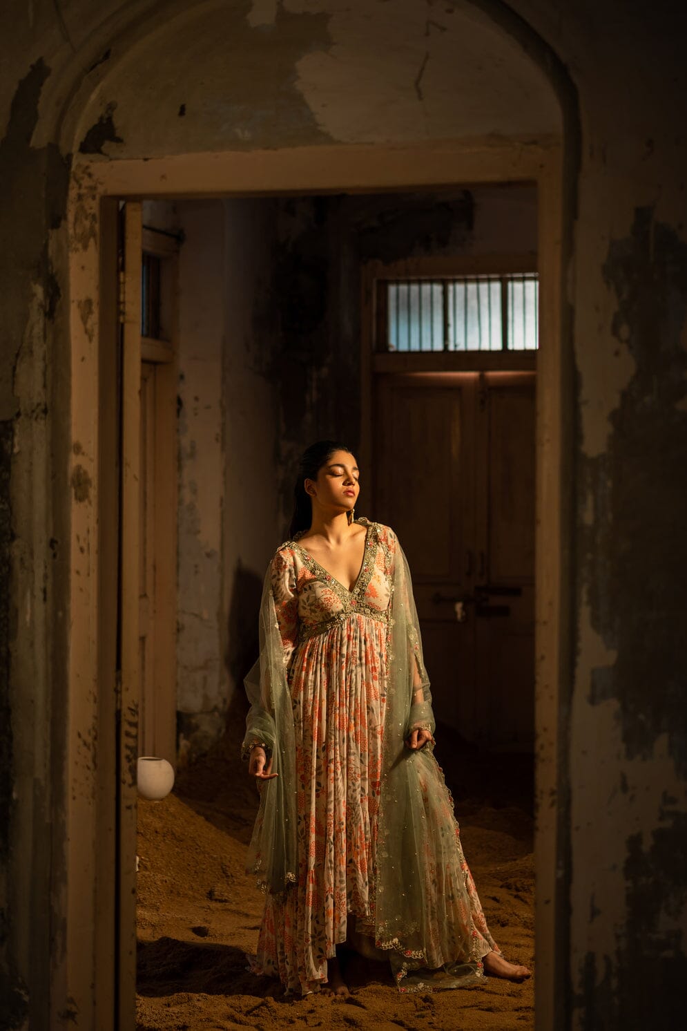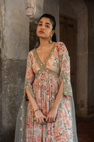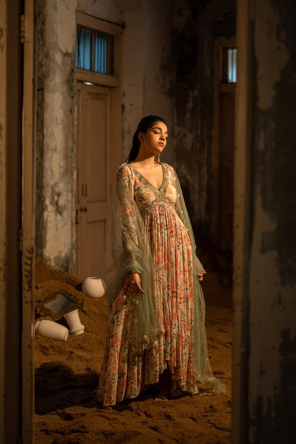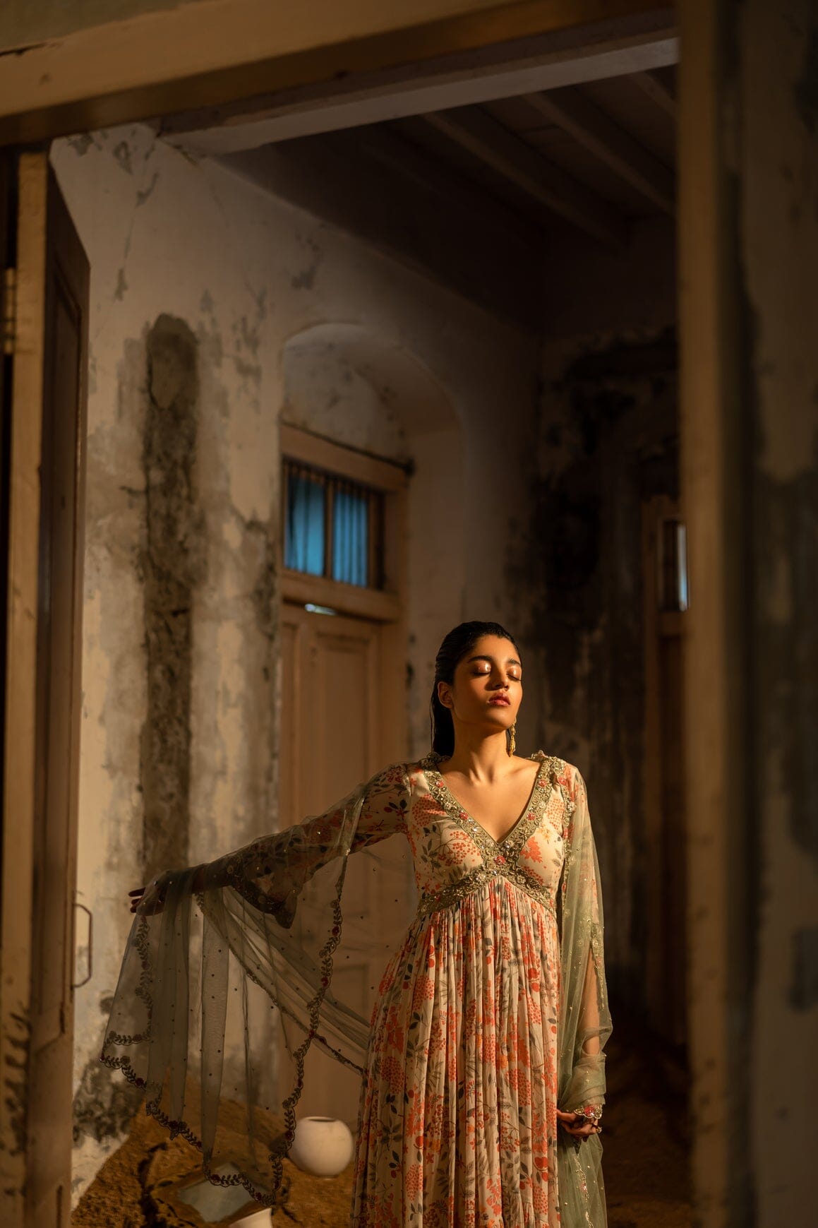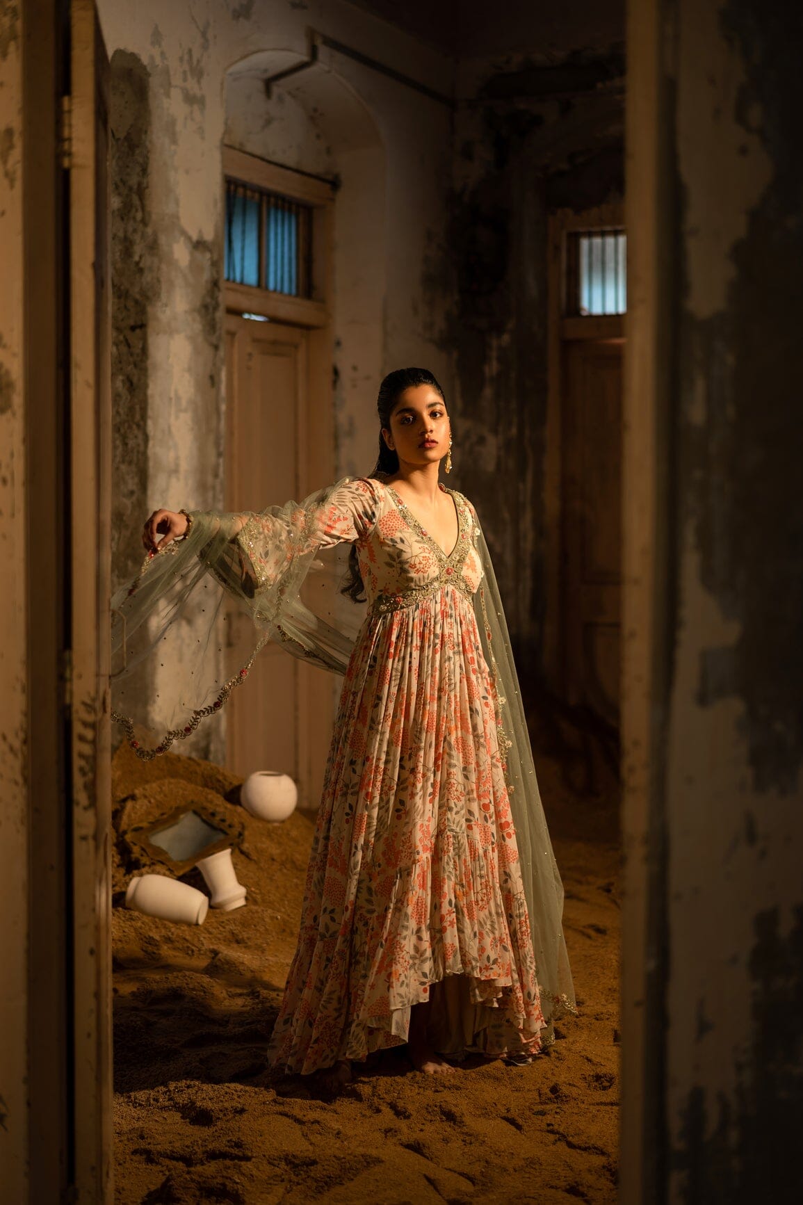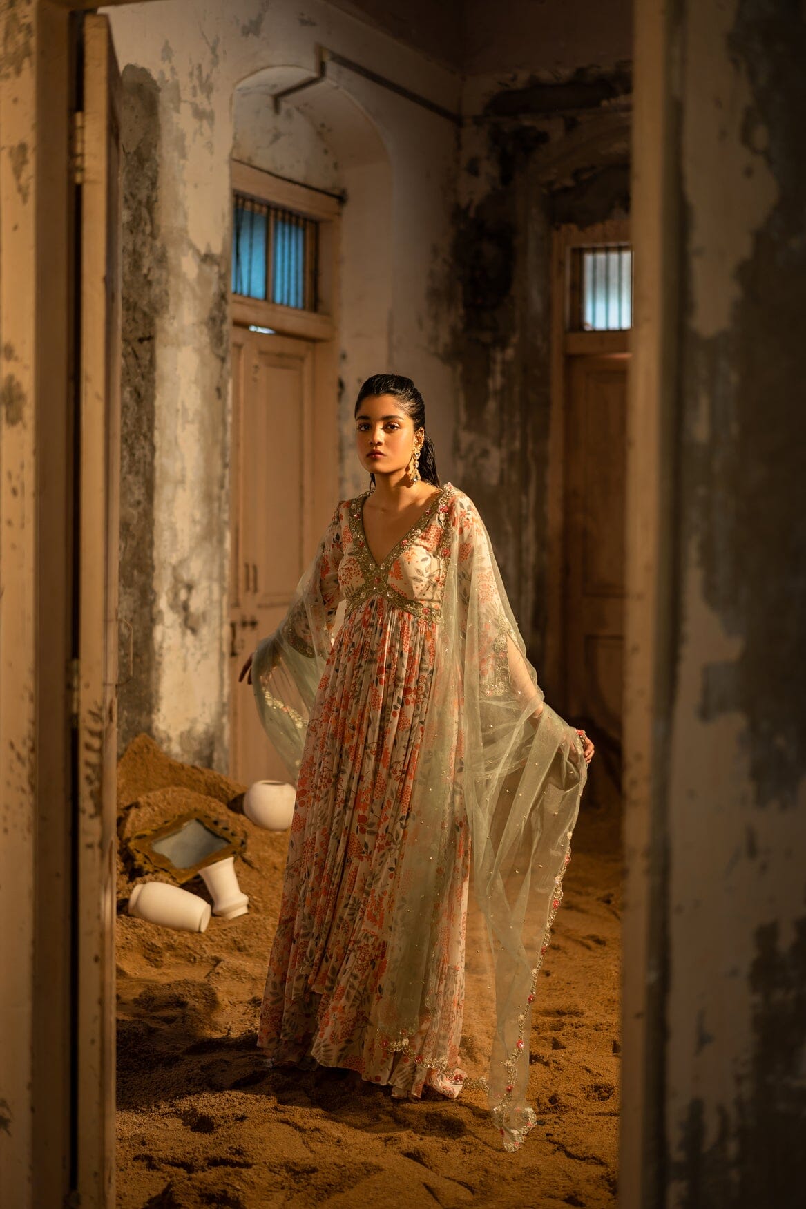 A floral printed anarkali dress with an asymmetric v-neck and a deep keyhole back that has a tie-up dori and heavy latkan. It is adorned with sequins, pearls, cut Dana beads, and intricate ari work. The dress comes with a matching hand-embroidered scalloped dupatta. A ivory printed hand embroidered anarkali with duptta.