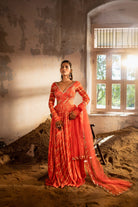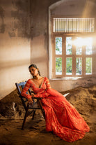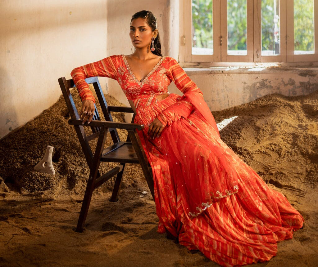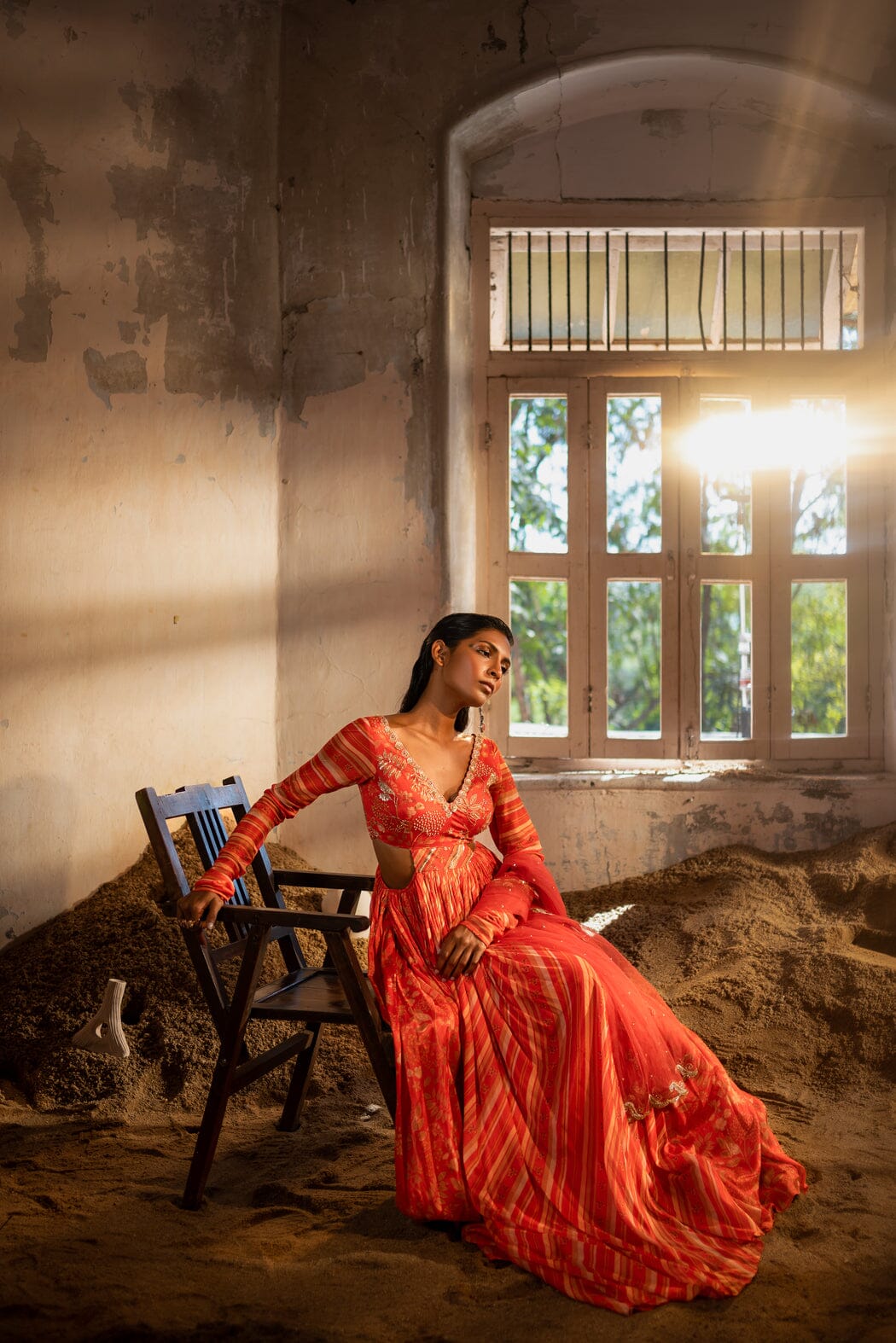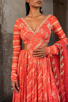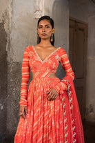 a tomato red floral and leheriya print anarkali dress with a side cut, hand embroidered details. It also comes with a scallop net dupatta. A red side cut anarkali and duptta.