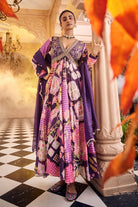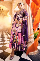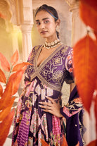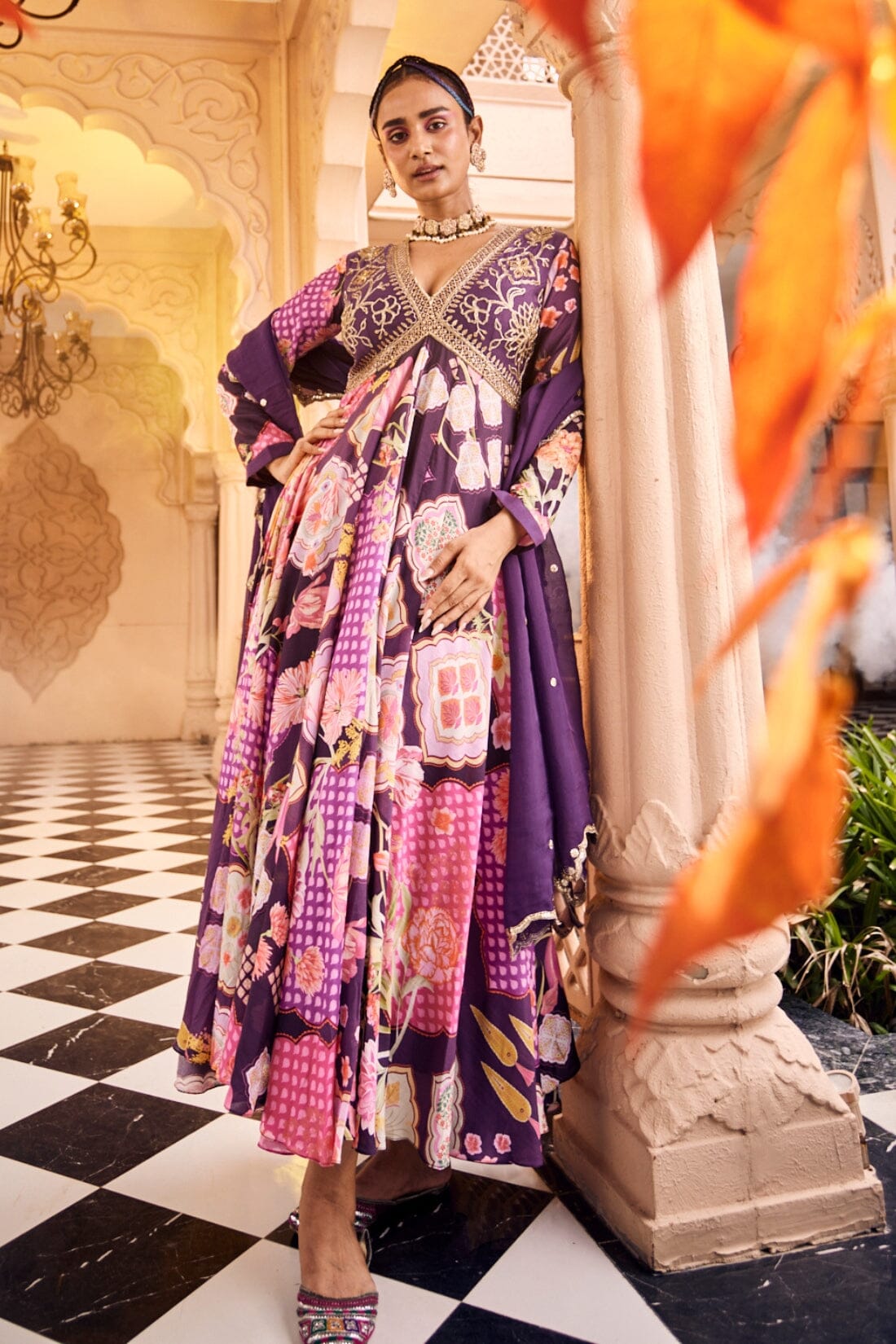 A purple multi print v neck anarkali set complete with heavy embroidery on yoke, paired with embroidered scalloped dupatta.