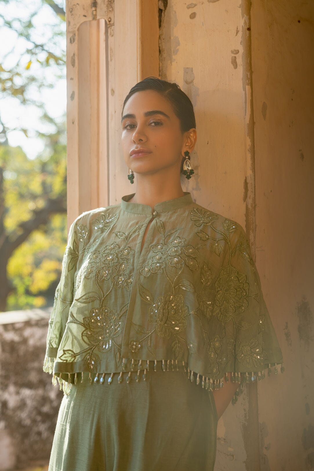 A pista green cape with thread work and hand embroidery, paired with pants that also have embroidery and side slits. The outfit is completed with a matching bustier top. A pista green cape with side cut pant and bustier