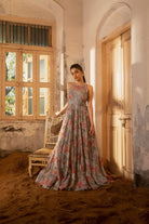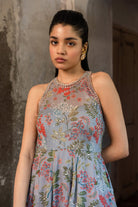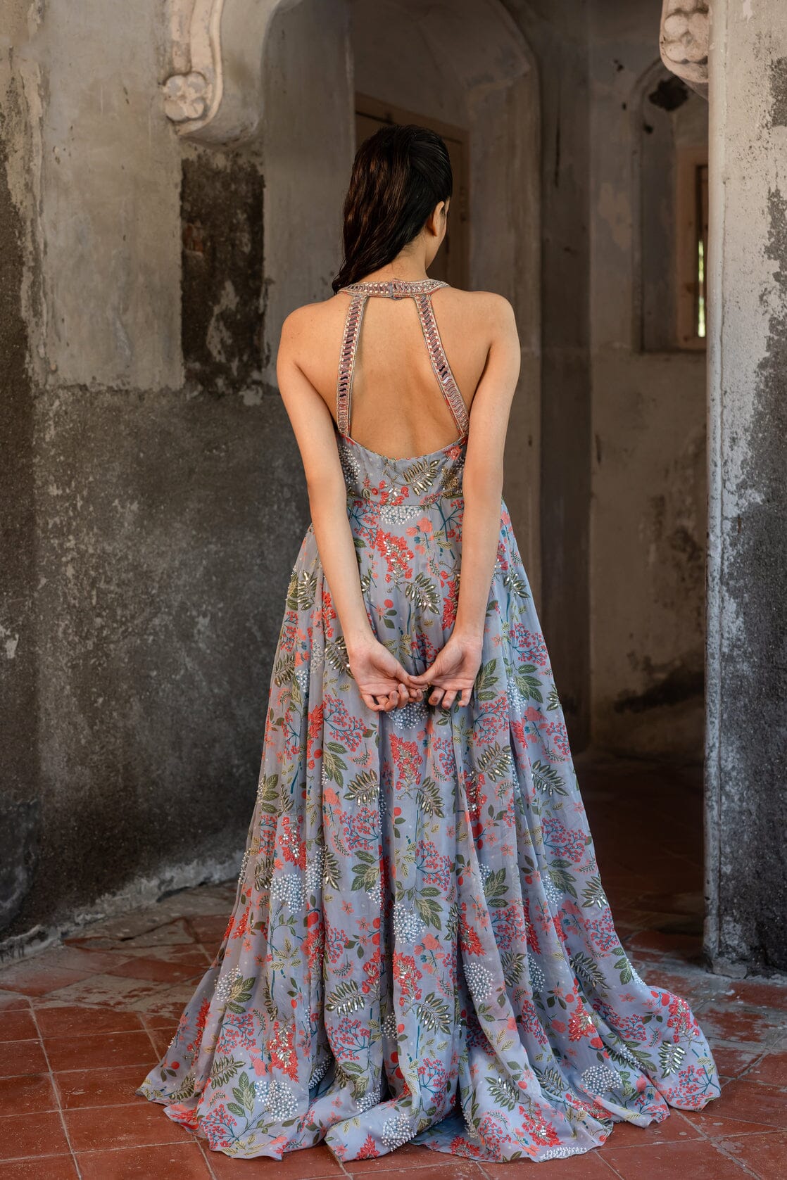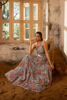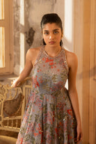 A sleeveless lavender grey gown with floral print and hand embroidery details. Lavender grey hand embroidered gown.