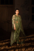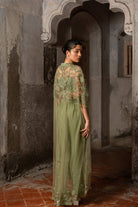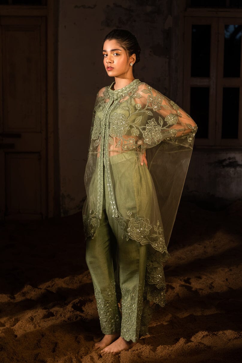 A long cape, bustier, and pants, all hand-embroidered in a pista green color. A long cape paired with bustier and pants.