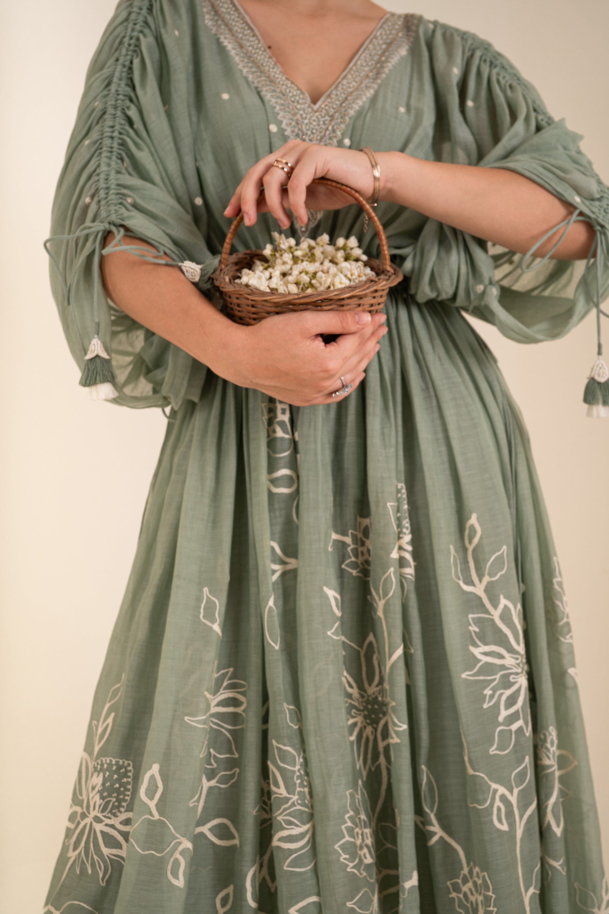 An ocean blue tie up kaftan with beautiful tassels detailing and comes with an inner. Kaftan is embellished with aari work and hand highlighted.