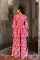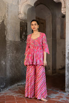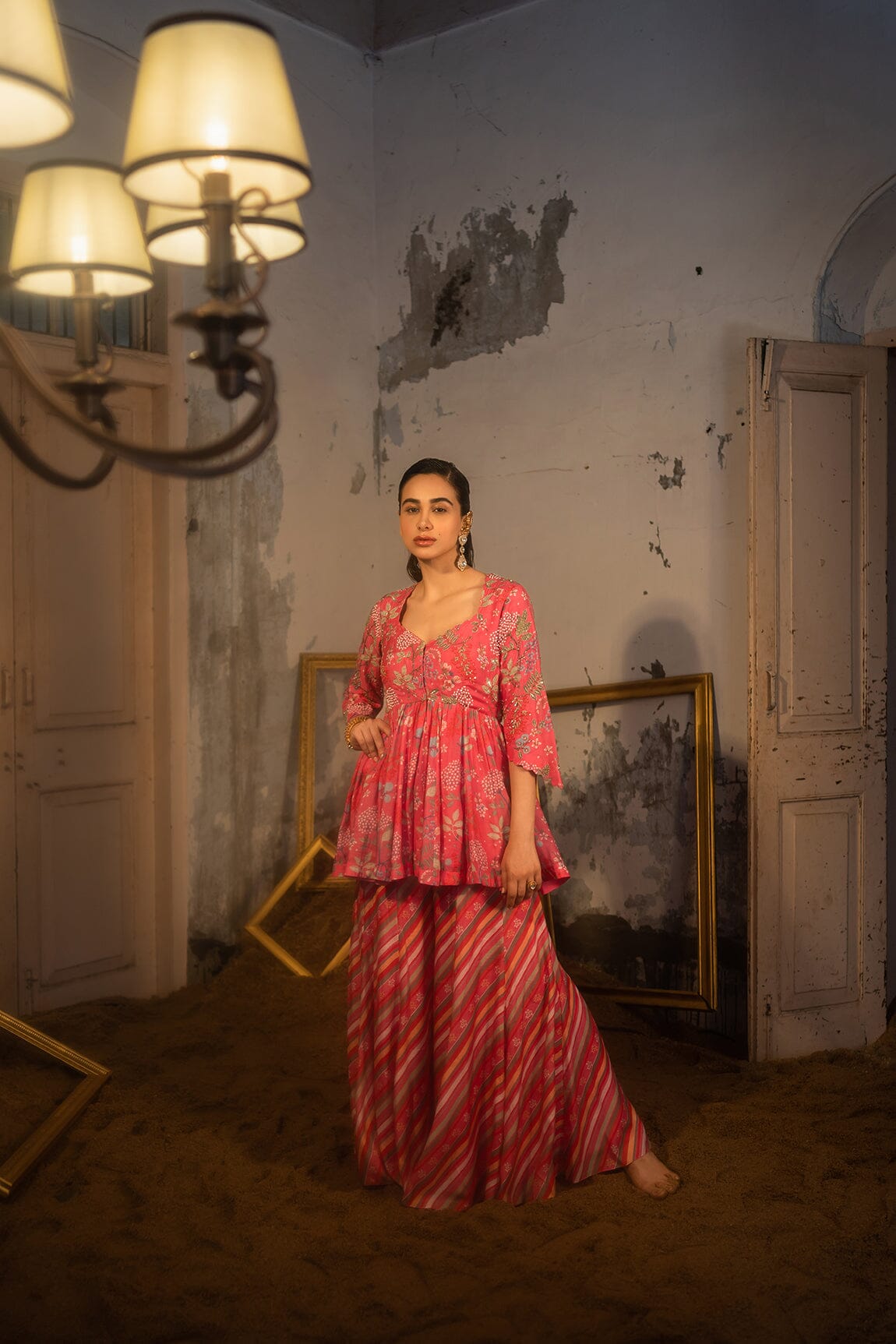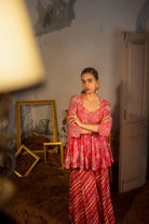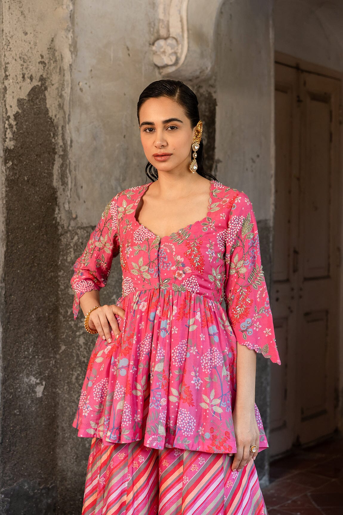 A hot pink botanical jungle print outfit with a sweet heart neckline and peplum top, decorated with hand embroidery. It comes with matching striped palazzo pants. A sweet heart neckline peplum with plazzo pants.