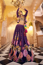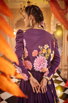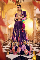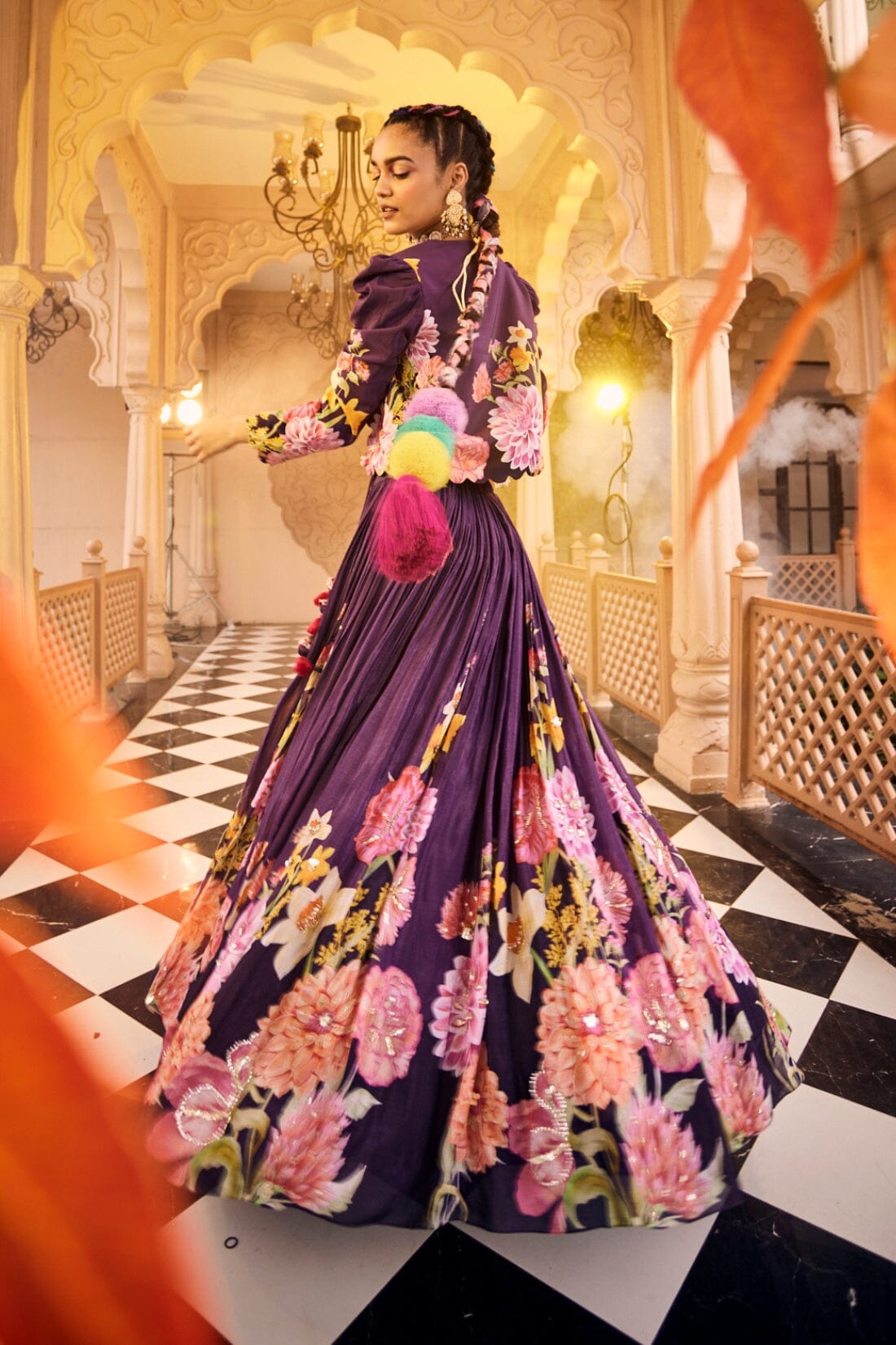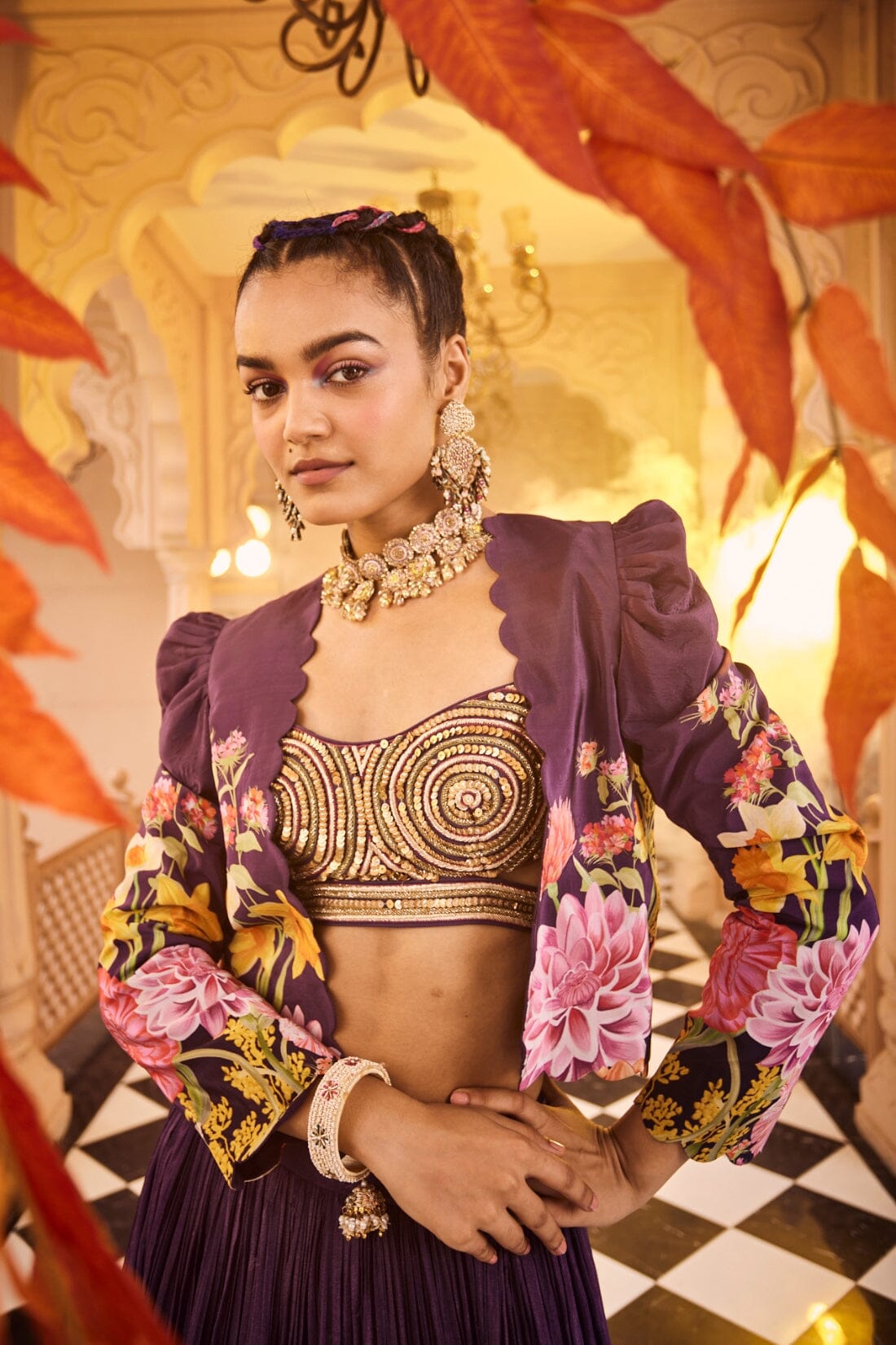 A purple floral printed embroidered lehenga set combined with heavy embroidered blouse and printed jacket.
