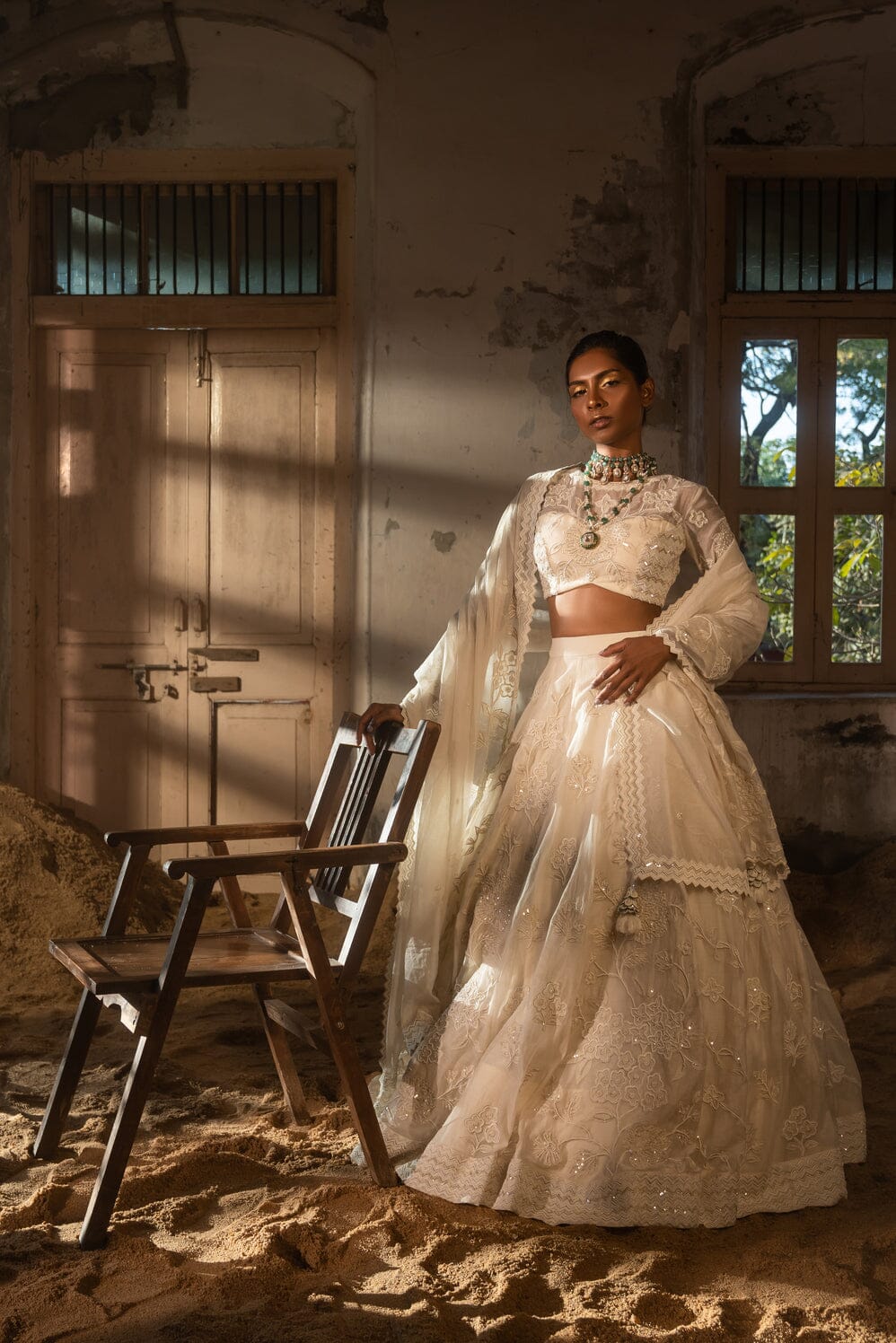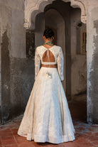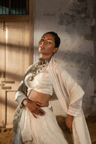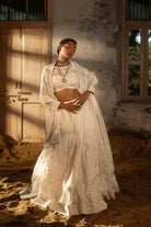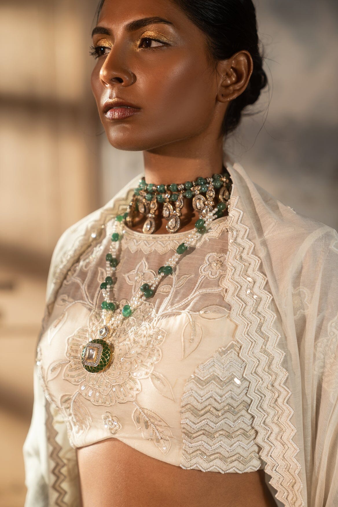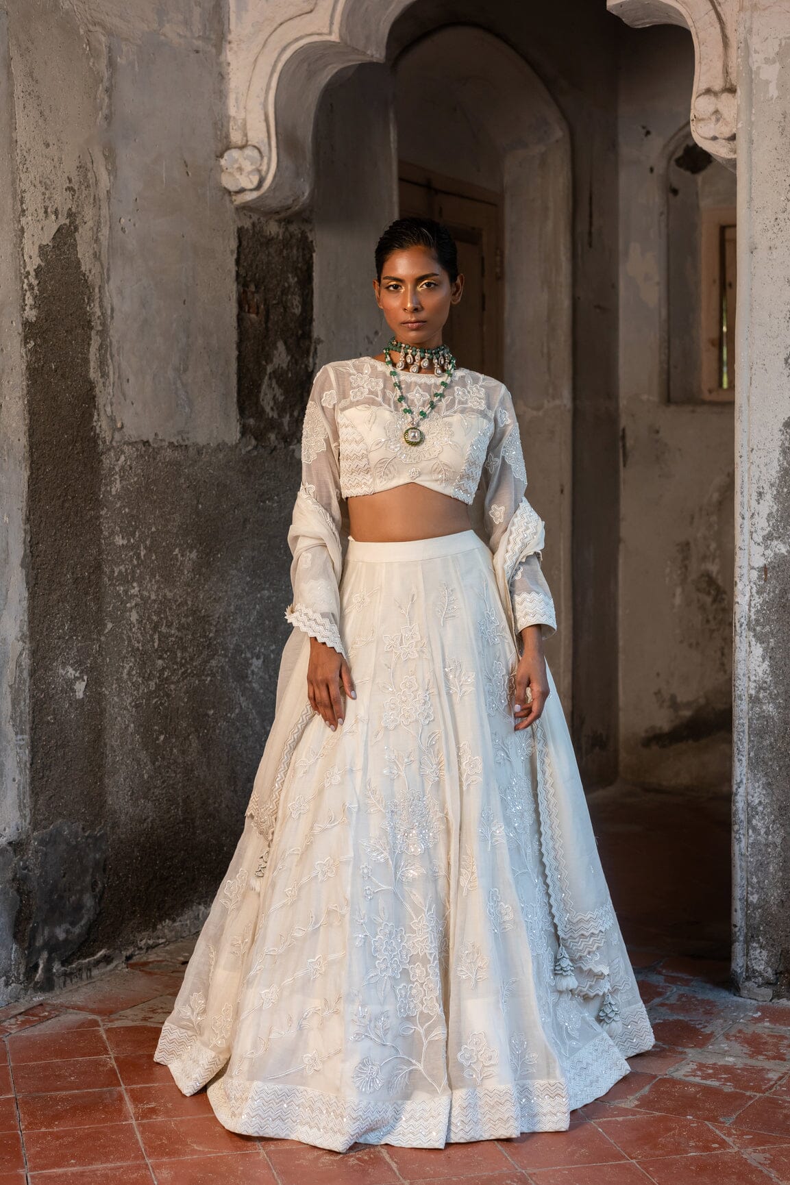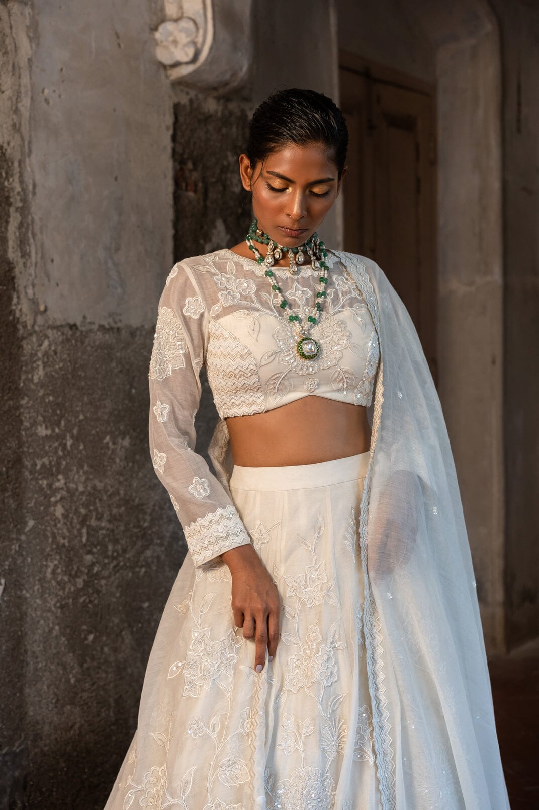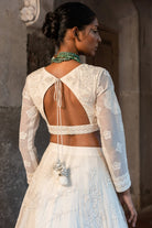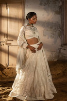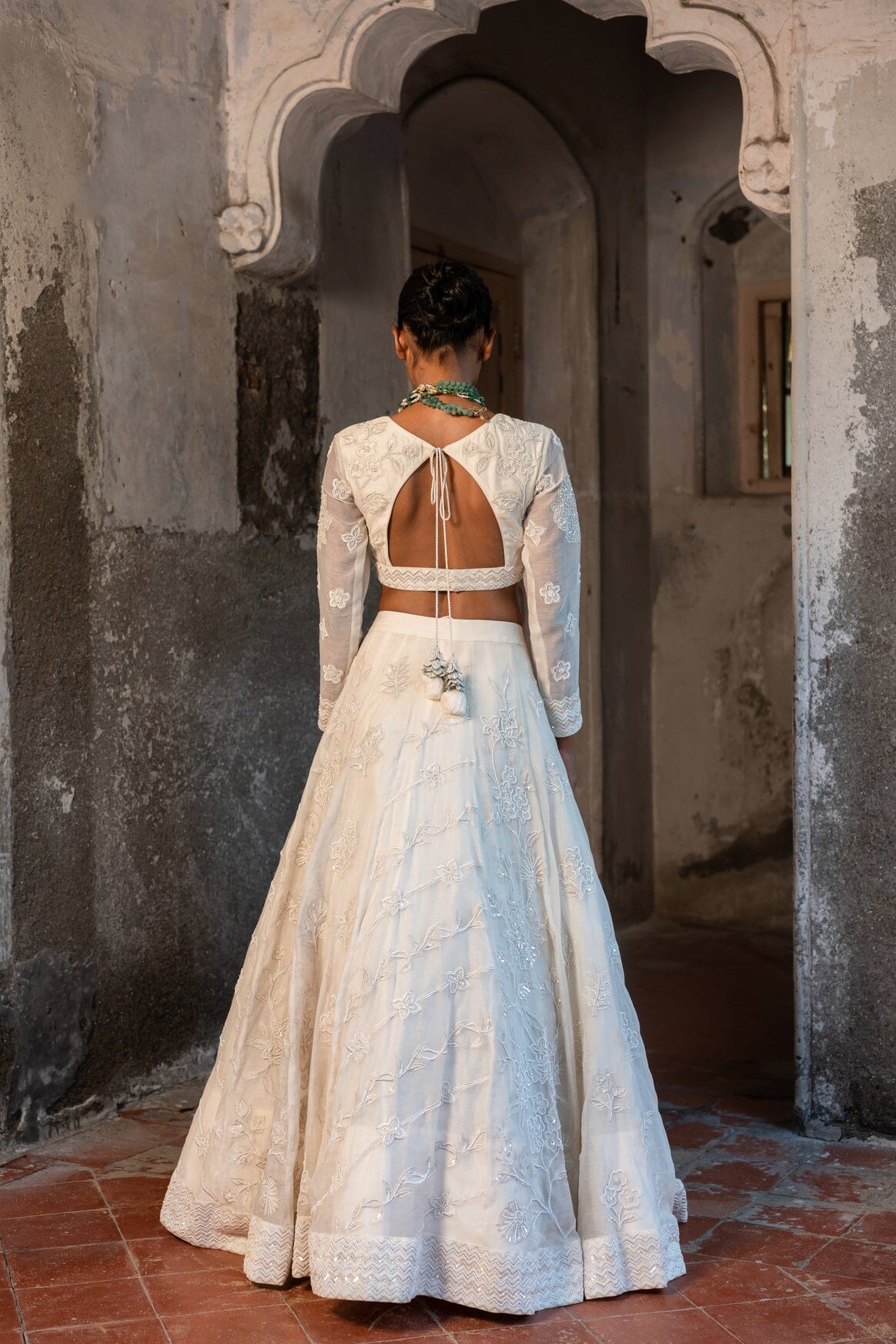 This lehenga set features heavy thread work with sequins and pearls. The set includes an embroidered lehenga, a back open blouse with decorative tassels, and a matching embroidered scalloped dupatta. A hand embroidered lehenga set paired with blouse and duptta.