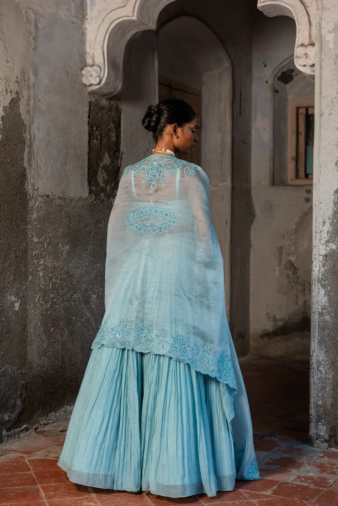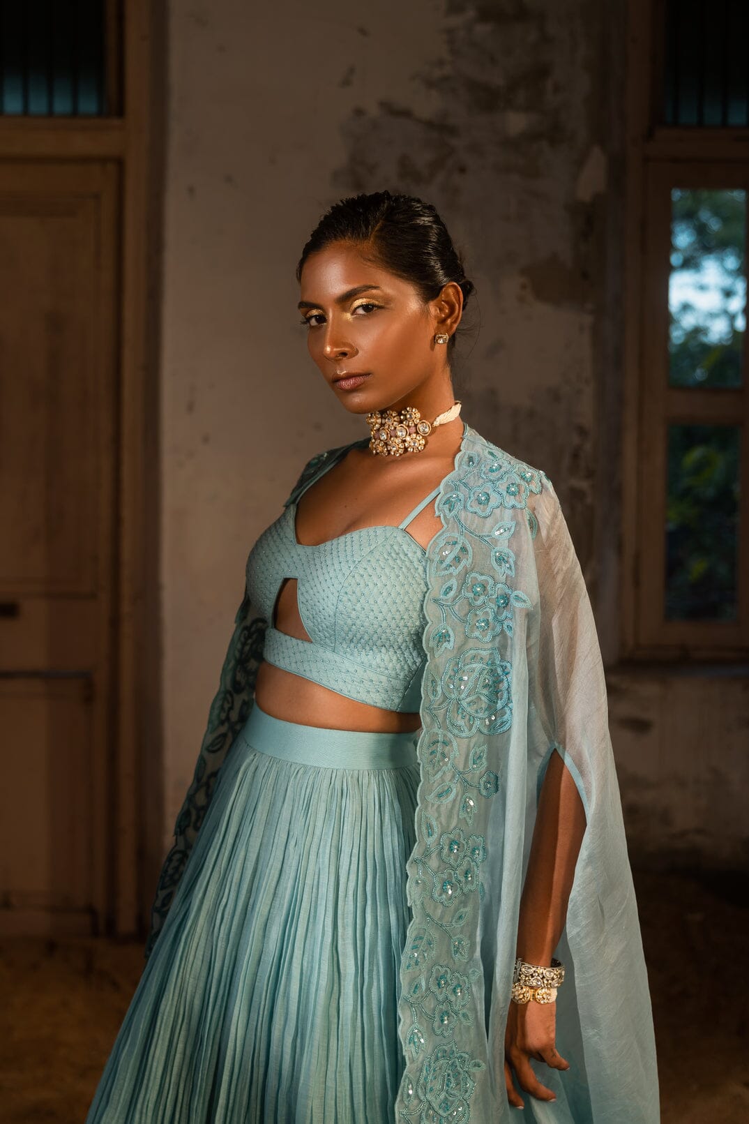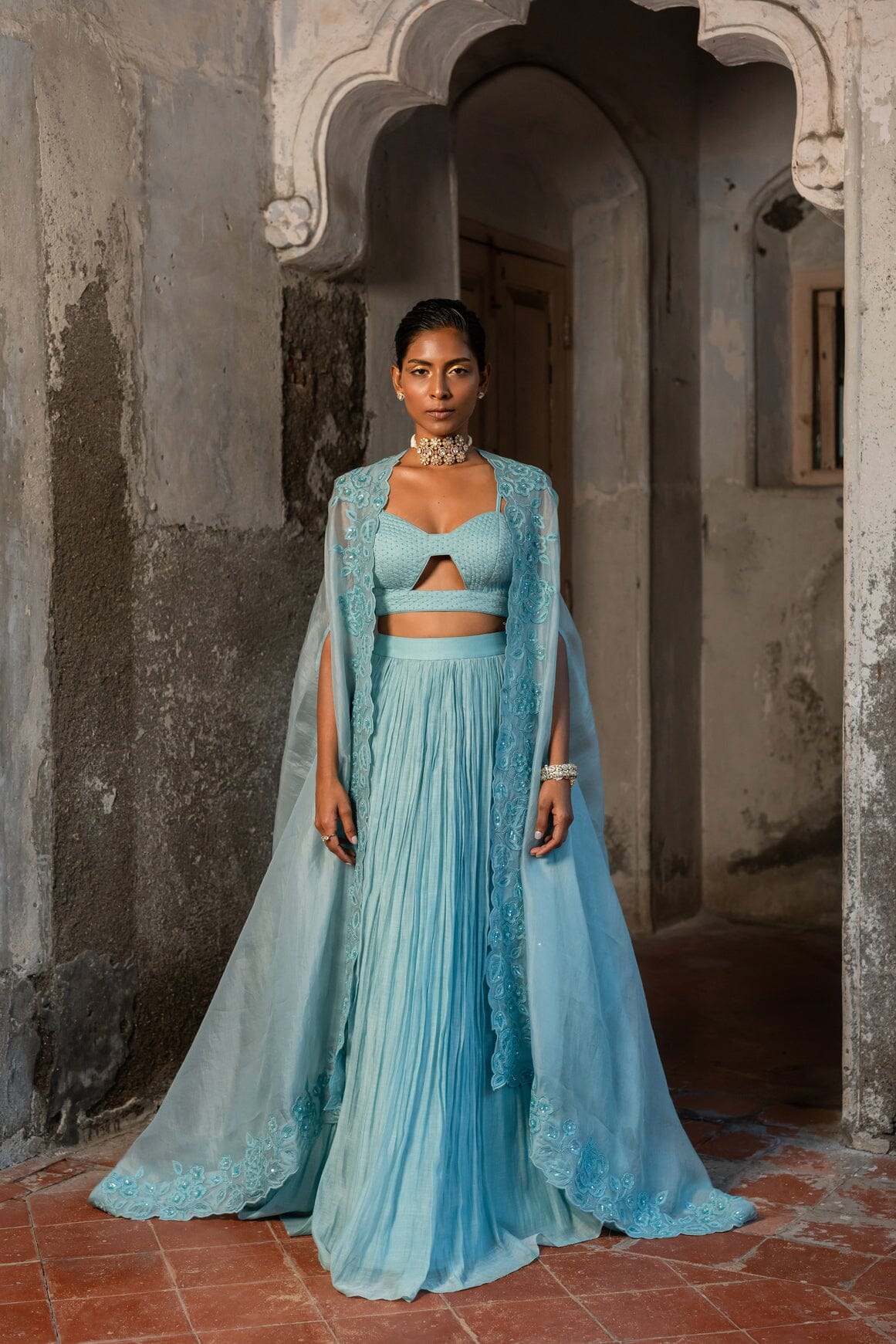 A powder blue outfit with a cape that is hand-embroidered, worn with a matching blouse. A pwder blue lehenga with maching blouse and cape.