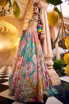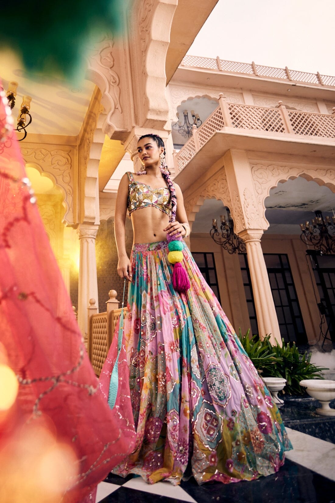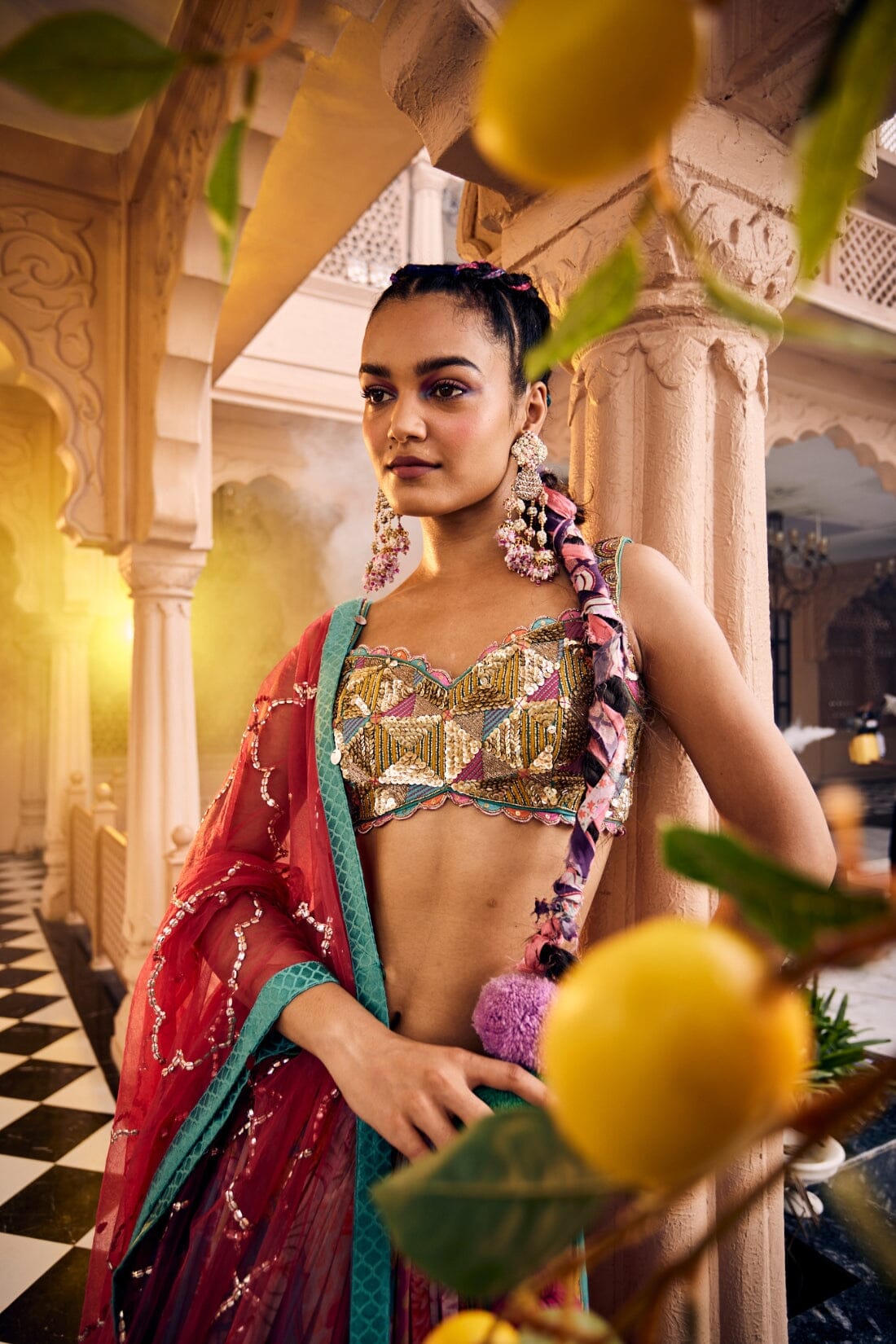 This ensemble features a heavy embroidered lehenga and geometric 3D embroidered blouse with net duptta embellished with heavy latkan.