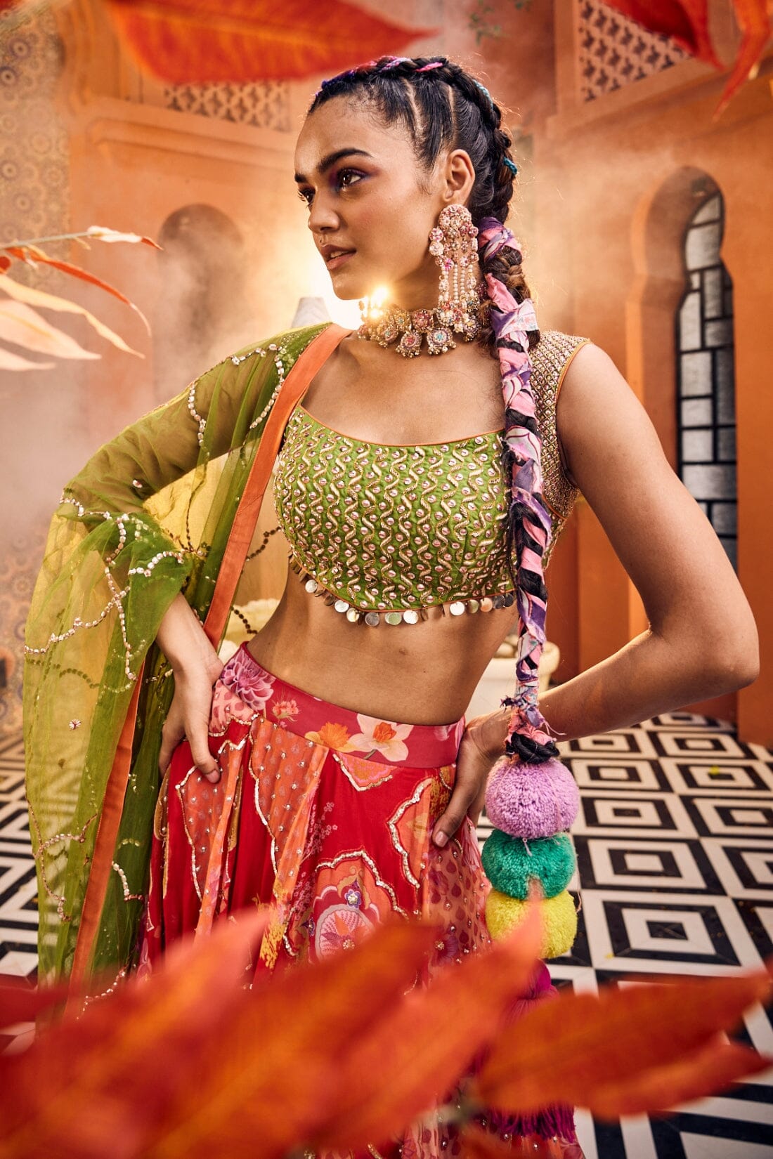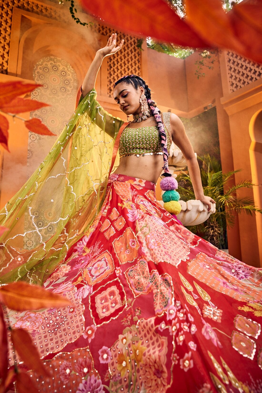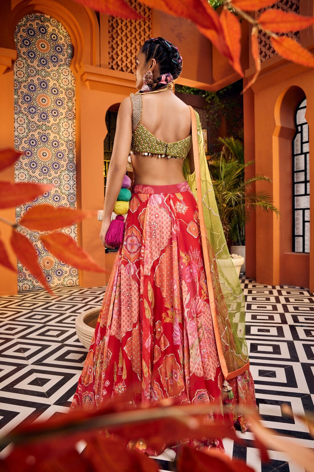 Stunning red multi-printed heavy embroidered lehenga set, complete with a contrasting green embroidered blouse and dupatta.