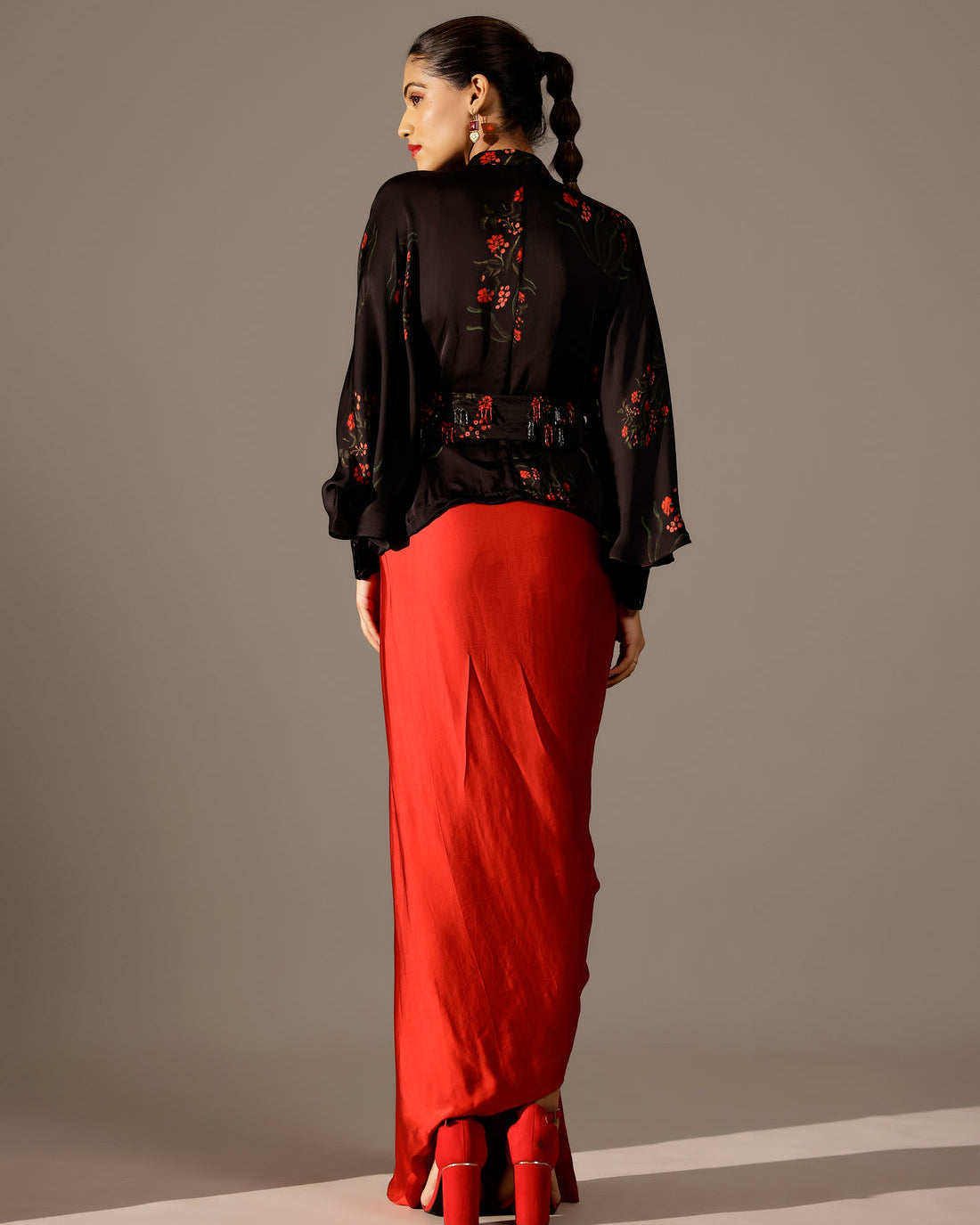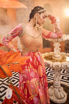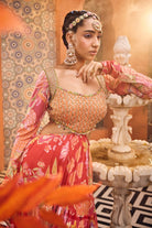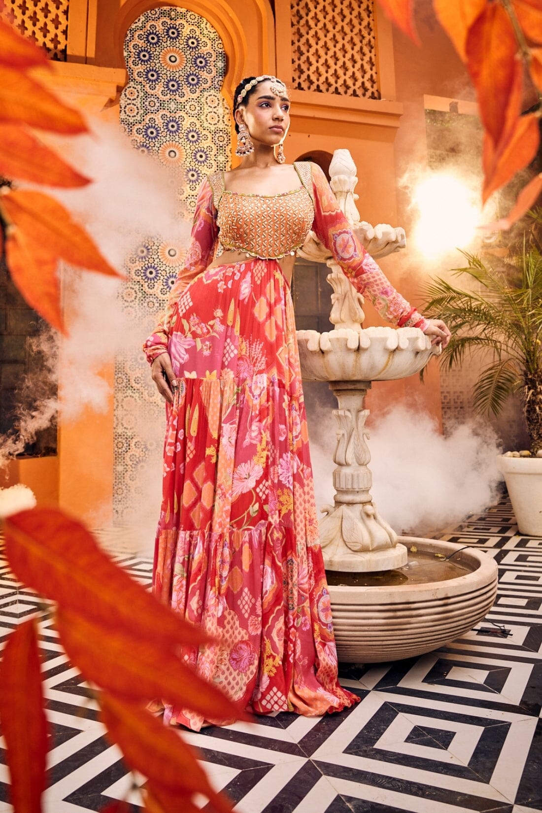 Red multi-print layered side-cut Anarkali dress, adorned with intricate embroidery on the yoke. Complete the look with a contrasting green scalloped dupatta.