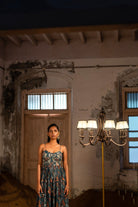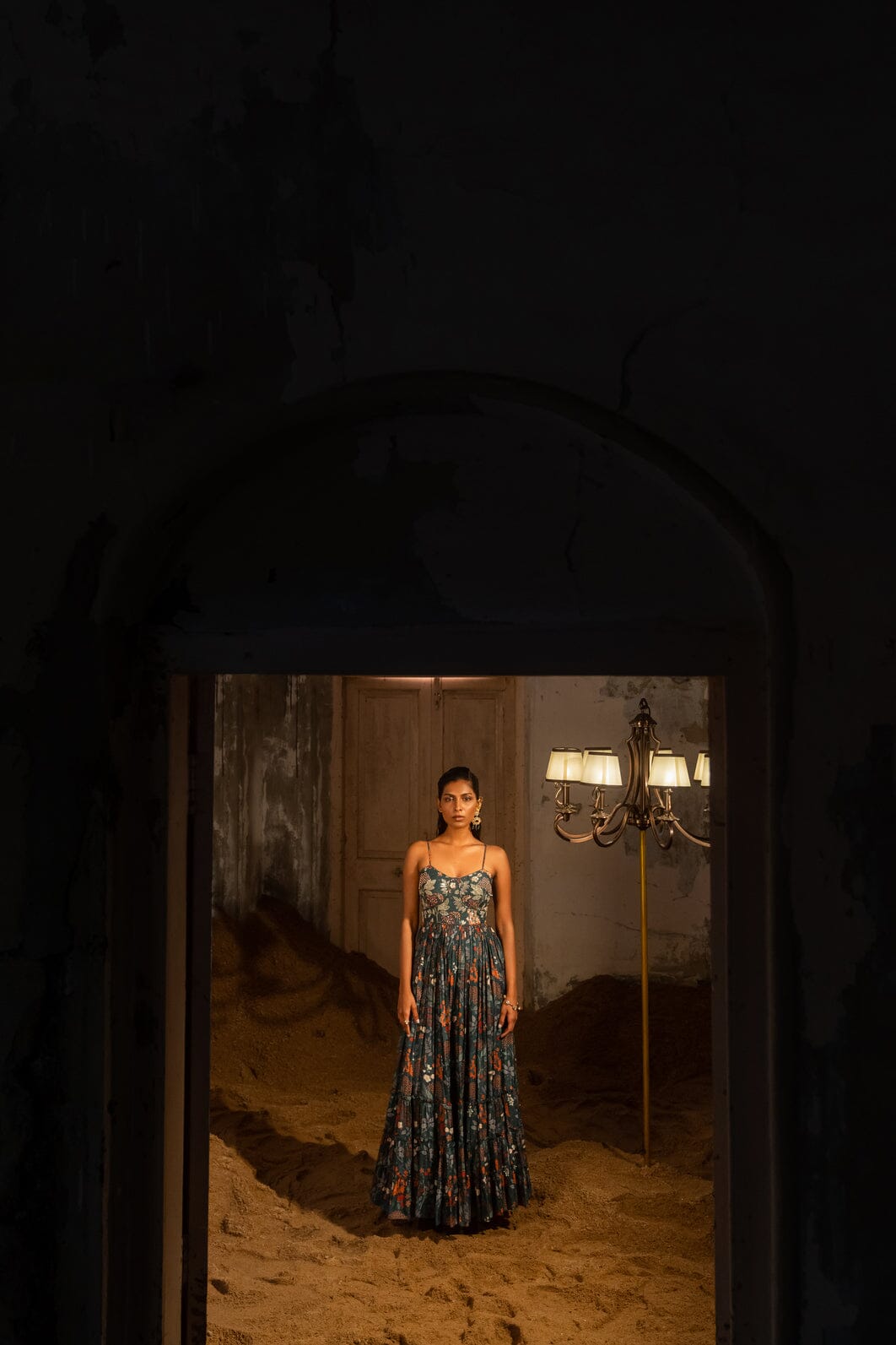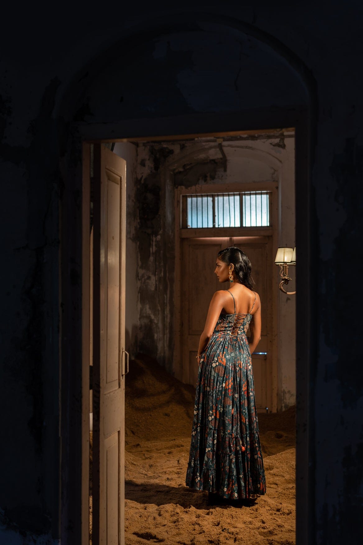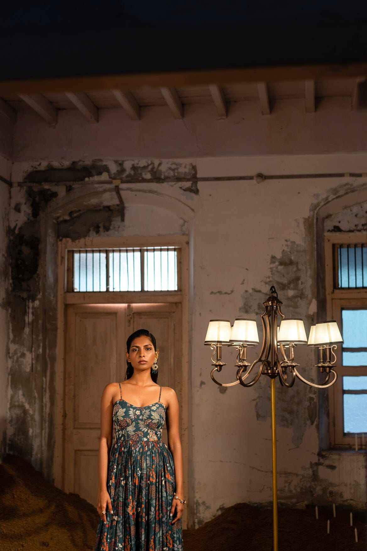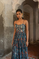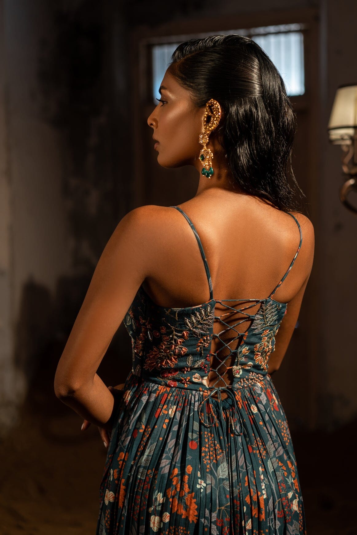 A teal blue maxi dress with printed layers, hand embroidery, and an open back with a tie-up drawstring. A printed teal blue maxi dress.