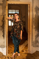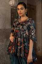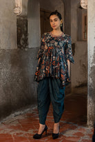 A teal blue floral printed set with hand-embroidery, in an A-line peplum style. It comes with dhoti pants. A printed peplum paired with dhoti pants.