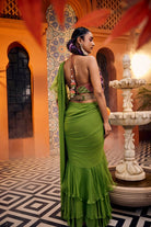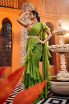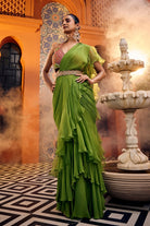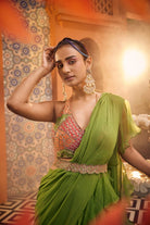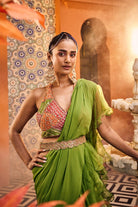 Multi-colored embroidered blouse paired with a flowing georgette saree adorned with organza silk frills. This ensemble is finished off with a scallop embroidered belt.
