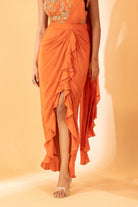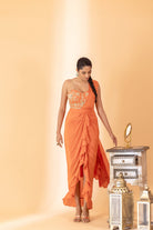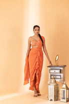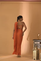 A pre-draped rust-colored saree with a hand-embroidered blouse. A rust pre-draped saree with hand embroidered blouse