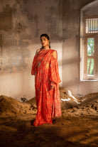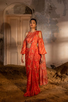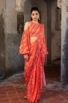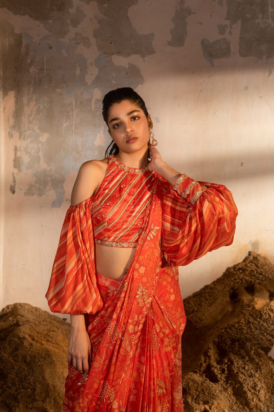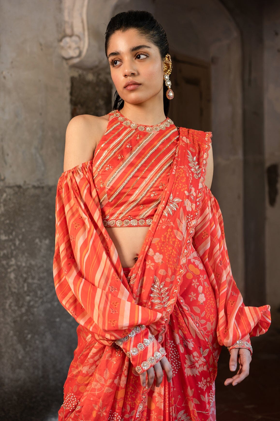 A red floral print pre-draped saree with embroidery, paired with a leheriya print blouse featuring long balloon sleeves. A pre-draped saree set with a hand-embroidered blouse