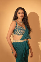 A teal green pre-draped saree with a flare at the bottom, paired with a hand-embroidered blouse and styled with a matching hand-embroidered belt. A pre-draped saree set paired with hand embroidered blouse and belt