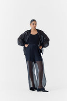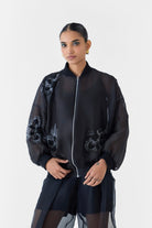 The Ajisai Organza Bomber crafted from our stunning Organza fabrication, trans-seasonal, is a statement piece. The piece, made in our hand dyed organza, is hand embroidered with ajisai (hydrangea) flowers with beads and thread. With a metallic zipper and ribbed collar, cuff and hem, the bomber is boxy fit. Paired with our black organza trousers, the jacket can be styled in different ways. It comes with a black crepe slip. Wear it with heels for an elegant look.