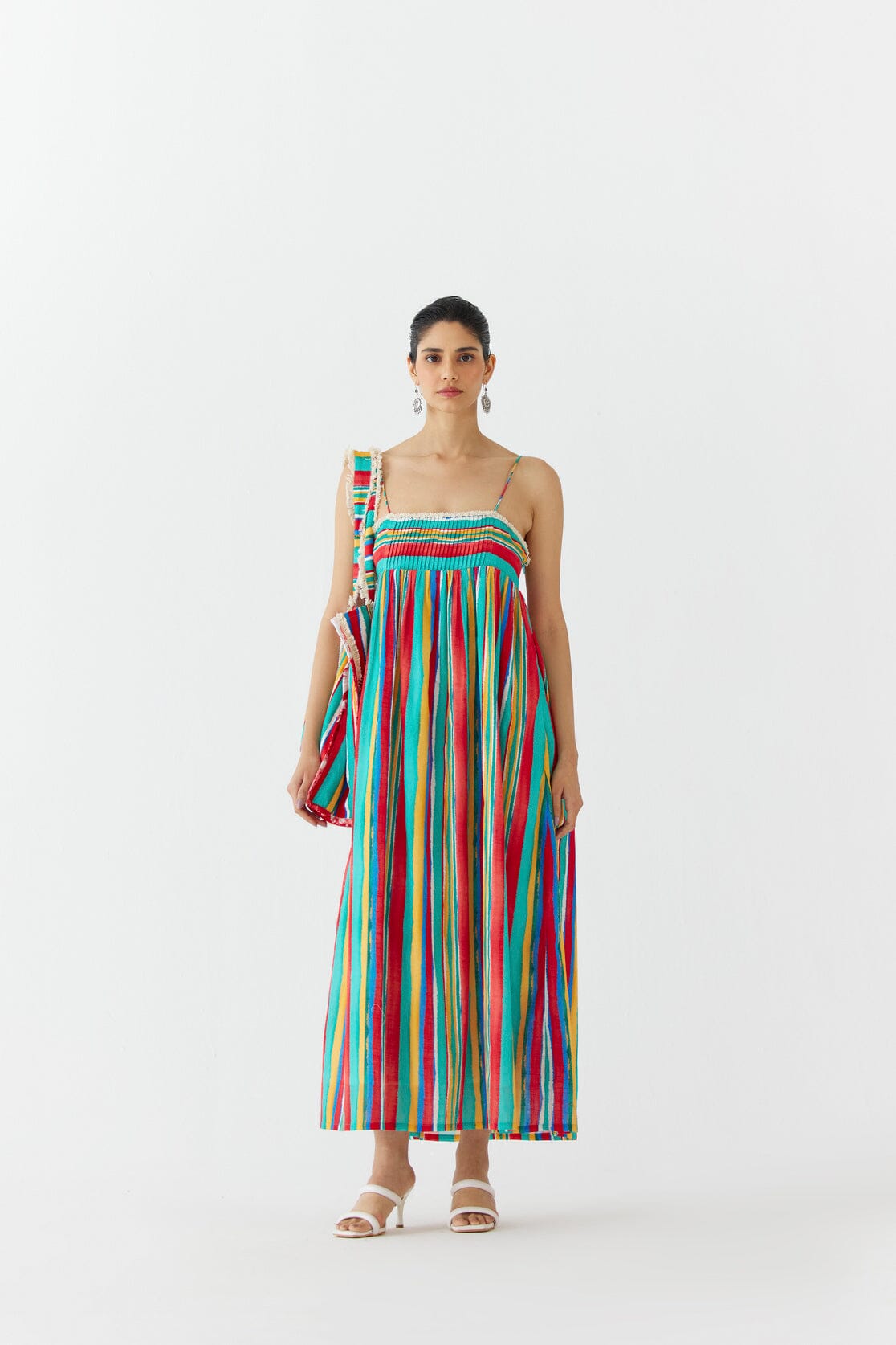 The Birch Strappy Dress crafted from our 100% cotton fabrication, trans-seasonal, is a statement piece. The dress, made in our multi stripe painted Birch print, is lined. With pintucked yoke, the dress has a relaxed fit and straps. Featuring a summery look, it has pintucks on the back as well. Wear it with heels for an elegant look.