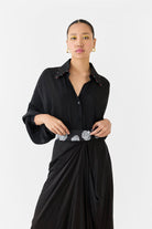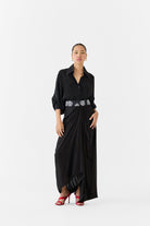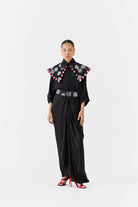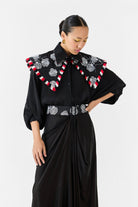 The Black Tulip Batwing Shirt & Skirt co-ord crafted from our stunning Vegan Silk & crepe fabrication, trans-seasonal, is a statement piece. The shirt, made in our hand dyed crepe has a wide collar with contrast beads. It has a batwing fit. The draped skirt in vegan silk, hand embroidered with thread, has a side zipper and a knot. It is paired with our matching detachable black tulip collar with embroidery and fringe. Wear it with heels for an elegant look.