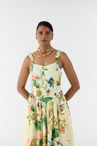 The Blossom Sweetheart Dress crafted from our stunning 100% cotton slub fabrication, trans-seasonal, is a statement piece. This piece, in our renaissance florals and english jewels, has a fitted bodice and a flowy skirt. With hand embroidered details of beads and thread, the dress is lined. It has a sweetheart neckline and a side zipper. The back is ruched for a comfortable fit. Wear it with heels for an elegant look.