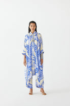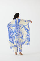 The Blue Aphrodite Kimono & Pants Co-ord crafted from our stunning vegan silk fabrication , trans-seasonal, is a statement piece. The co-ord, made in our hand drawn Aphrodite print, has a relaxed fit. With kimono sleeves , the piece has a front shell buttons and fringe details. Featuring a summery look, it is paired with our Blue Aphrodite trousers with a waistband and pockets. Wear it with heels for an elegant look.