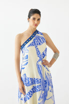 The Blue Aphrodite One Shoulder Kurta & Pants Co-ord crafted from our stunning vegan silk fabrication , trans-seasonal, is a statement piece. The co-ord, made in our hand drawn Aphrodite print, has a relaxed fit. With one sleeve, the piece has hand embroidered fringe and sequin lace. Featuring a summery look, it is paired with hand dyed blue flared trousers with a waistband and pockets. Wear it with heels for an elegant look