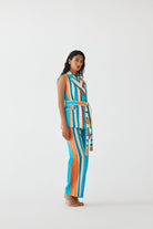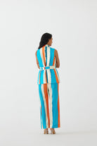The Blue Birch Blazer & Shorts crafted from our 100% cotton fabrication, trans-seasonal, is a statement piece. The sleeveless blazer, made in our multi stripe Birch print, is lined. With broad lapel, the piece has a relaxed fit and is part of a two piece set. Featuring a summery look, it is paired with our Birch trousers with pockets. It also has a belt with fringes. Wear it with heels for an elegant look.