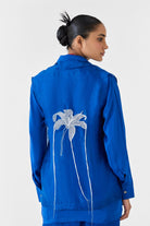 The Indigo Shirt & Trousers co-ord crafted from our stunning crepe fabrication, trans-seasonal, is a statement piece. The shirt, made in our hand dyed crepe has a collar and knots to drape the shirt. It has a relaxed fit. The trousers have an elasticated waist. It can be paired with our matching indigo organza jacket which is hand embroidered with thread. Wear it with heels for an elegant look.